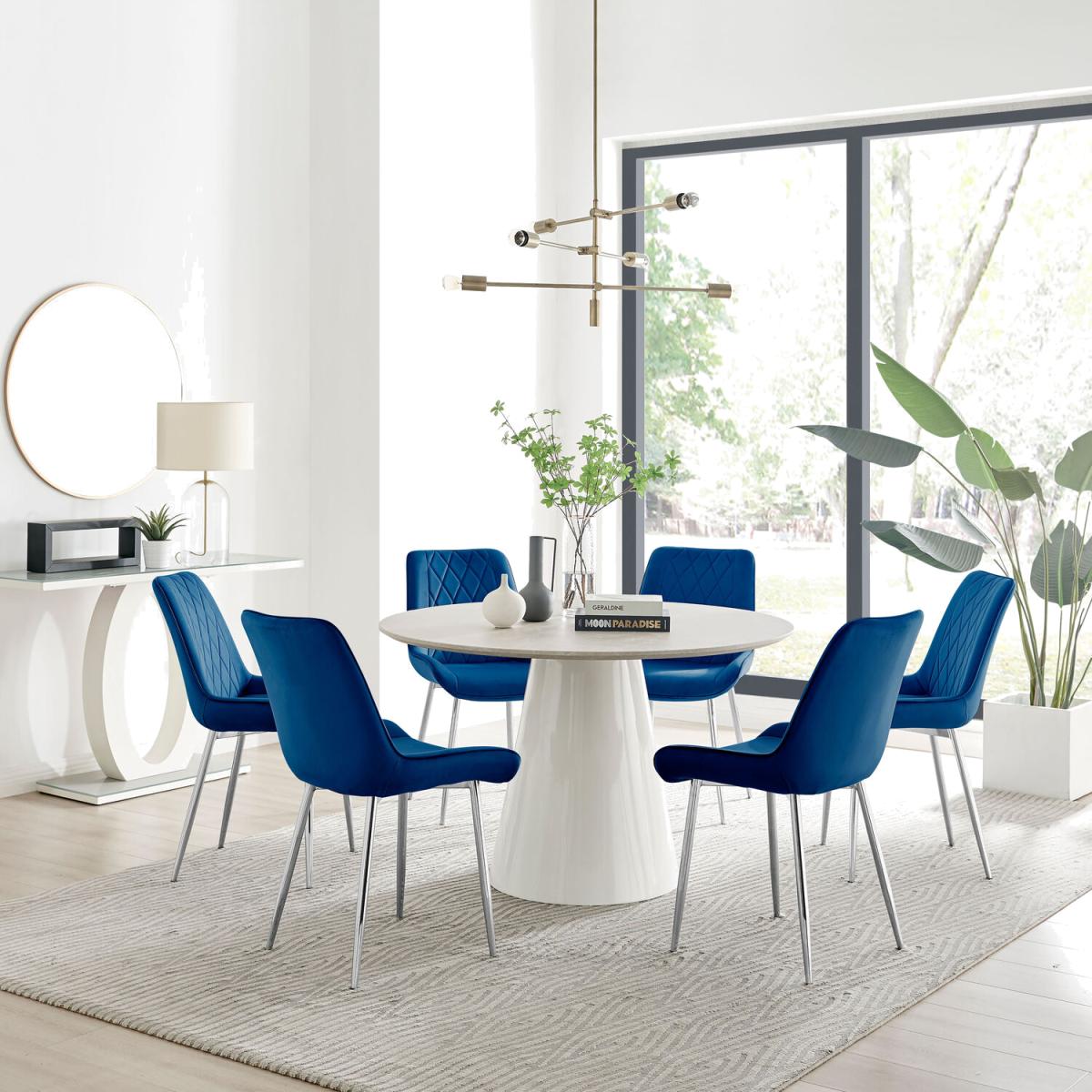 Our stunning Palma table with the stone-effect finish is a round dining table with a large statement tapered central pillar. It's a minimalist post-modern dream! The perfect balance of round and straight lines an uncluttered and elegant dining table solution that will be a real talking point in any modern dining room. The beige stone-effect top is very in right now, and is a firm favourite here at Furniturebox UK HQ. Elegant and modern with a touch of that classical chic style. Pair with some bold colours and metallic bursts in your chairs accessories to really make this pop, or keep it chic and simple with some understated tones. Comfortably sits 4 - 6, and is constructed from wood composite with a luxury stone-effect finish. This table is easy to keep clean, durable and will stay gorgeous for years to come. Also available in other colours and finishes. Modernise your dining area with our luxurious velvet upholstered Pesaro Dining Chairs. With a nod to the Mid-century modern design era, the Pesaro features gorgeous textured diamond stitching with an ergonomically designed curved seat pad blending seamlessly to the supporting medium high back rest. Sat atop elegant slightly tapered legs in black, chrome or gold effect. The Pesaro is a perfect match to any dining table or use as a luxe vanity seat in the bedroom, as an occasional chair for the living area or to add a bit of luxury to your home office.