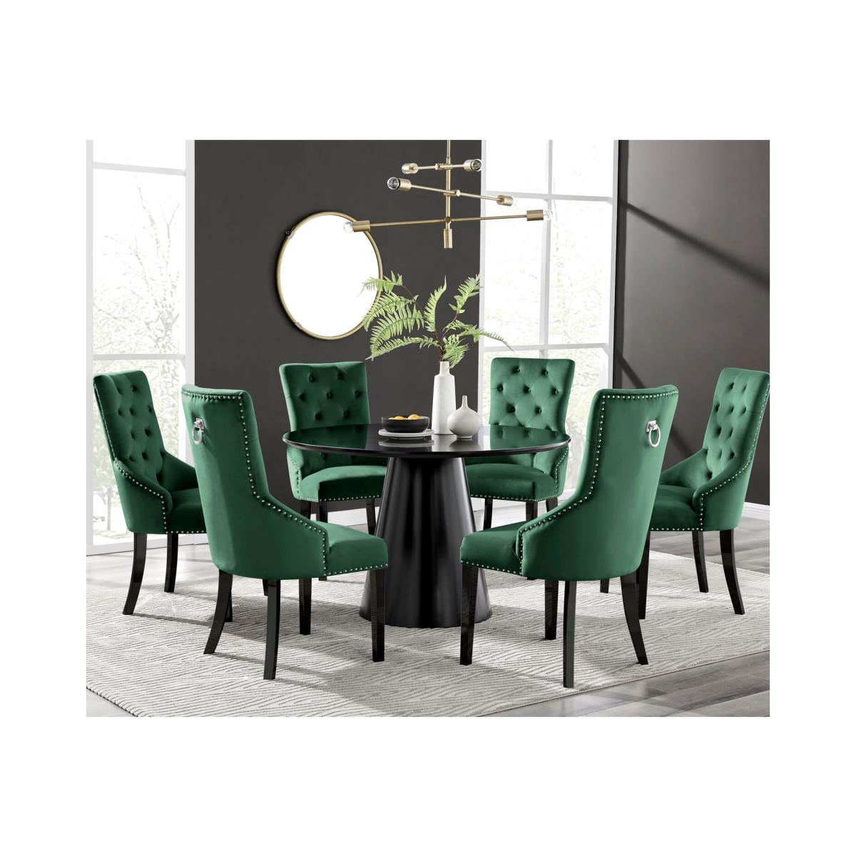 Our stunning Palma table is a round dining table with a large statement tapered central pillar. It's a minimalist post-modern dream! The perfect balance of round and straight lines an uncluttered and elegant dining table solution that will be a real talking point in any modern dining room. Black is still the new black when it comes to this table. Attention-grabbing without stealing ALL the limelight. Pair with some bold colours and metallic bursts in your chairs accessories to really make this pop, or keep it chic and simple with some understated tones. Comfortably sits 4 - 6 and is constructed from wood composite with a luxury high-gloss finish. This table is easy to keep clean, durable and will stay gorgeous for years to come. Also available in other colours. The Belgravia knocker chair is the ultimate in dining chair opulence with its scoop back design that allows you and your guests to lean back and feel supported by the wrap-around arms. Stylish Chesterfield-inspired button tufting and diamond stitching add to the modern chic look. The design gives us straight lines and soft padded curves contemporary and comfortable. The thick filled seat cushion is supportive and comfortable and is complemented by the silky velvet fabric. These ultra-modern chairs have subtle chrome button detailing along the trim of the seat and around the back of the chair which compliments beautifully with the black legs. The highlight of the Belgravia chair is the chrome knocker on the back of the chair which is a popular feature for both modern and traditional dining rooms. Anyone for a lovely dinner party or some cocktails sat in one of these! We're in love!