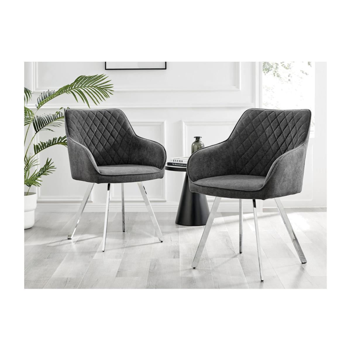 Our stunning Palma table is a round dining table with a large statement tapered central pillar. It's a minimalist post-modern dream! The perfect balance of round and straight lines an uncluttered and elegant dining table solution that will be a real talking point in any modern dining room. Black is still the new black when it comes to this table. Attention-grabbing without stealing ALL the limelight. Pair with some bold colours and metallic bursts in your chairs accessories to really make this pop, or keep it chic and simple with some understated tones. Comfortably sits 4 - 6 and is constructed from wood composite with a luxury high-gloss finish. This table is easy to keep clean, durable and will stay gorgeous for years to come. Also available in other colours. The Falun dining chair is a modern carver chair design with quilted diamond stitching to the inside. Comfortable and super-stylish, with postmodern midcentury touches, the chair's combination of curves and straight lines keeps it fresh and eyecatching. Sat on elegant angled legs, this chair will suit any modern decor.