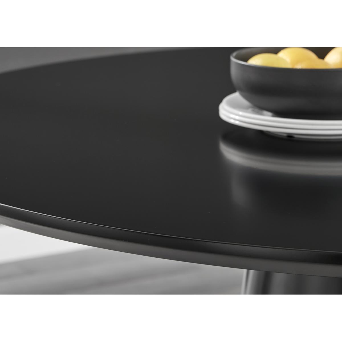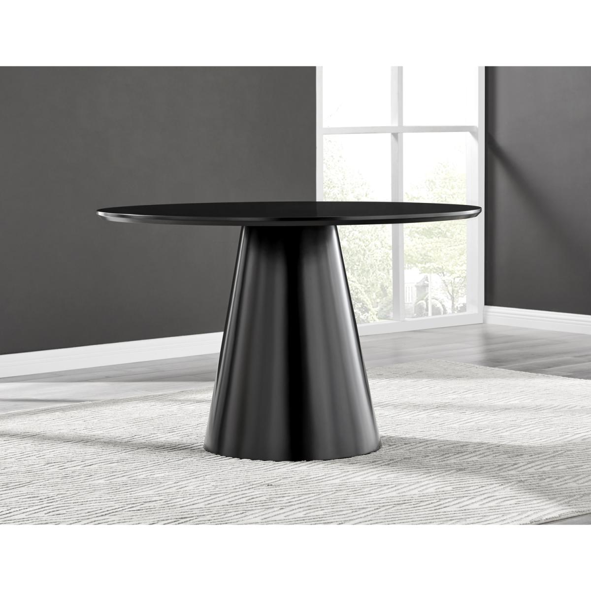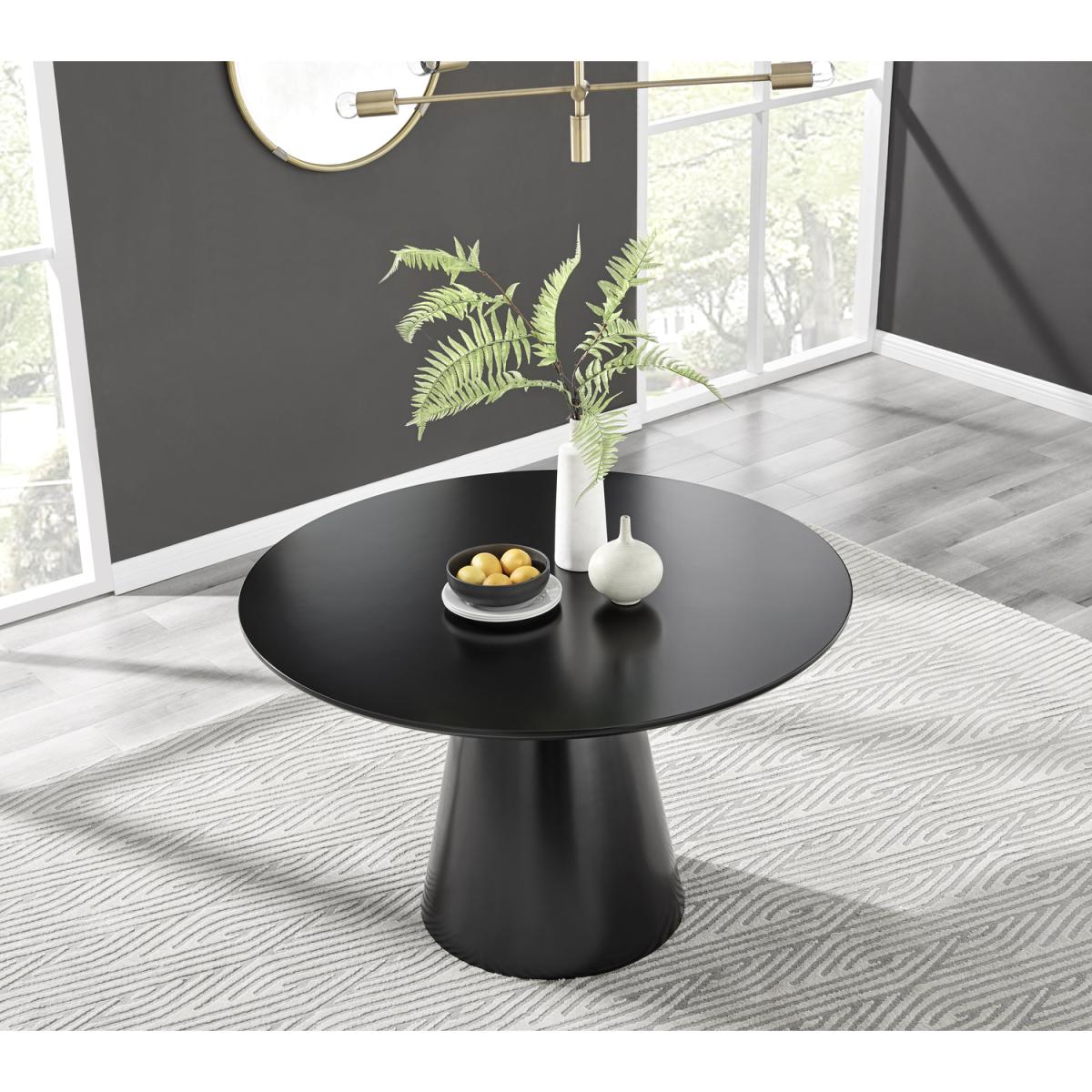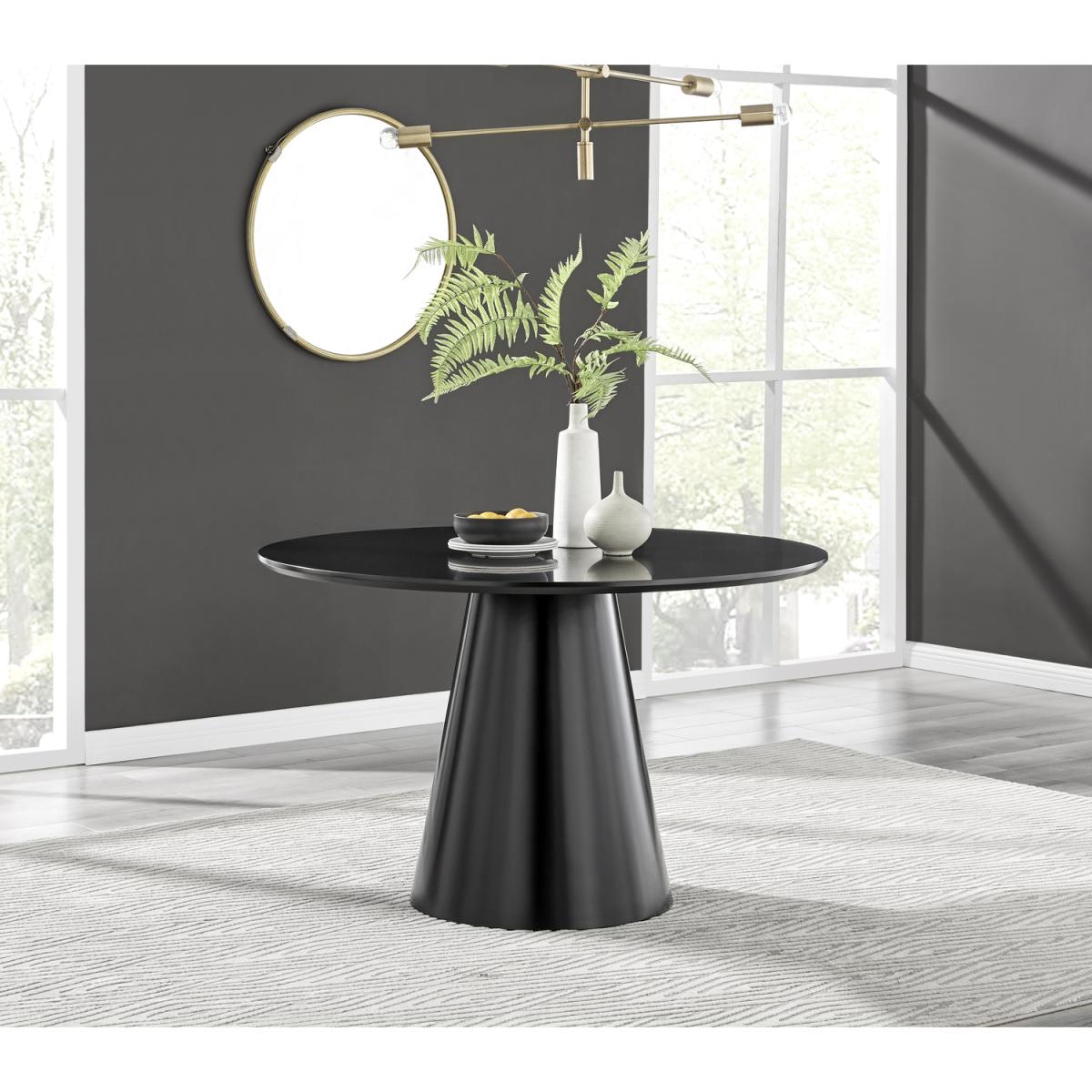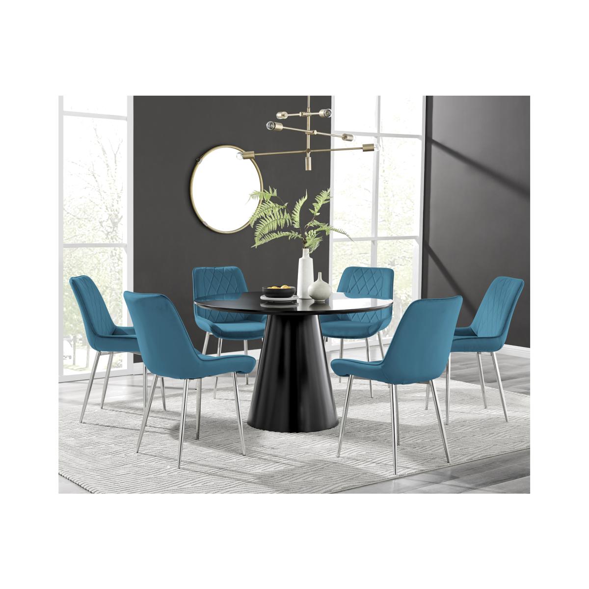 Our stunning Palma table is a round dining table with a large statement tapered central pillar. Its a minimalist post-modern dream! The perfect balance of round and straight lines an uncluttered and elegant dining table solution that will be a real talking point in any modern dining room. Black is still the new black when it comes to this table. Attention-grabbing without stealing ALL the limelight. Pair with some bold colours and metallic bursts in your chairs accessories to really make this pop, or keep it chic and simple with some understated tones. Comfortably sits 4 - 6 and is constructed from a wood composite with a luxury high-gloss finish. This table is easy to keep clean, and durable and will stay gorgeous for years to come. Also available in other colours. Combined with our luxurious velvet upholstered Pesaro dining chairs, this set will shout luxury and style! With a nod to the Mid-century modern design era, the Pesaro chairs feature gorgeous textured diamond stitching with an ergonomically designed curved seat pad blending seamlessly to the supporting medium-high backrest. Sat atop elegant slightly tapered silver legs, these chairs perfectly compliment this luxury dining set.