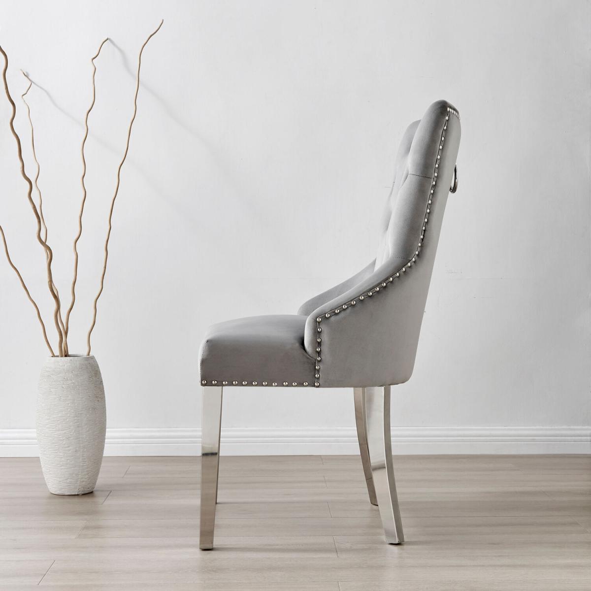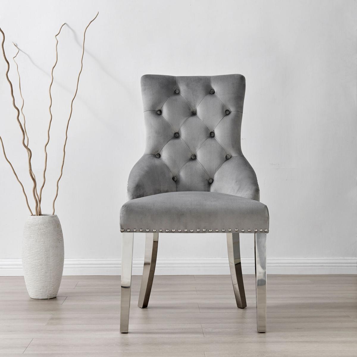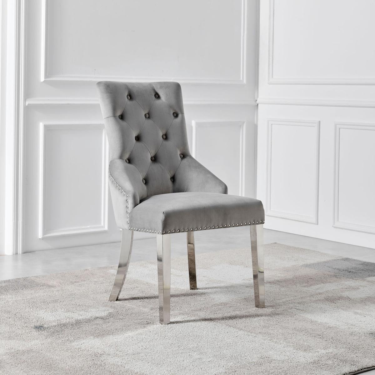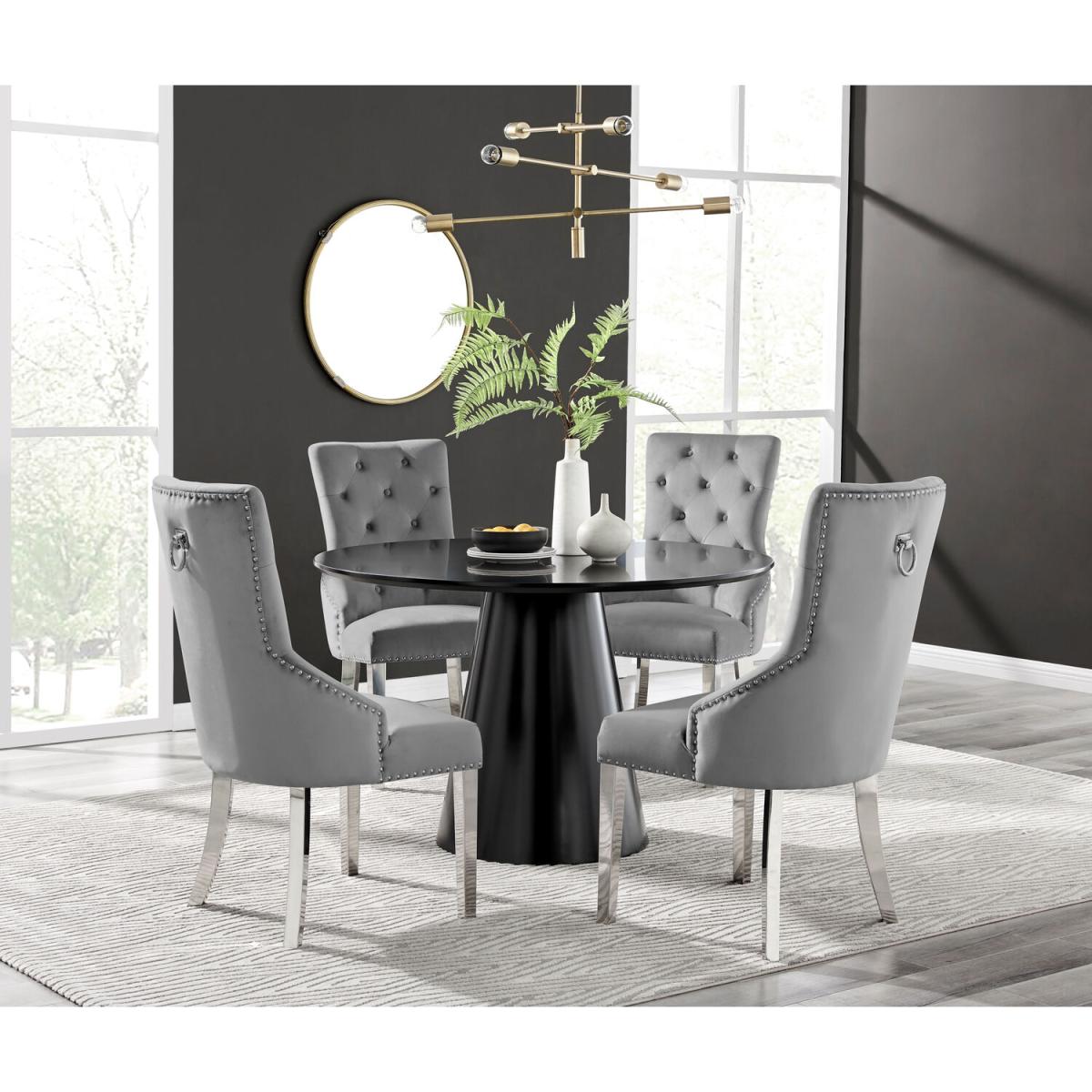Our stunning Palma table is a round dining table with a large statement tapered central pillar. Its a minimalist post-modern dream! The perfect balance of round and straight lines an uncluttered and elegant dining table solution that will be a real talking point in any modern dining room. Black is still the new black when it comes to this table. Attention-grabbing without stealing ALL the limelight. Pair with some bold colours and metallic bursts in your chairs accessories to really make this pop, or keep it chic and simple with some understated tones. Comfortably sits 4 - 6 and is constructed from wood composite with a luxury high-gloss finish. This table is easy to keep clean, durable and will stay gorgeous for years to come. Also available in other colours. The opulent Belgravia chairs provide a touch of luxury, with thickly padded velvet upholstery, and a striking knockerback detail. Anyone for a lovely dinner party or some cocktails