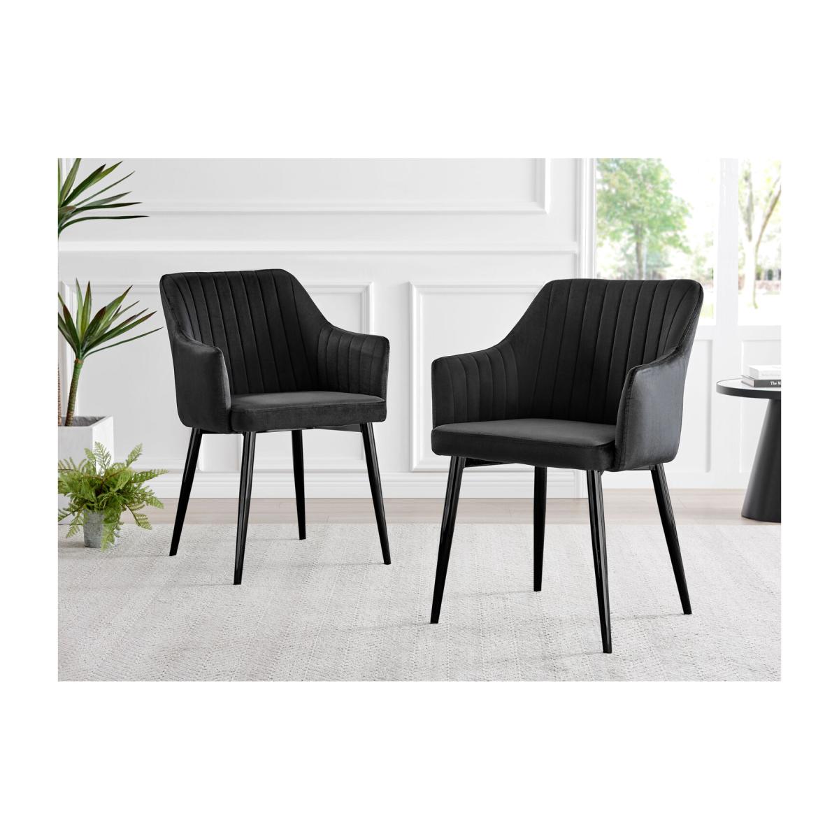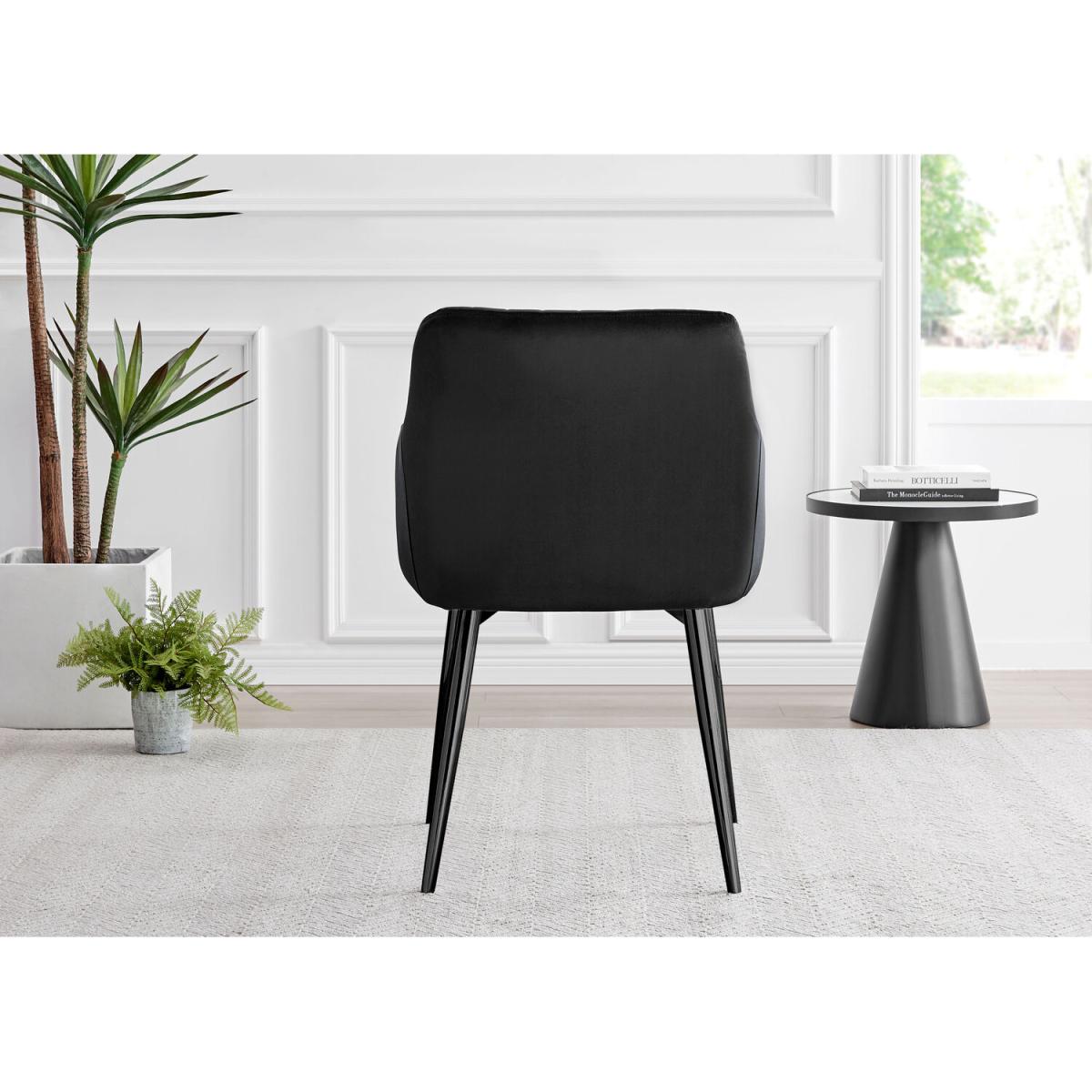 Our stunning Palma table is a round dining table with a large statement tapered central pillar. It's a minimalist post-modern dream! The perfect balance of round and straight lines an uncluttered and elegant dining table solution that will be a real talking point in any modern dining room. Black is still the new black when it comes to this table. Attention-grabbing without stealing ALL the limelight. Pair with some bold colours and metallic bursts in your chairs accessories to really make this pop, or keep it chic and simple with some understated tones. Comfortably sits 4 - 6 and is constructed from wood composite with a luxury high-gloss finish. This table is easy to keep clean, durable and will stay gorgeous for years to come. Also available in other colours. The Calla chair range features a silky smooth black velvet material which is soft to the touch and easy to wipe down and keep clean. The chair design has high arms which are supportive and just the right height to rest your arms for maximum comfort during dinner parties that last long into the night! The thick padded seat, back and sides will hug and support your body meaning your guests won't want to leave!The seat back and inner arms feature a vertically stitched design which elongates the arms and adds height whilst also adding a modern appeal. The square shape and straight lines of this kitchen chair are softened by the curve from the arms up to the back of the chair. The Calla velvet chair is enhanced by the industrial style black metal legs which provide a stable base for the seat.