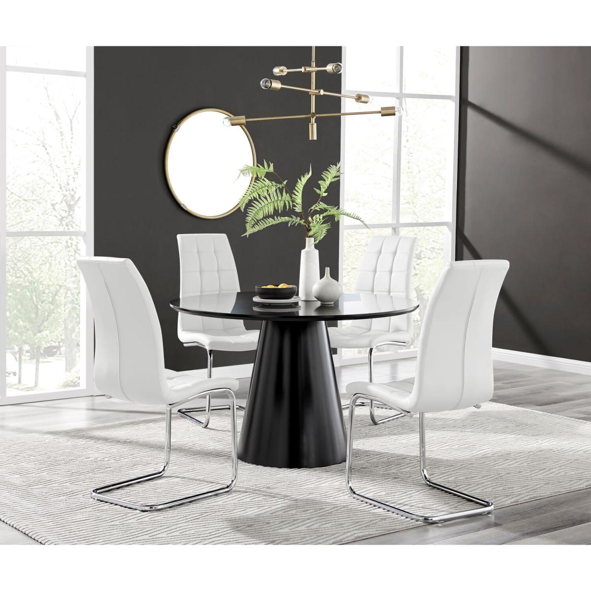 Our stunning Palma table is a round dining table with a large statement tapered central pillar. Its a minimalist post-modern dream! The perfect balance of round and straight lines an uncluttered and elegant dining table solution that will be a real talking point in any modern dining room. Black is still the new black when it comes to this table. Attention-grabbing without stealing ALL the limelight. Pair with some bold colours and metallic bursts in your chairs accessories to really make this pop, or keep it chic and simple with some understated tones. Comfortably sits 4 - 6 and is constructed from wood composite with a luxury high-gloss finish. This table is easy to keep clean, durable and will stay gorgeous for years to come. Also available in other colours. Finished with our stylish cantilever Murano dining chairs, this set offers maximum comfort and elegance that will never go out of fashion! The Murano chairs feature an eye-catching hatched deep foam single piece seat pad and lumbar supporting back rest, making it a delight to sit on. With the chrome finish cantilevered base, the Murano is a perfect match to complete this dining set.