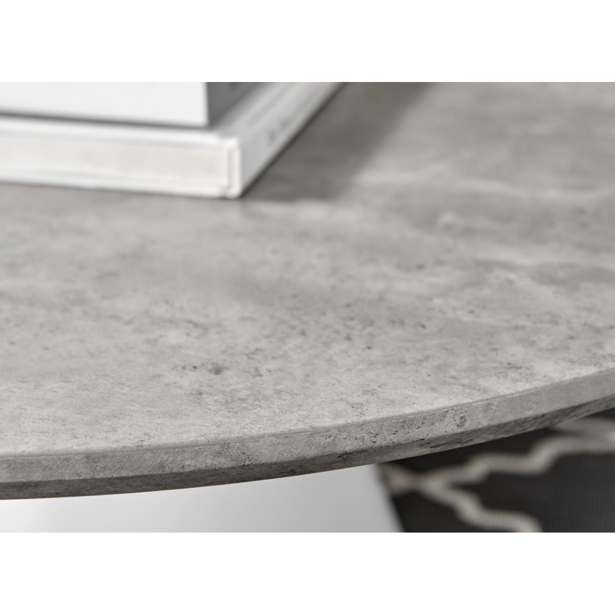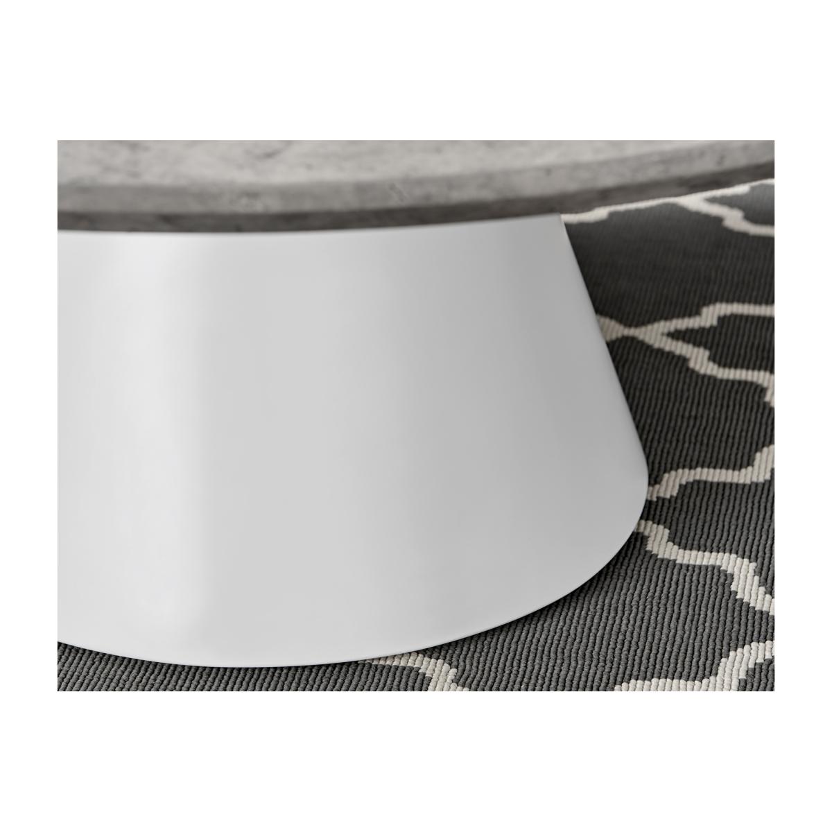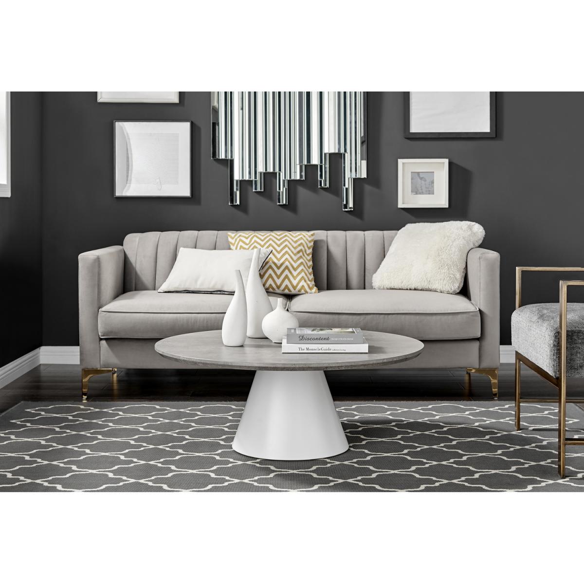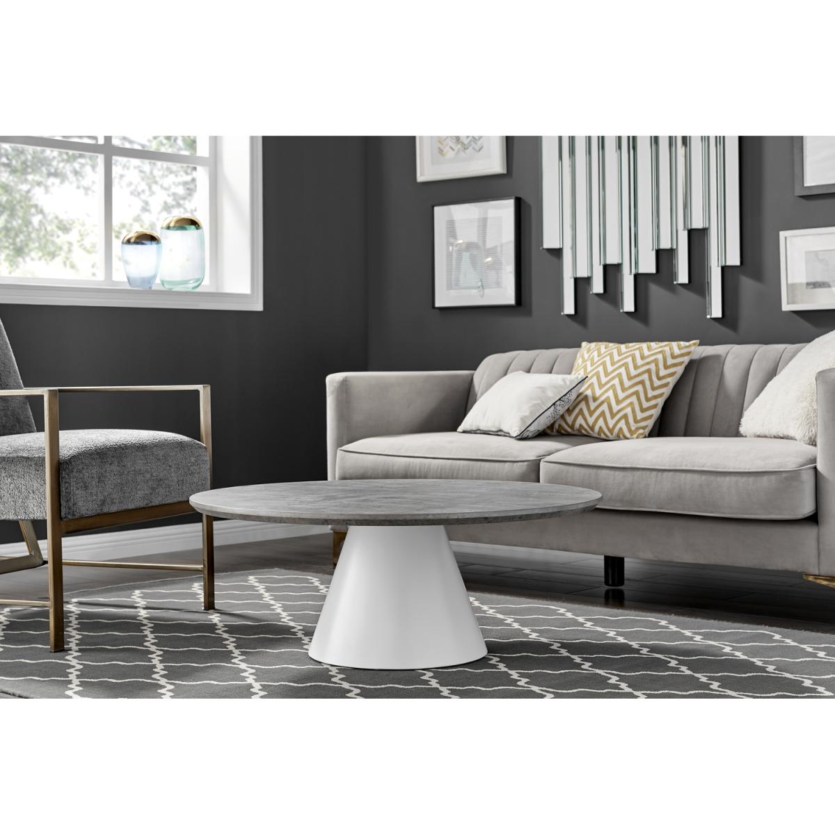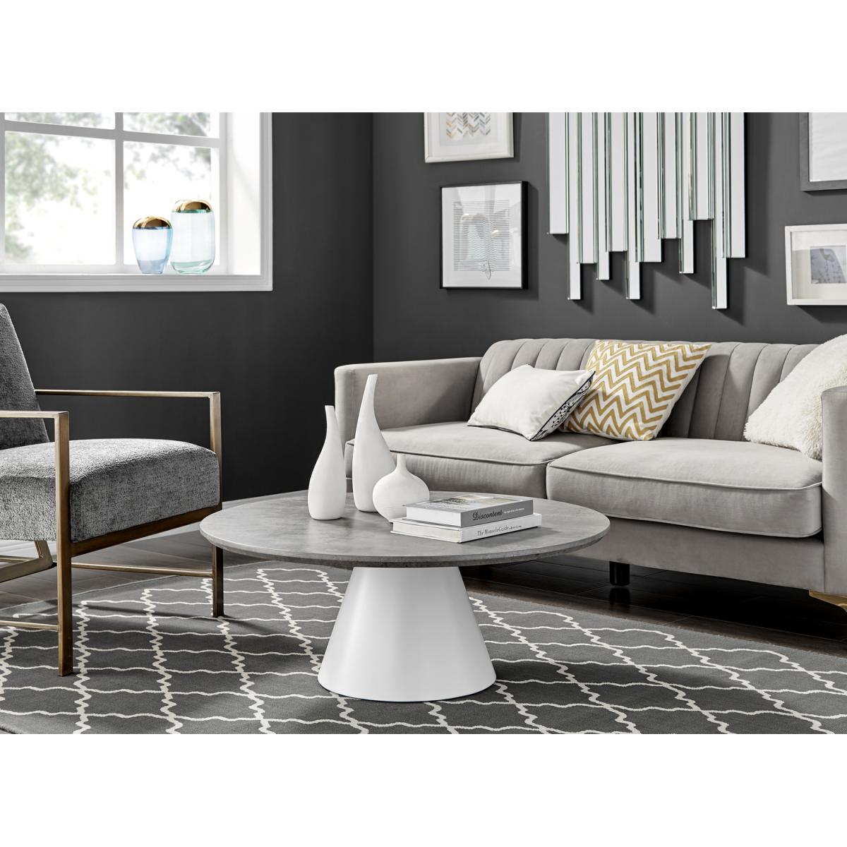 Our stunning Palma coffee table is a round coffee table with a large statement tapered central pillar. Its a minimalist post-modern dream! The perfect balance of round and straight lines an uncluttered and elegant coffee table solution that will be a real talking point in any modern living room. The stylish grey concrete finish is very in right now, and is a firm favourite here. Elegant and modern. At 90cm x 90cm, there's plenty of room for all your living room storage needs, keeping things tidy and glam. Constructed from wood composite with a luxury veneer finish. This coffee table is easy to keep clean, durable and will stay gorgeous for years to come. Also available in other colours. Matching Palma dining tables available.