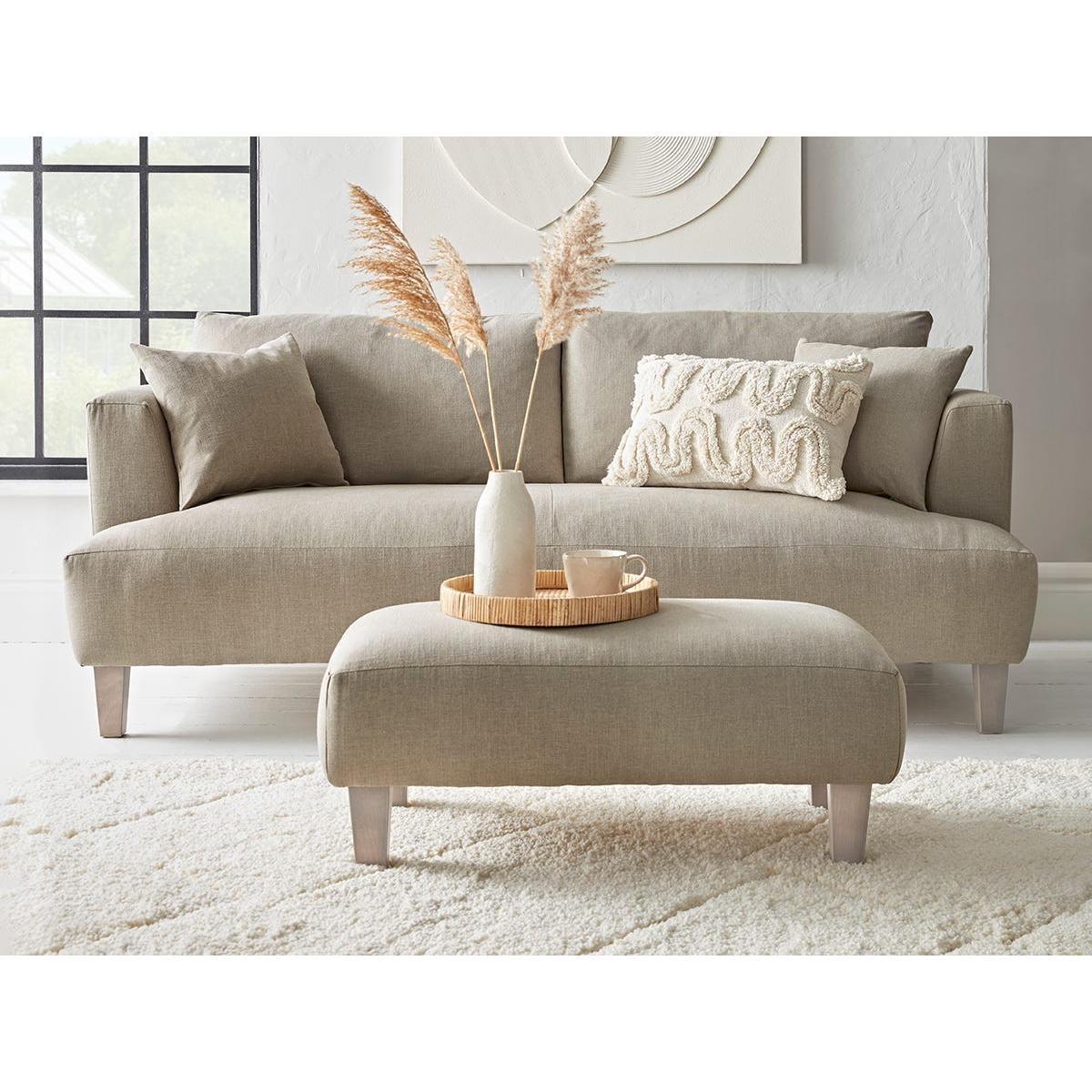 The Palma sofa boasts simple clean lines and the enduring appeal of feather cushions. Recessed sturdy arms offer an open profile and wider seating area for the sofa while a mid-height back and deep filled cushions make for cosy support. Wedge shaped plain oak legs complete the look. The sofa is available in two or three seater options. The Palma range includes two seater and three seater sofas, a loveseat and an ottoman. Our Palma collection can be upholstered in a choice of 34 distinctive shades and six fabrics to suit your style. Read our Upholstery FAQs View our full Upholstery Terms and Conditions