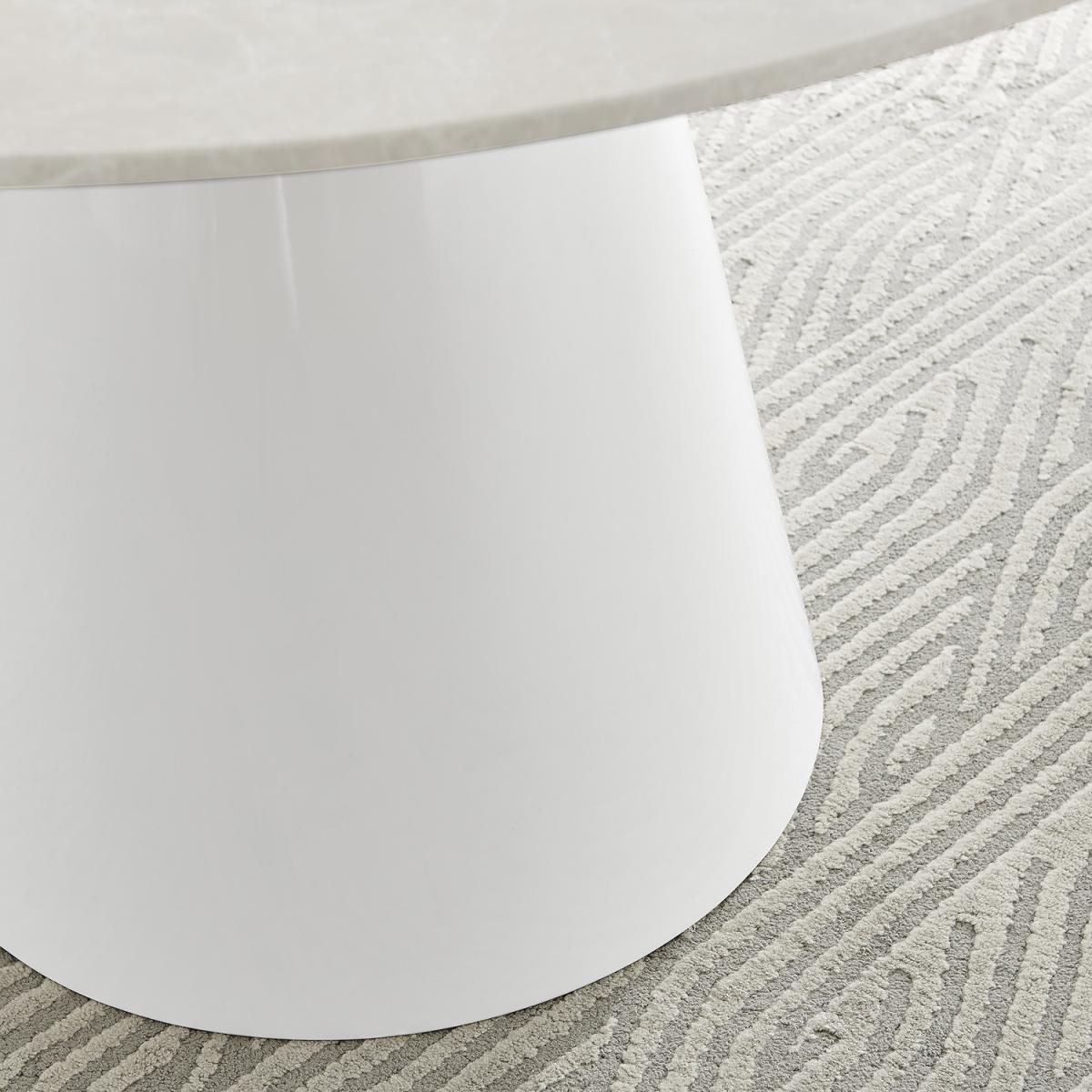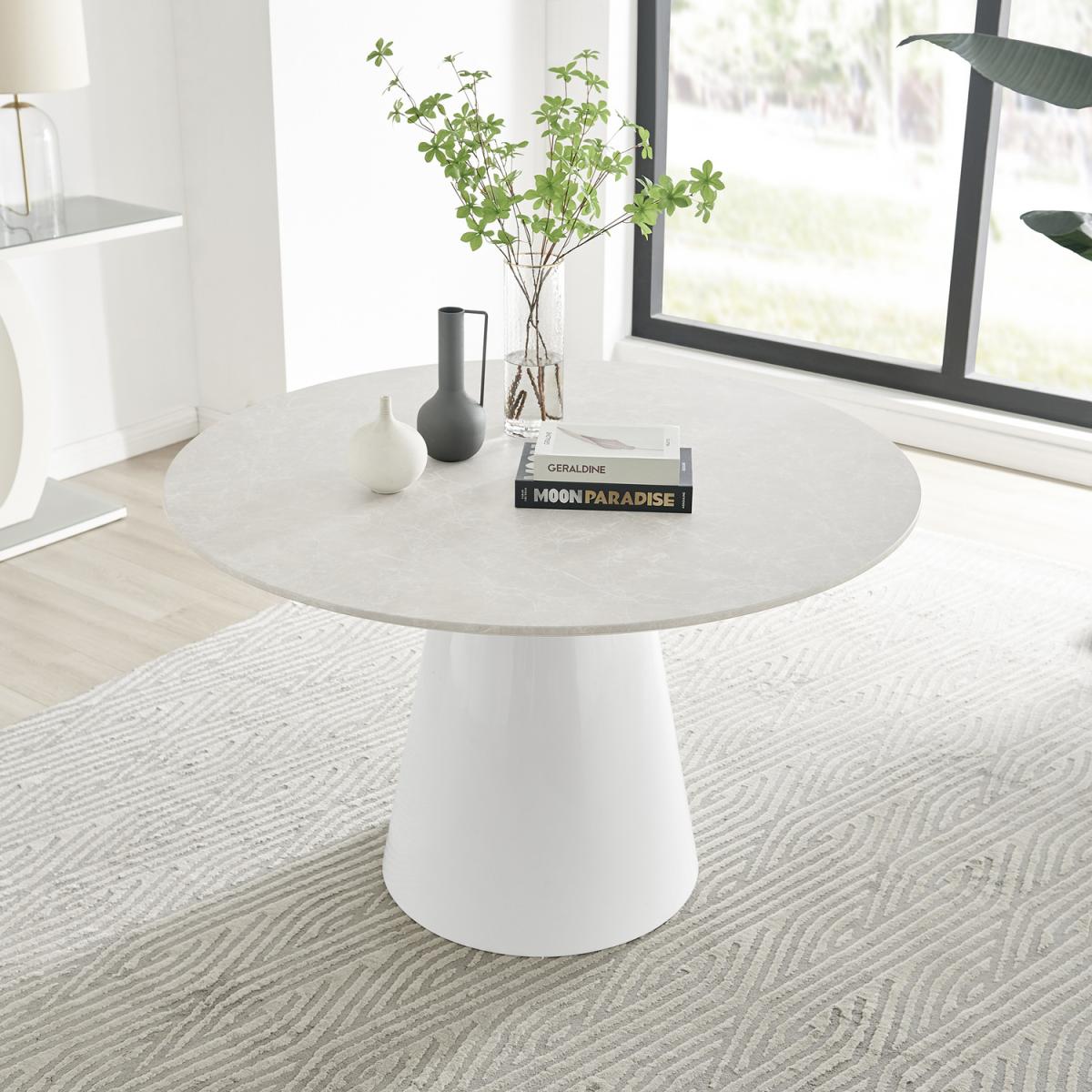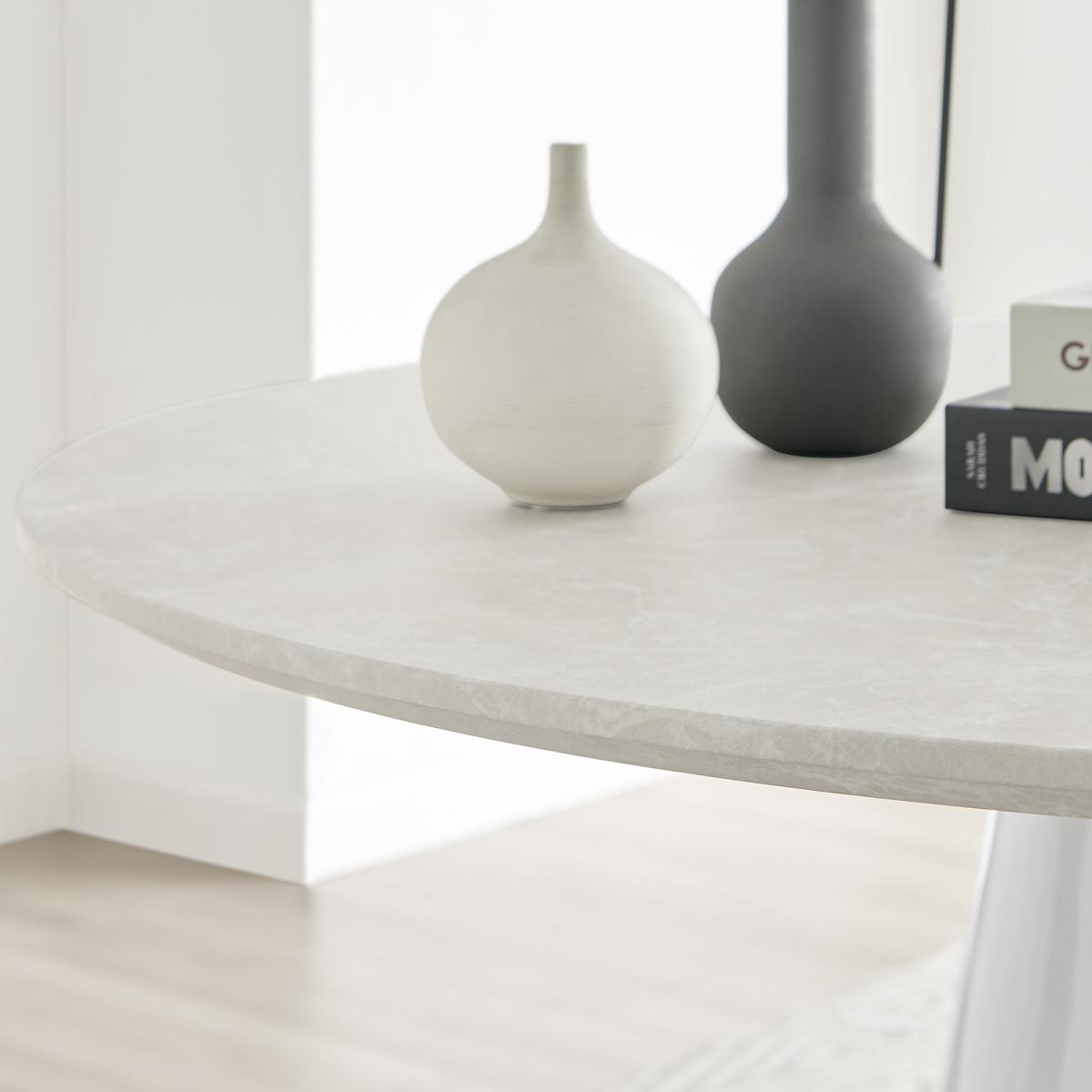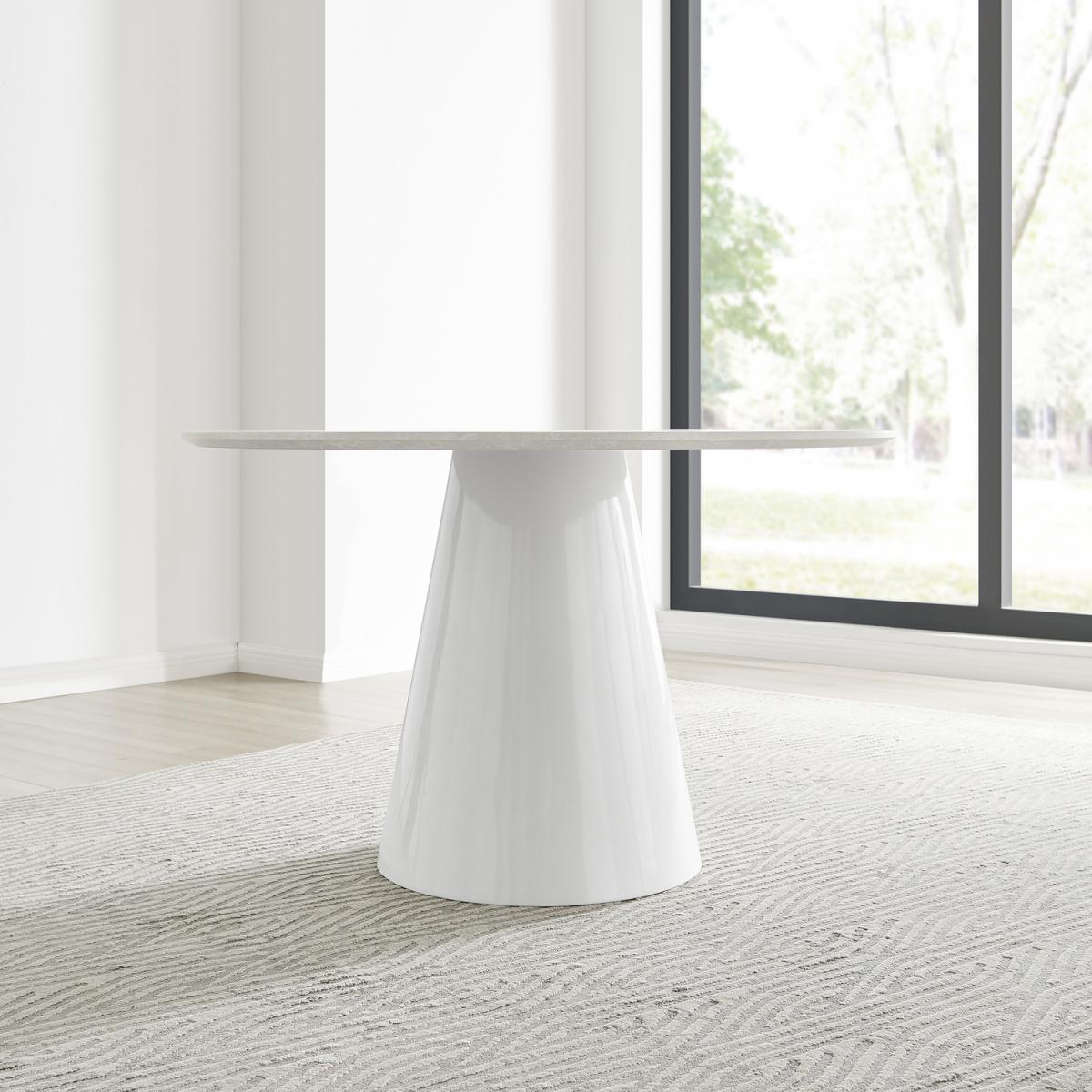 Our stunning Palma table with the stone effect finish is a round dining table with a large statement tapered central pillar. It's a minimalist post modern dream! The perfect balance of round and straight lines, an uncluttered and elegant dining table solution that will be a real talking point in any modern dining room. The beige stone-effect top is very in right now, and is a firm favourite here at Furniturebox UK HQ. Elegant and modern with a touch of that classical chic style. Pair with some bold colours and metallic bursts in your chairs/accessories to really make this pop, or keep it chic and simple with some understated tones. Comfortably sits 4 to 6, and is constructed from wood composite with a luxury stone-effect finish. This table is easy to keep clean, durable and will stay gorgeous for years to come. Also available in other colours and finishes.