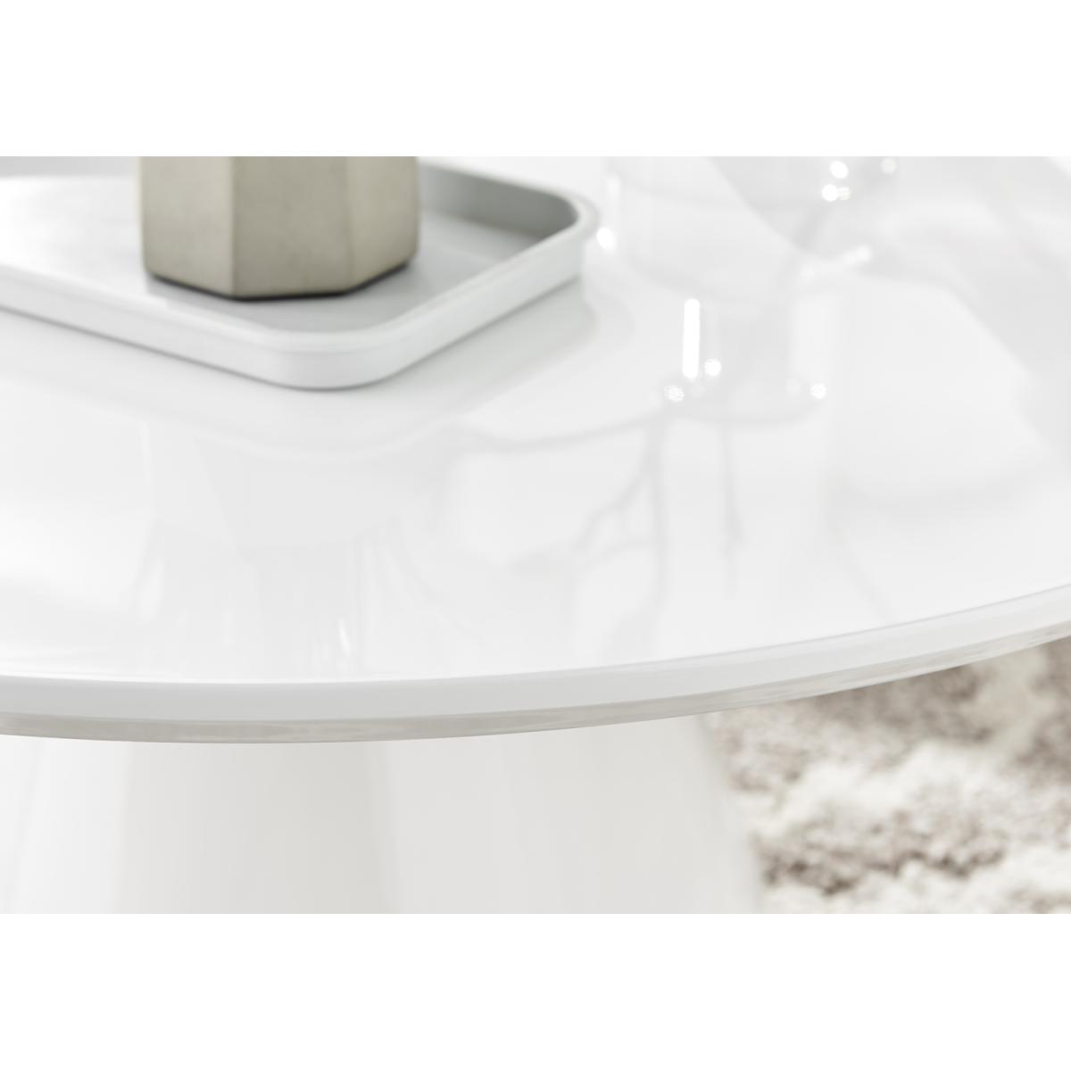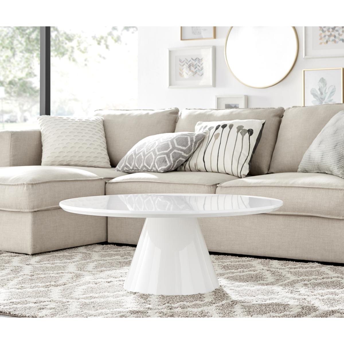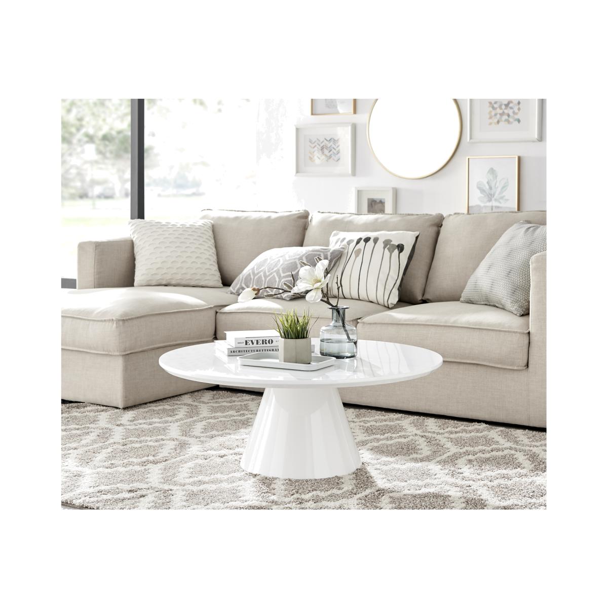 Our stunning Palma coffee table is a round coffee table with a large statement tapered central pillar. It's a minimalist post-modern dream! The perfect balance of round and straight lines an uncluttered and elegant coffee table solution that will be a real talking point in any modern living room. The sleek and chic white gloss finish is very in right now, and is a firm favourite here. Elegant and modern with a touch of classical style. At 90cm x 90cm, there's plenty of room for all your living room storage needs, keeping things tidy and glam. Constructed from wood composite with a luxury high-gloss veneer finish. This coffee table is easy to keep clean, durable and will stay gorgeous for years to come. Also available in other colours. Matching Palma dining tables available.