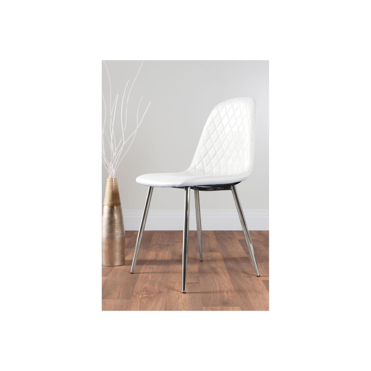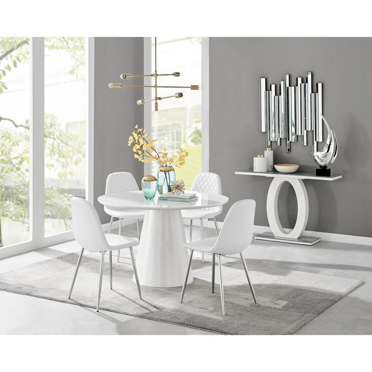 Our stunning Palma table is a round dining table with a large statement tapered central pillar. It's a minimalist post-modern dream! The perfect balance of round and straight lines an uncluttered and elegant dining table solution that will be a real talking point in any modern dining room. The white high-gloss finish keeps this design bright and airy. Attention-grabbing without stealing ALL the limelight. Pair with some bold colours and metallic bursts in your chairs accessories to really make this pop, or keep it chic and simple with some understated tones. Comfortably sits 4 -6 and is constructed from wood composite with a luxury high-gloss finish. This table is easy to keep clean, durable and will stay gorgeous for years to come. Also available in other colours. Styled with our statement Corona chairs, this set is a perfect balance of pattern and texture. The sleek chrome effect legs add an accent of lustre to your home. The Scandi-style faux leather seat with diamond pattern stitching is a unique take on a classic design offering comfort and durability for everyday use.