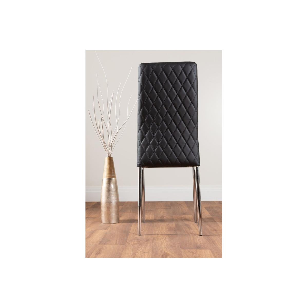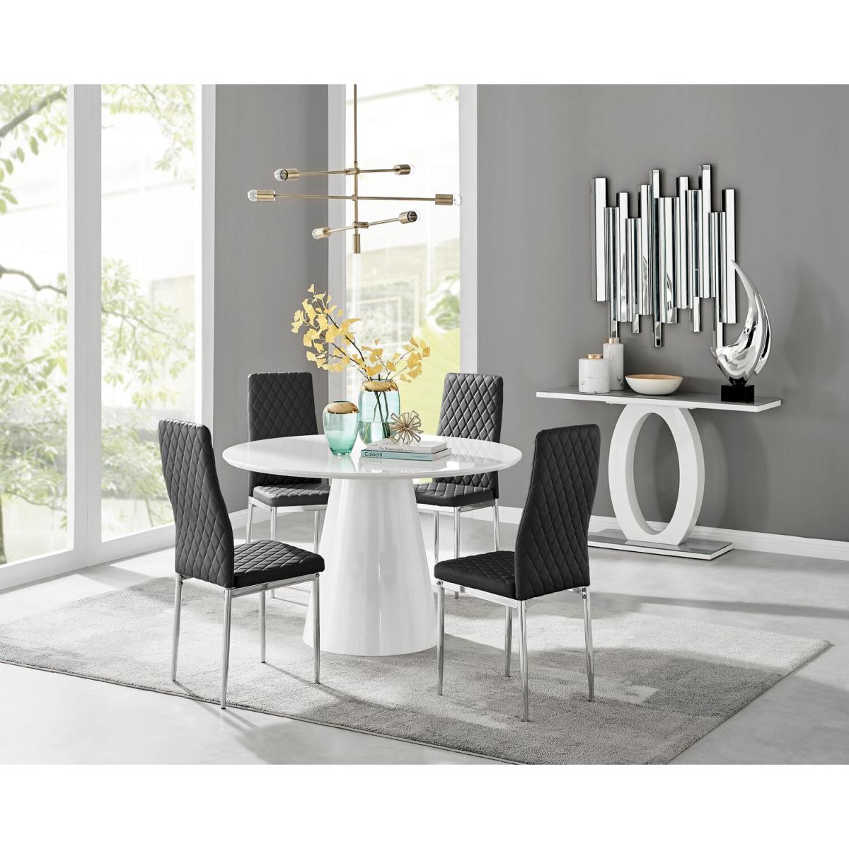 Our stunning Palma table is a round dining table with a large statement tapered central pillar. It's a minimalist post-modern dream! The perfect balance of round and straight lines an uncluttered and elegant dining table solution that will be a real talking point in any modern dining room. The white high-gloss finish keeps this design bright and airy. Attention-grabbing without stealing ALL the limelight. Pair with some bold colours and metallic bursts in your chairs accessories to really make this pop, or keep it chic and simple with some understated tones. Comfortably sits 4 -6 and is constructed from wood composite with a luxury high-gloss finish. This table is easy to keep clean, durable and will stay gorgeous for years to come. Also available in other colours. Paired alongside our beautiful faux leather diamond quilted Milan dining chairs for a sophisticated contemporary look. The Milan chairs are made from high quality faux leather with chrome legs and are ergonomically designed for maximum comfort and back support. Made for regular use, the protective plastic feet will protect your floor from any damage. Available in elephant grey, cappuccino grey, white, black or mustard to add your own personality and complete this gorgeous dining set.
