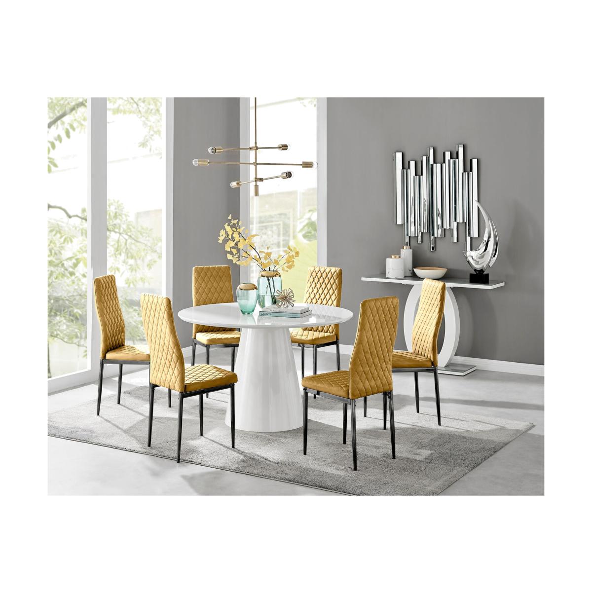 Our stunning Palma table is a round dining table with a large statement tapered central pillar. It's a minimalist post-modern dream! The perfect balance of round and straight lines an uncluttered and elegant dining table solution that will be a real talking point in any modern dining room. The white high-gloss finish keeps this design bright and airy. Attention-grabbing without stealing ALL the limelight. Pair with some bold colours and metallic bursts in your chairs accessories to really make this pop, or keep it chic and simple with some understated tones. Comfortably sits 4 -6 and is constructed from wood composite with a luxury high gloss finish. This table is easy to keep clean, durable and will stay gorgeous for years to come. Also available in other colours. Upholstered in soft touch mustard yellow velvet and finished with diamond pattern stitching the Milan dining chairs would seamlessly fit in with most dining spaces, whilst not compromising on either style or comfort. The stylish black powder coated metal leg and hatched velvet combination gives this chair a contemporary edge, whilst it's simple design allows for practical everyday usage. The chairs are made from high quality durable velvet that's easy to keep clean and are ergonomically designed for maximum comfort and support. They feature a deep foam seat cushion and plastic feet to protect the floor from any damage! At an unbeatable price you cannot go wrong with these chairs!