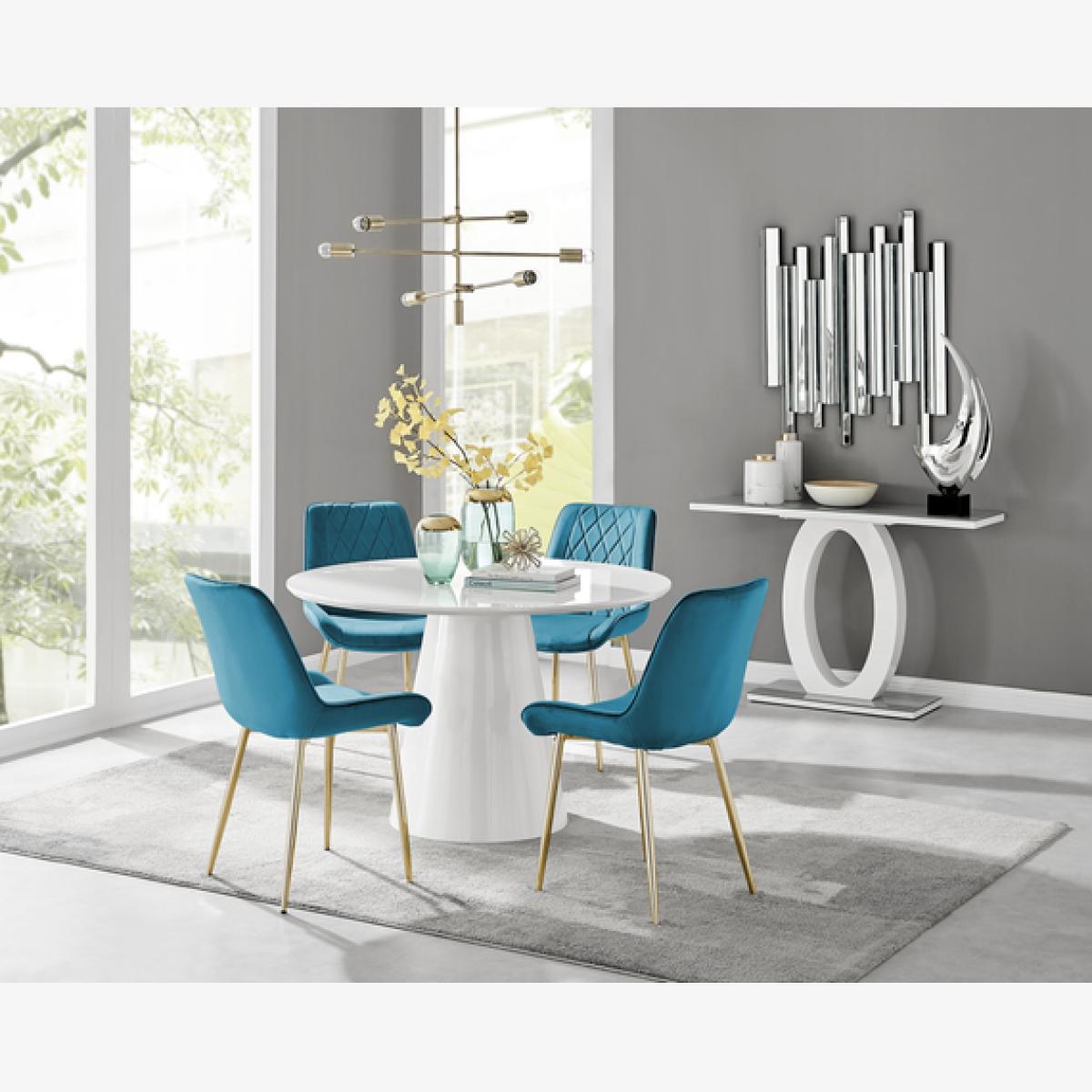 Our stunning Palma table is a round dining table with a large statement tapered central pillar. Its a minimalist post-modern dream! The perfect balance of round and straight lines an uncluttered and elegant dining table solution that will be a real talking point in any modern dining room. The white high-gloss finish keeps this design bright and airy. Attention-grabbing without stealing ALL the limelight. Pair with some bold colours and metallic bursts in your chairs accessories to really make this pop, or keep it chic and simple with some understated tones. Comfortably sits 4 -6 and is constructed from wood composite with a luxury high-gloss finish. This table is easy to keep clean, durable and will stay gorgeous for years to come. Also available in other colours. Modernise your dining area with our luxurious velvet upholstered Pesaro Dining Chairs. With a nod to the Mid-century modern design era, the Pesaro features gorgeous textured diamond stitching with an ergonomically designed curved seat pad blending seamlessly to the supporting medium high back rest. Sat atop elegant slightly tapered legs in black, chrome or gold effect. The Pesaro is a perfect match to any dining table or use as a luxe vanity seat in the bedroom, as an occasional chair for the living area or to add a bit of luxury to your home office. Our stunning Palma table is a round dining table with a large statement tapered central pillar. It's a minimalist post-modern dream! The perfect balance of round and straight lines an uncluttered and elegant dining table solution that will be a real talking point in any modern dining room. The white high-gloss finish keeps this design bright and airy. Attention-grabbing without stealing ALL the limelight. Pair with some bold colours and metallic bursts in your chairs accessories to really make this pop, or keep it chic and simple with some understated tones. Comfortably sits 4 -6 and is constructed from wood composite with a luxury high-gloss finish. This table is easy to keep clean, durable and will stay gorgeous for years to come. Also available in other colours. Combined with our luxurious velvet upholstered Pesaro dining chairs, this set will shout luxury and style! With a nod to the Mid-century modern design era, the Pesaro chairs feature gorgeous textured diamond stitching with an ergonomically designed curved seat pad blending seamlessly to the supporting medium-high back rest. Sat atop elegant slightly tapered gold legs, these chairs perfectly compliment this luxury dining set.