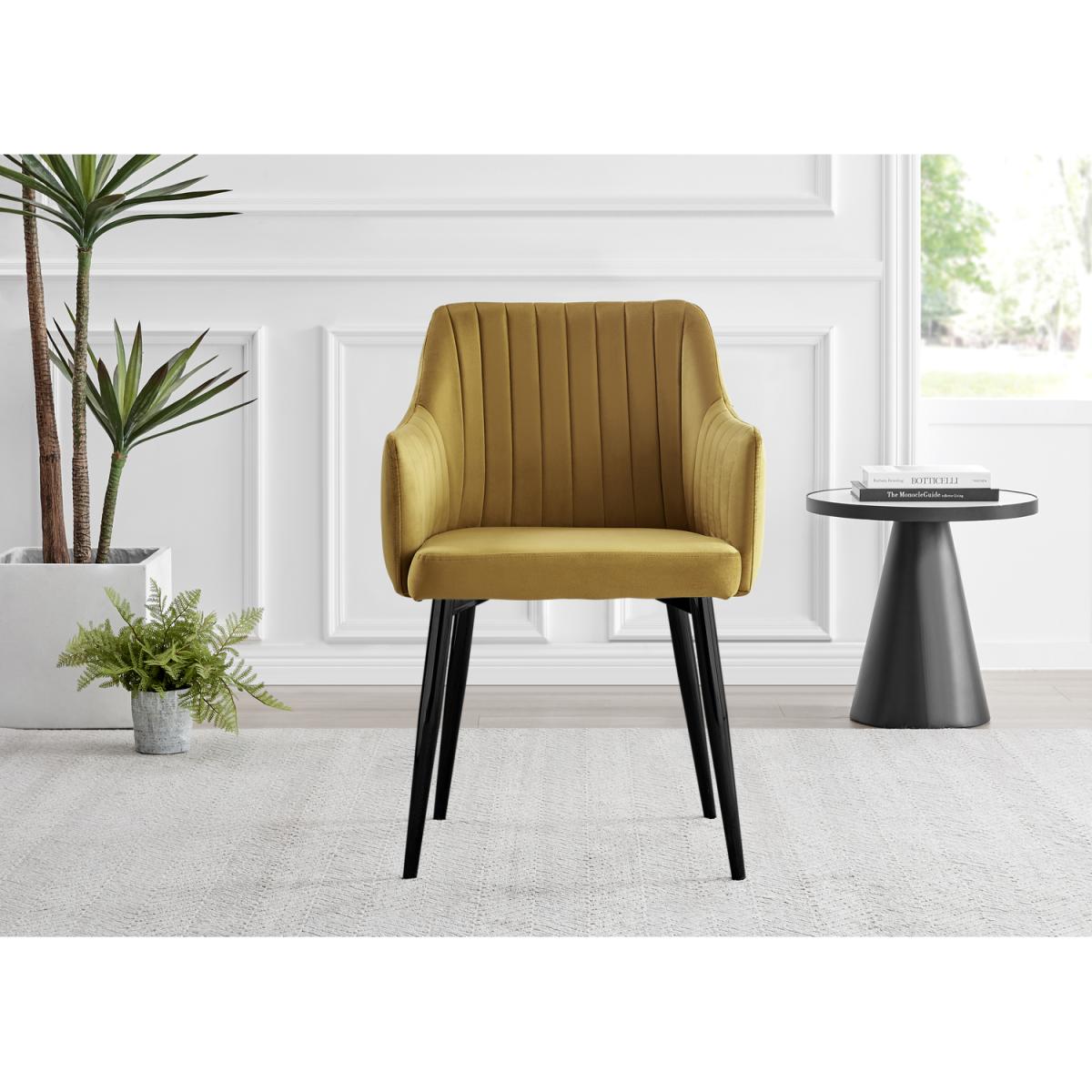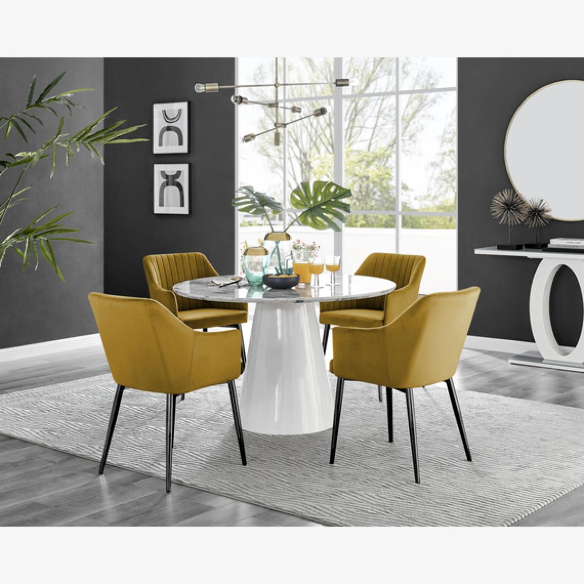 Our stunning Palma table is a round dining table with a large statement tapered central pillar. It's a minimalist post-modern dream! The perfect balance of round and straight lines is an uncluttered and elegant dining table solution that will be a real talking point in any modern dining room. The white marble-effect top is very in right now and is a firm favourite here at Furniturebox UK HQ. Elegant and modern with a touch of that classic chic style. Pair with some bold colours and metallic bursts in your chairs accessories to really make this pop, or keep it chic and simple with some understated tones. Comfortably sits 4 - 6, and is constructed from a wood composite with a luxury high-gloss finish. This table is easy to keep clean, and durable and will stay gorgeous for years to come. Also available in other colours. The Calla chair range features a silky smooth grey velvet material which is soft to the touch and easy to wipe down and keep clean. The chair design has high arms which are supportive and just the right height to rest your arms for maximum comfort during dinner parties that last long into the night! The thick padded seat, back and sides will hug and support your body meaning your guests won't want to leave! The seat back and inner arms feature a vertically stitched design which elongates the arms and adds height whilst also adding a modern appeal. The square shape and straight lines of this kitchen chair are softened by the curve from the arms up to the back of the chair. The Calla velvet chair is enhanced by the industrial-style black metal legs which provide a stable base for the seat. The soft grey velvet colour looks regal and sophisticated which beautifully compliments the design of this chair, making it suitable also as an accent chair for your living room, bedroom or hallway.