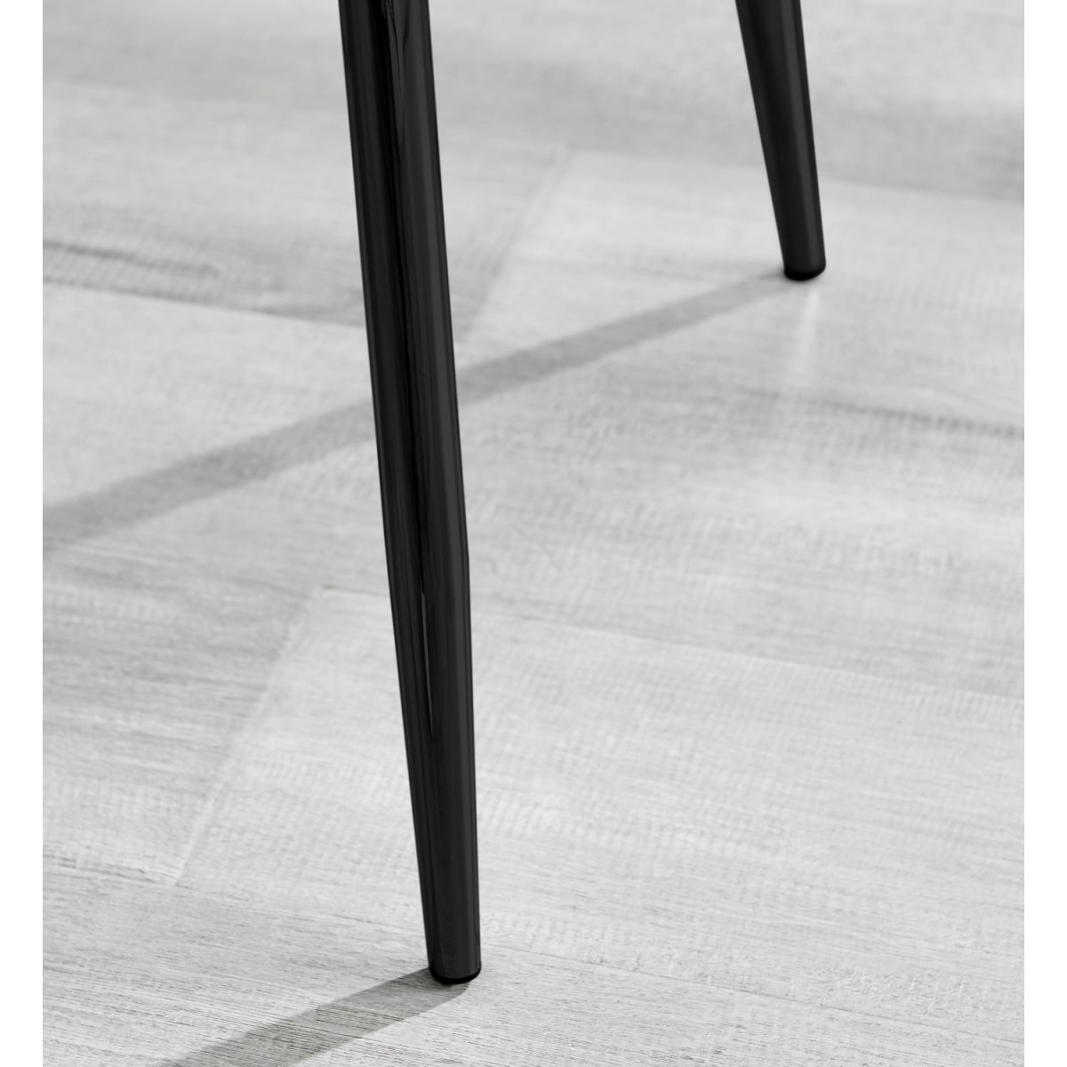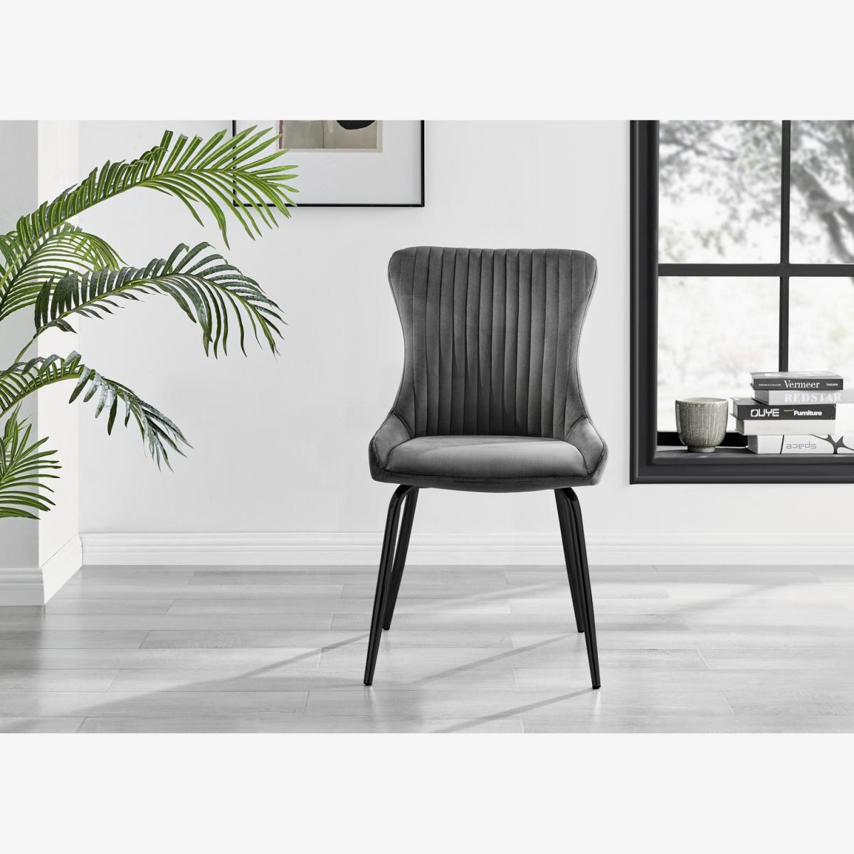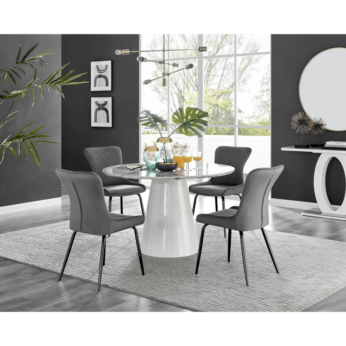 Our stunning Palma table is a round dining table with a large statement tapered central pillar. It's a minimalist post-modern dream! The perfect balance of round and straight lines an uncluttered and elegant dining table solution that will be a real talking point in any modern dining room. The white marble-effect top is very in right now, and is a firm favourite here at Furniturebox UK HQ. Elegant and modern with a touch of that classical chic style. Pair with some bold colours and metallic bursts in your chairs accessories to really make this pop, or keep it chic and simple with some understated tones. Comfortably sits 4 - 6, and is constructed from wood composite with a luxury high-gloss finish. This table is easy to keep clean, durable and will stay gorgeous for years to come. Also available in other colours. The Nora chair is a super-stylish modern chair with a nod to the classic wingback design. The elegant vertical piping stitching to the back and ergonomically designed seat sat on 4 slightly tapered legs make this uncluttered, classy and comfortable. This modern dining chair is upholstered in a soft cream velvet fabric which is modern and sophisticated. The black powder coated metal legs have a matte effect which adds an industrial design to these contemporary dining chairs.