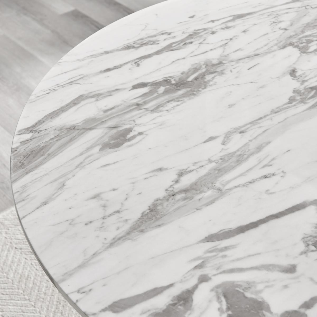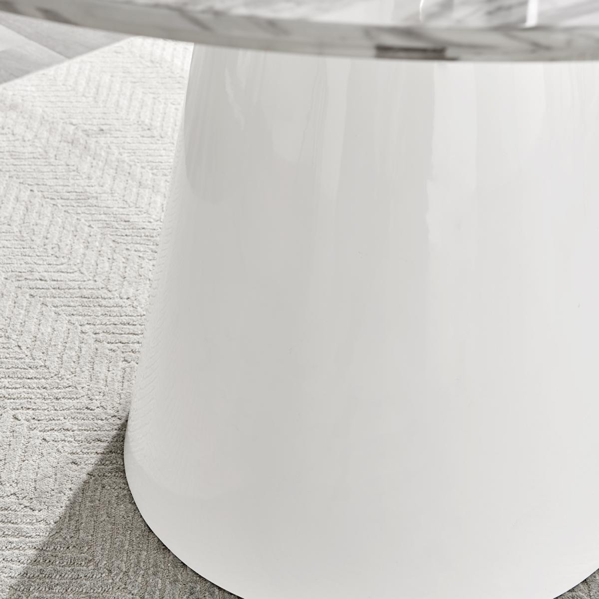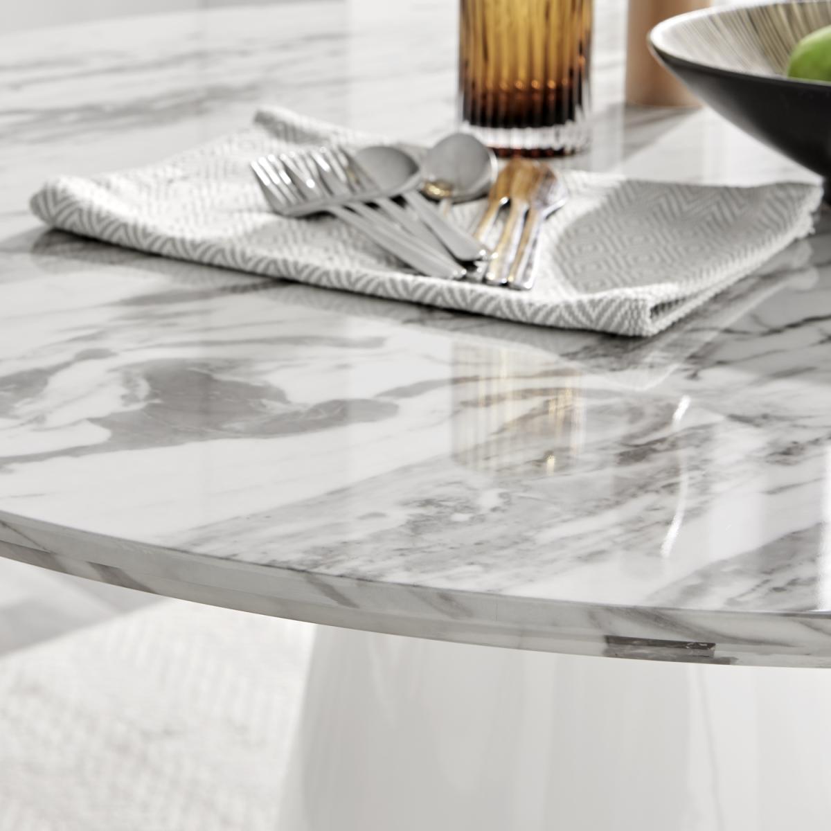 Our stunning Palma table is a round dining table with a large statement tapered central pillar. It's a minimalist post-modern dream! The perfect balance of round and straight lines an uncluttered and elegant dining table solution that will be a real talking point in any modern dining room. The white marble-effect top is very in right now, and is a firm favourite here at Furniturebox UK HQ. Elegant and modern with a touch of that classical chic style. Pair with some bold colours and metallic bursts in your chairs accessories to really make this pop, or keep it chic and simple with some understated tones. Comfortably sits 4 - 6, and is constructed from wood composite with a luxury high-gloss finish. This table is easy to keep clean, durable and will stay gorgeous for years to come. Also available in other colours. The Nora chair is a super-stylish modern chair with a nod to the classic wingback design. The elegant vertical piping stitching to the back and ergonomically designed seat sat on 4 slightly tapered legs make this uncluttered, classy and comfortable. This modern dining chair is upholstered in a soft cream velvet fabric which is modern and sophisticated. The black powder coated metal legs have a matte effect which adds an industrial design to these contemporary dining chairs.