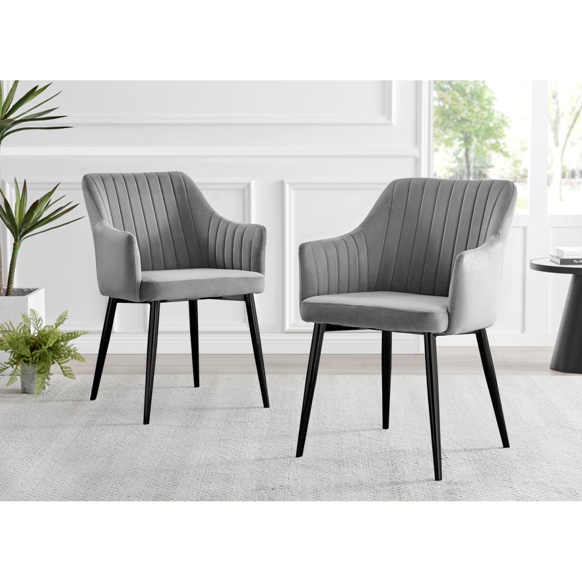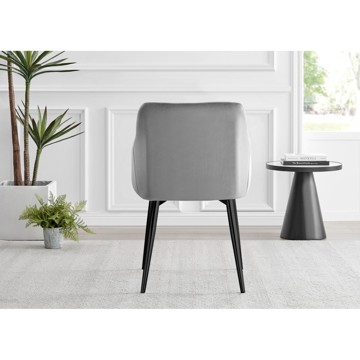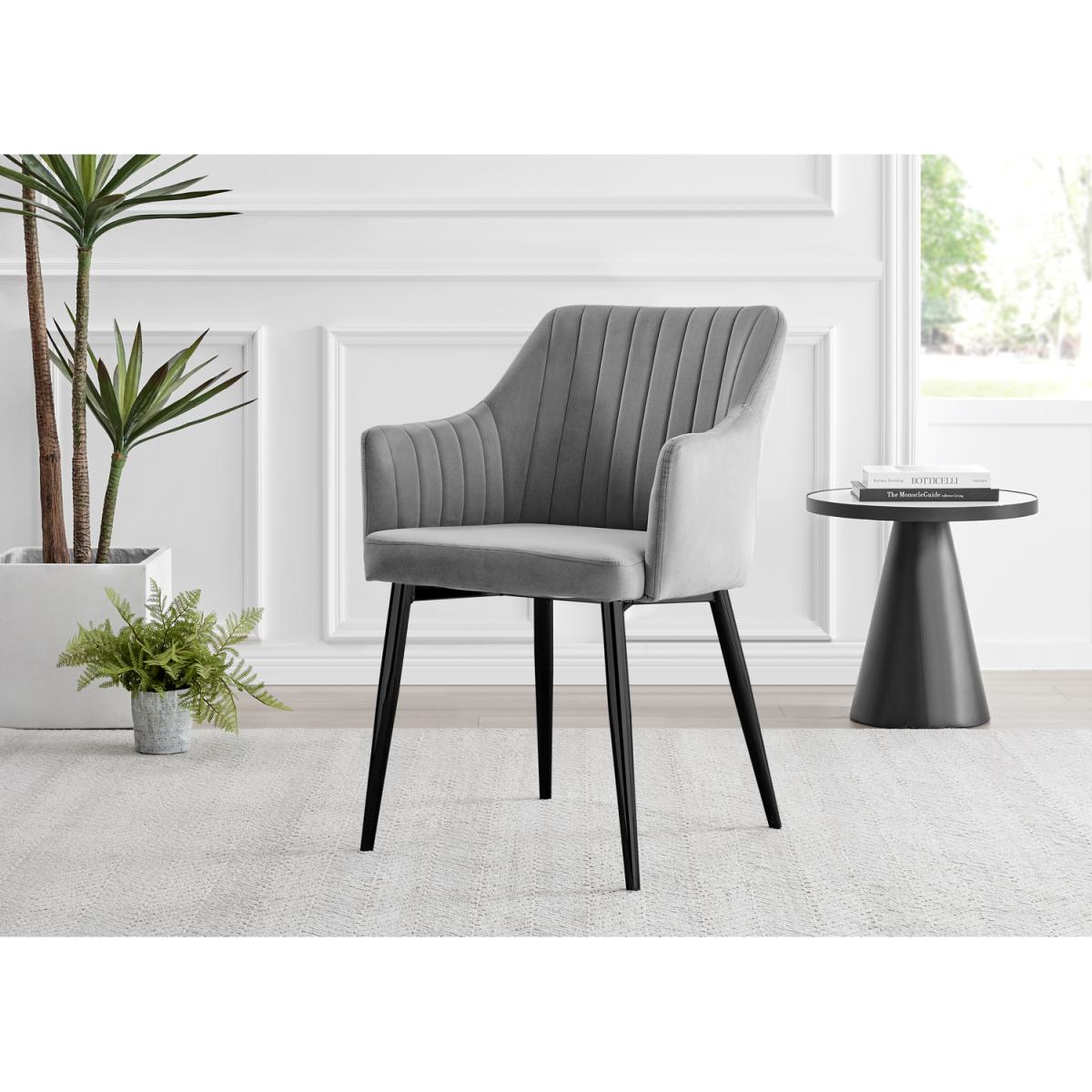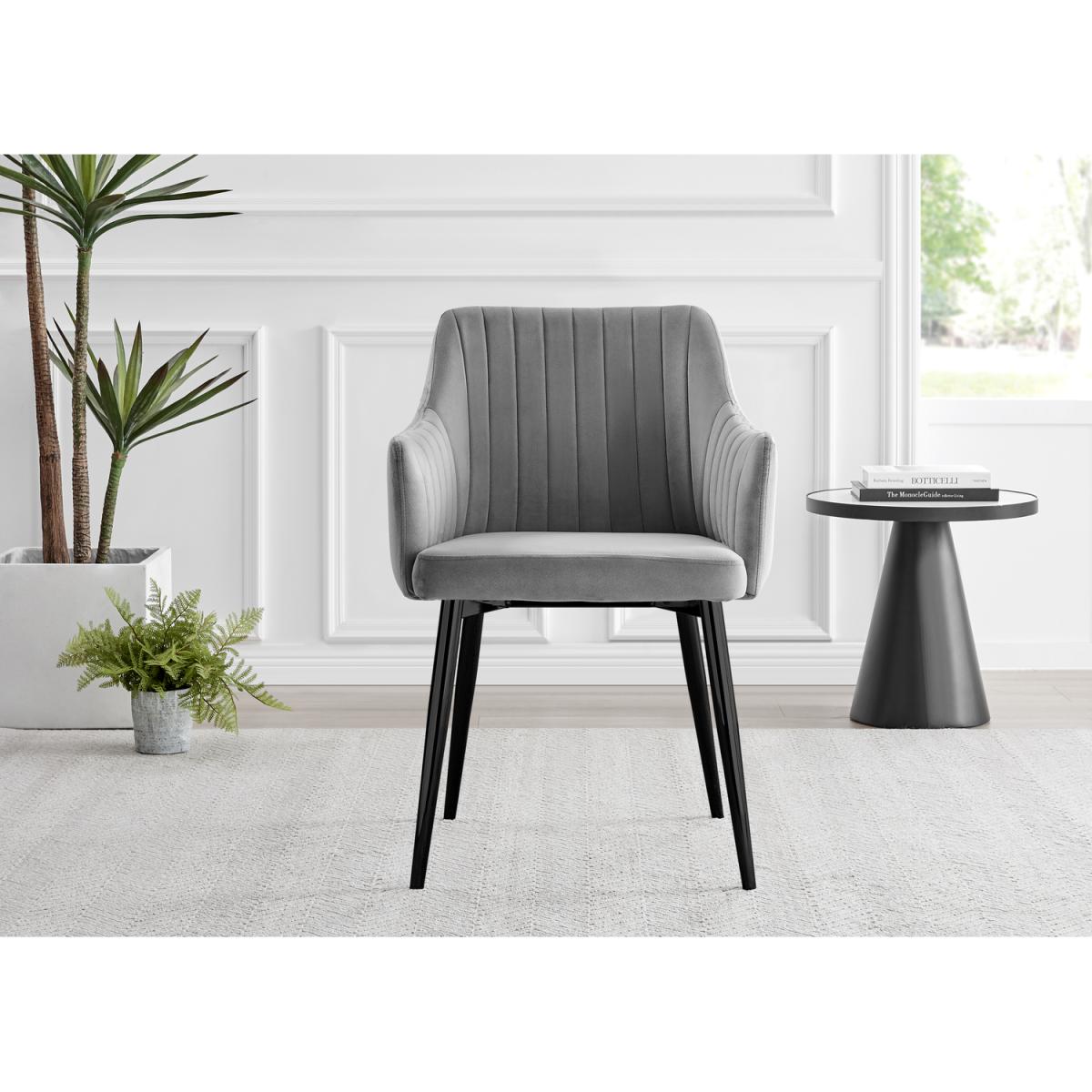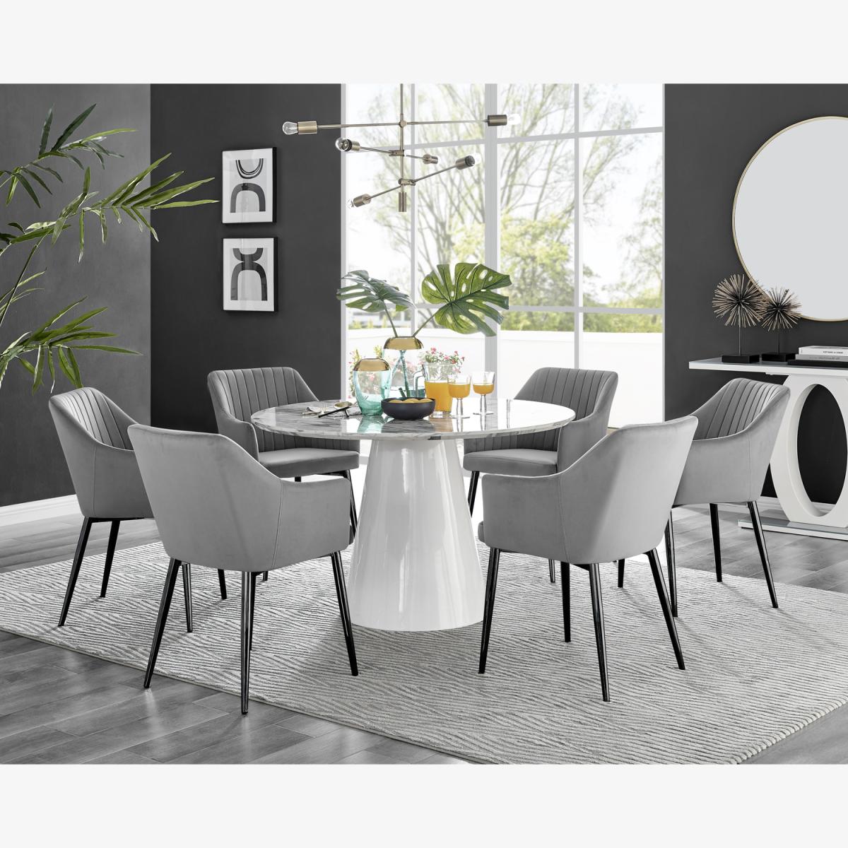 Our stunning Palma table is a round dining table with a large statement tapered central pillar. It's a minimalist post-modern dream! The perfect balance of round and straight lines an uncluttered and elegant dining table solution that will be a real talking point in any modern dining room. The white marble-effect top is very in right now, and is a firm favourite here at Furniturebox UK HQ. Elegant and modern with a touch of that classic chic style. Pair with some bold colours and metallic bursts in your chairs accessories to really make this pop, or keep it chic and simple with some understated tones. Comfortably sits 4 - 6, and is constructed from wood composite with a luxury high-gloss finish. This table is easy to keep clean, durable and will stay gorgeous for years to come. Also available in other colours. The Calla chair range features a silky smooth grey velvet material which is soft to the touch and easy to wipe down and keep clean. The chair design has high arms which are supportive and just the right height to rest your arms for maximum comfort during dinner parties that last long into the night! The thick padded seat, back and sides will hug and support your body meaning your guests won't want to leave! The seat back and inner arms feature a vertically stitched design which elongates the arms and adds height whilst also adding a modern appeal. The square shape and straight lines of this kitchen chair are softened by the curve from the arms up to the back of the chair. The Calla velvet chair is enhanced by the industrial-style black metal legs which provide a stable base for the seat. The soft grey velvet colour looks regal and sophisticated which beautifully compliments the design of this chair, making it suitable also as an accent chair for your living room, bedroom or hallway.