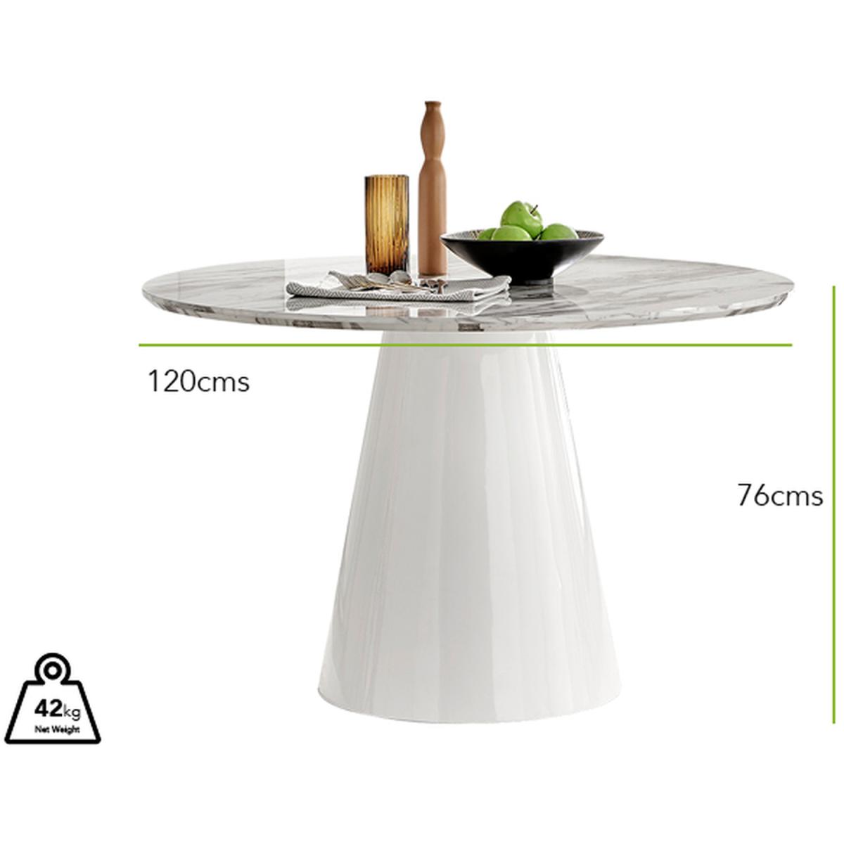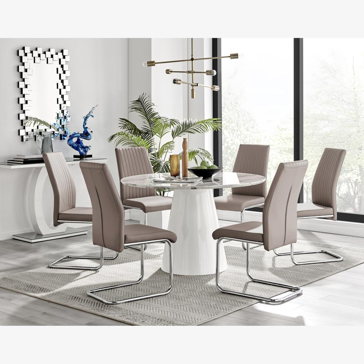 Our stunning Palma table is a round dining table with a large statement tapered central pillar. It's a minimalist post-modern dream! The perfect balance of round and straight lines an uncluttered and elegant dining table solution that will be a real talking point in any modern dining room. The white marble-effect top is very in right now, and is a firm favourite here at Furniturebox UK HQ. Elegant and modern with a touch of that classical chic style. Pair with some bold colours and metallic bursts in your chairs accessories to really make this pop, or keep it chic and simple with some understated tones. Comfortably sits 4 - 6, and is constructed from wood composite with a luxury high-gloss finish. This table is easy to keep clean, durable and will stay gorgeous for years to come. Also available in other colours. Pair it with our Lorenzo chairs for the complete look. Featuring on trend chrome cantilevered legs and supportive seat pads, these are eye catching chairs, that don't compromise on comfort.