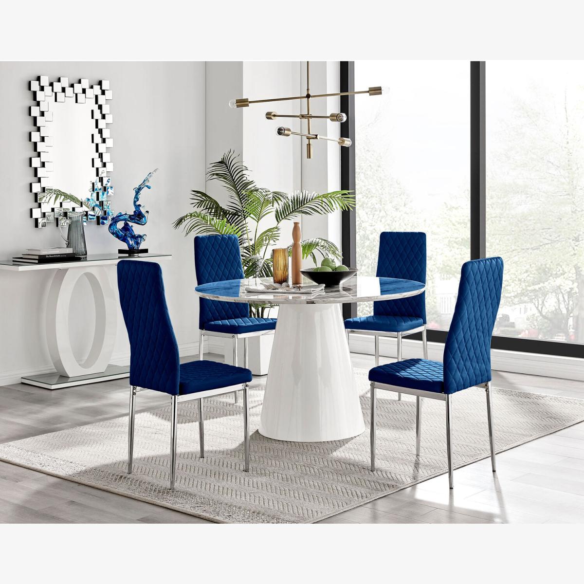 Our stunning Palma table is a round dining table with a large statement tapered central pillar. It's a minimalist post-modern dream! The perfect balance of round and straight lines an uncluttered and elegant dining table solution that will be a real talking point in any modern dining room. The white marble-effect top is very in right now, and is a firm favourite here at Furniturebox UK HQ. Elegant and modern with a touch of that classical chic style. Pair with some bold colours and metallic bursts in your chairs accessories to really make this pop, or keep it chic and simple with some understated tones. Comfortably sits 4 - 6, and is constructed from wood composite with a luxury high-gloss finish. This table is easy to keep clean, durable and will stay gorgeous for years to come. Also available in other colours. Upholstered in soft touch navy blue velvet and finished with diamond pattern stitching the Milan dining chairs would seamlessly fit in with most dining spaces, whilst not compromising on either style or comfort. The stylish shiny chrome silver leg and hatched velvet combination gives this chair a contemporary edge, whilst it's simple design allows for practical everyday usage. The chairs are made from high quality durable velvet that's easy to keep clean and are ergonomically designed for maximum comfort and support. They feature a deep foam seat cushion and plastic feet to protect the floor from any damage! At an unbeatable price you cannot go wrong with these chairs!