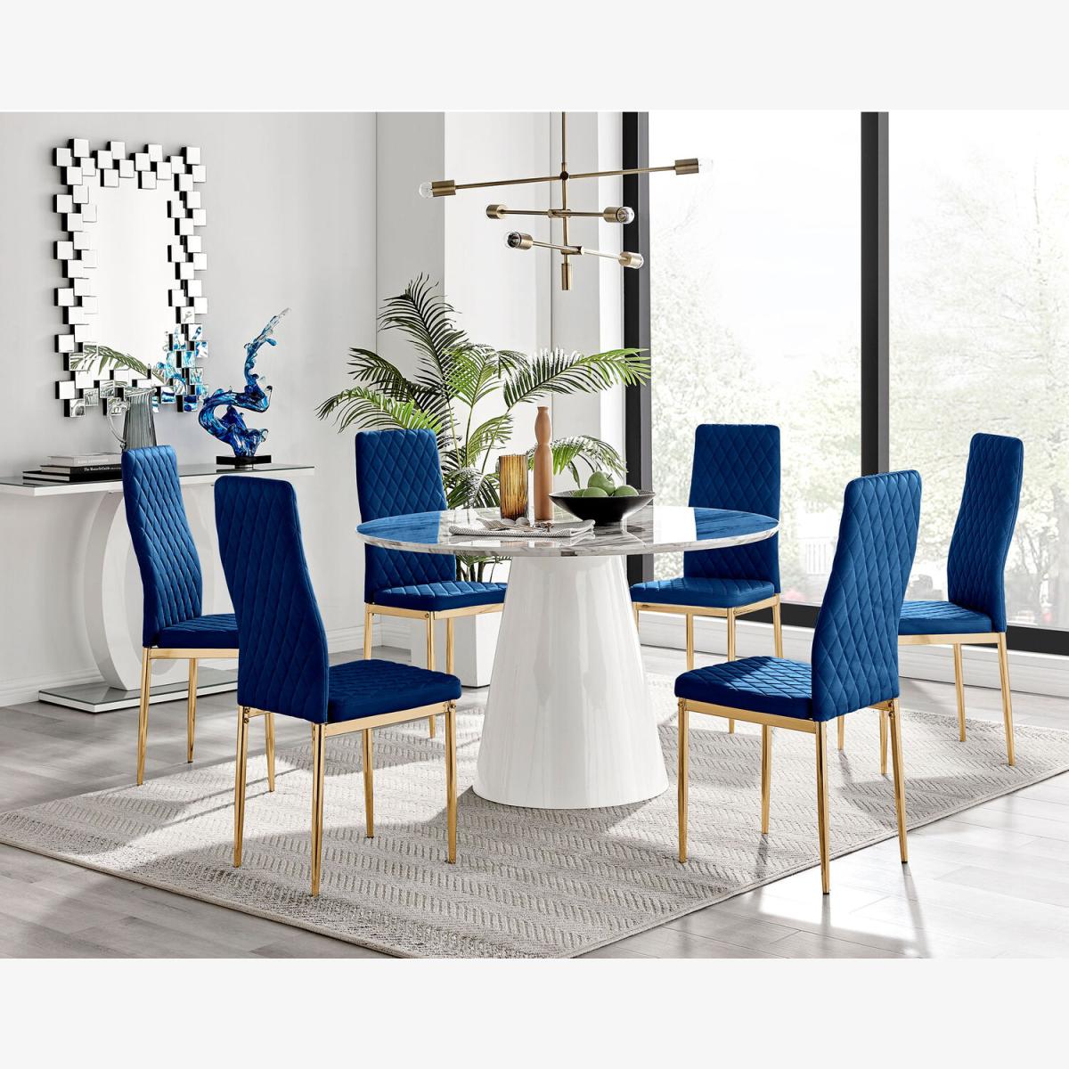 Our stunning Palma table is a round dining table with a large statement tapered central pillar. It's a minimalist post-modern dream! The perfect balance of round and straight lines an uncluttered and elegant dining table solution that will be a real talking point in any modern dining room. The white marble-effect top is very in right now, and is a firm favourite here at Furniturebox UK HQ. Elegant and modern with a touch of that classical chic style. Pair with some bold colours and metallic bursts in your chairs accessories to really make this pop, or keep it chic and simple with some understated tones. Comfortably sits 4 - 6, and is constructed from wood composite with a luxury high-gloss finish. This table is easy to keep clean, durable and will stay gorgeous for years to come. Also available in other colours. Upholstered in soft touch navy blue velvet and finished with diamond pattern stitching the Milan dining chairs would seamlessly fit in with most dining spaces, whilst not compromising on either style or comfort. The stylish gold shiny chrome metal leg and hatched velvet combination gives this chair a contemporary edge, whilst it's simple design allows for practical everyday usage. The chairs are made from high quality durable velvet that's easy to keep clean and are ergonomically designed for maximum comfort and support. They feature a deep foam seat cushion and plastic feet to protect the floor from any damage! At an unbeatable price you cannot go wrong with these chairs!
