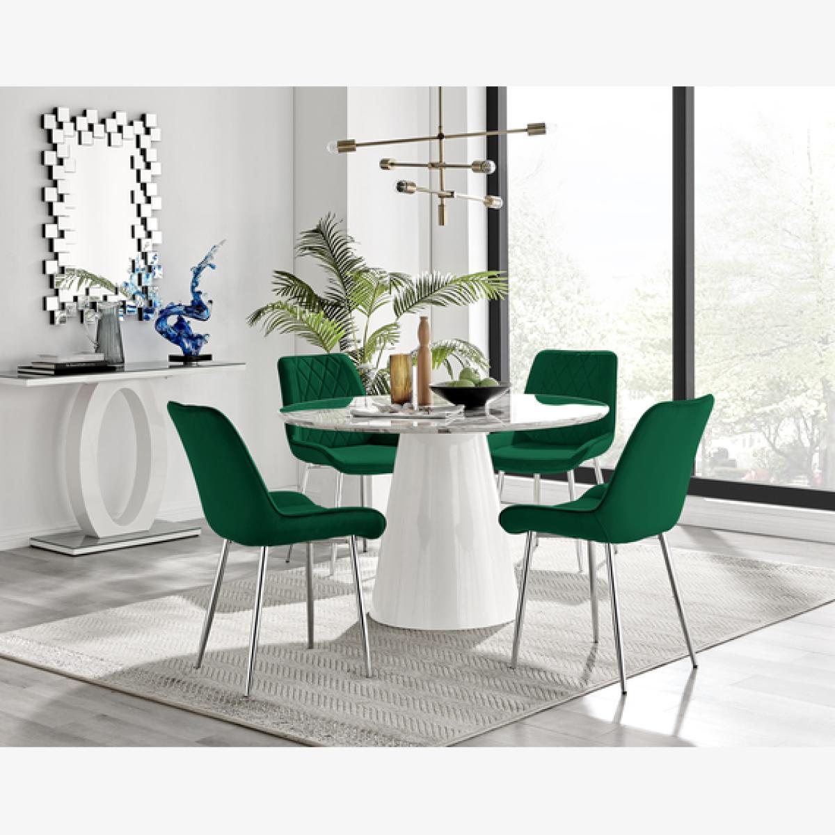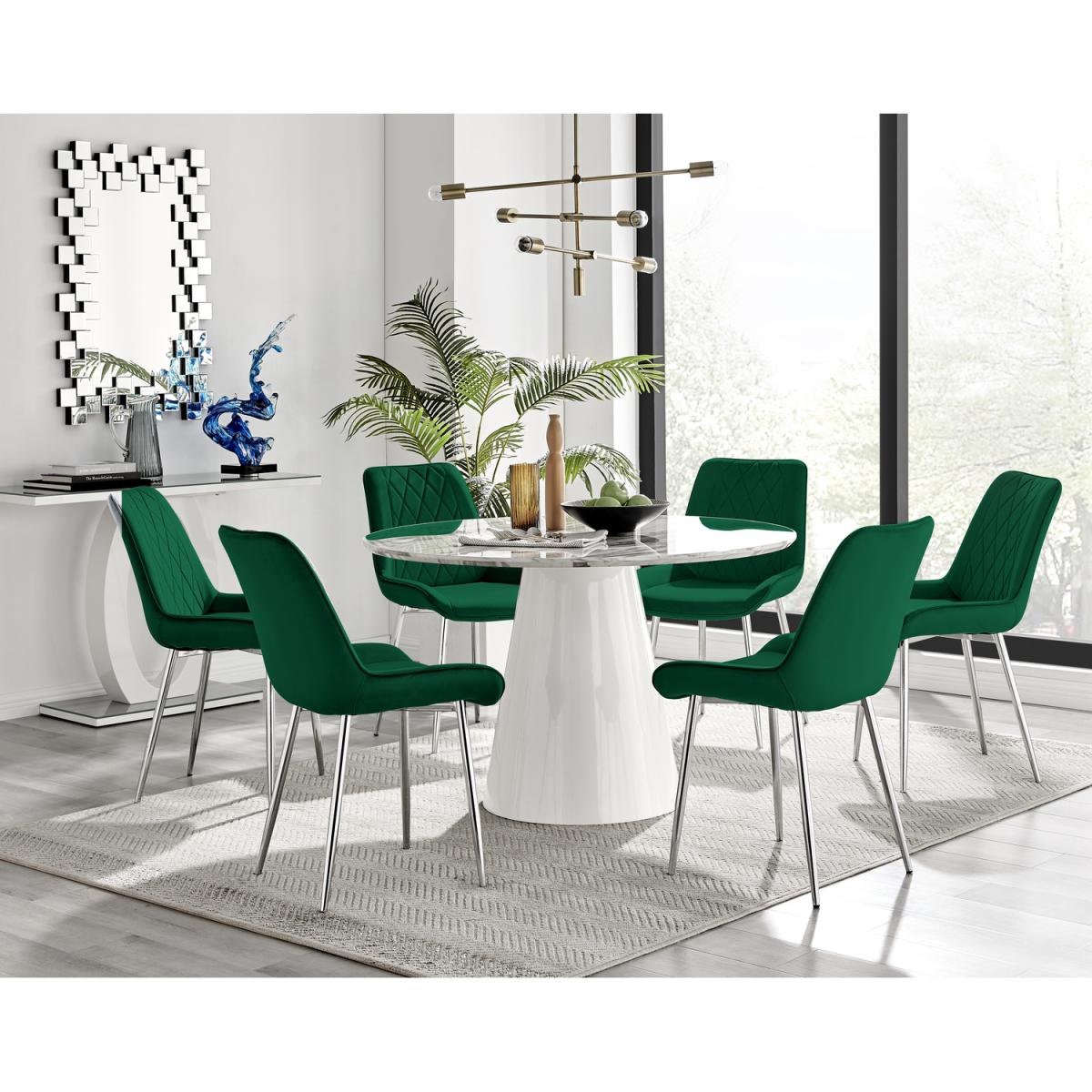 Our stunning Palma table is a round dining table with a large statement tapered central pillar. It's a minimalist post-modern dream! The perfect balance of round and straight lines an uncluttered and elegant dining table solution that will be a real talking point in any modern dining room. The white marble-effect top is very in right now, and is a firm favourite here at Furniturebox UK HQ. Elegant and modern with a touch of that classic chic style. Pair with some bold colours and metallic bursts in your chair's accessories to really make this pop or keep it chic and simple with some understated tones. Comfortably sits 4 - 6, and is constructed from a wood composite with a luxury high-gloss finish. This table is easy to keep clean, durable and will stay gorgeous for years to come. Also available in other colours. Combined with our luxurious velvet upholstered Pesaro dining chairs, this set will shout luxury and style! With a nod to the Mid-century modern design era, the Pesaro chairs feature gorgeous textured diamond stitching with an ergonomically designed curved seat pad blending seamlessly to the supporting medium-high backrest. Sat atop elegant slightly tapered silver legs, these chairs perfectly complement this luxury dining set.