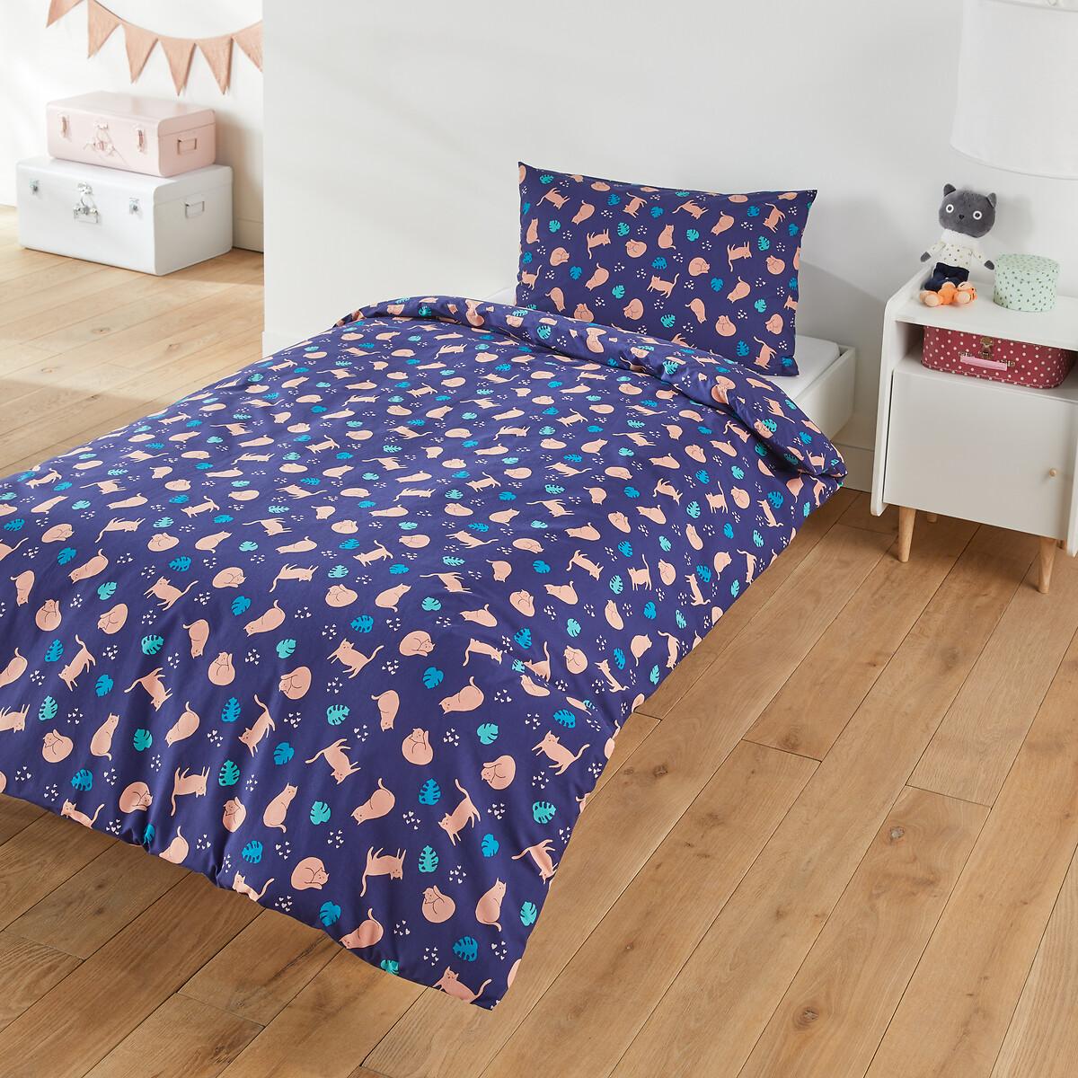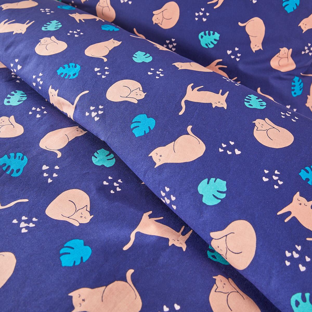 Cotton duvet cover set. Cat patterns on a blue background. Ultra soft and comfortable pure cotton. The set includes a duvet cover and its matching pillowcase. Product Details • 100% cotton • 144 thread count • Print front and back • Envelope-style opening. Care Advice • Machine washable at 60°C • By washing your laundry at 40°C instead of 60°C, you limit energy consumption. Sizes • Duvet cover 140 x 200cm + 1 pillowcase 50 x 70cm: Single • OEKO-TEX® Standard 100. Standard 100 certification by OEKO-TEX® tests textile products for harmful substances via an independent, international label.