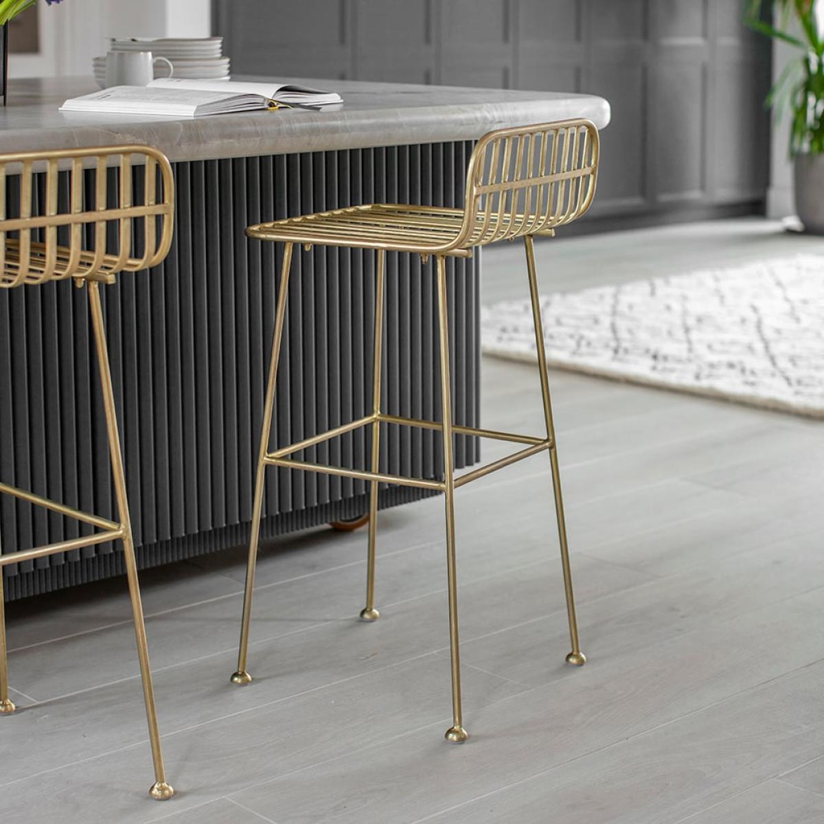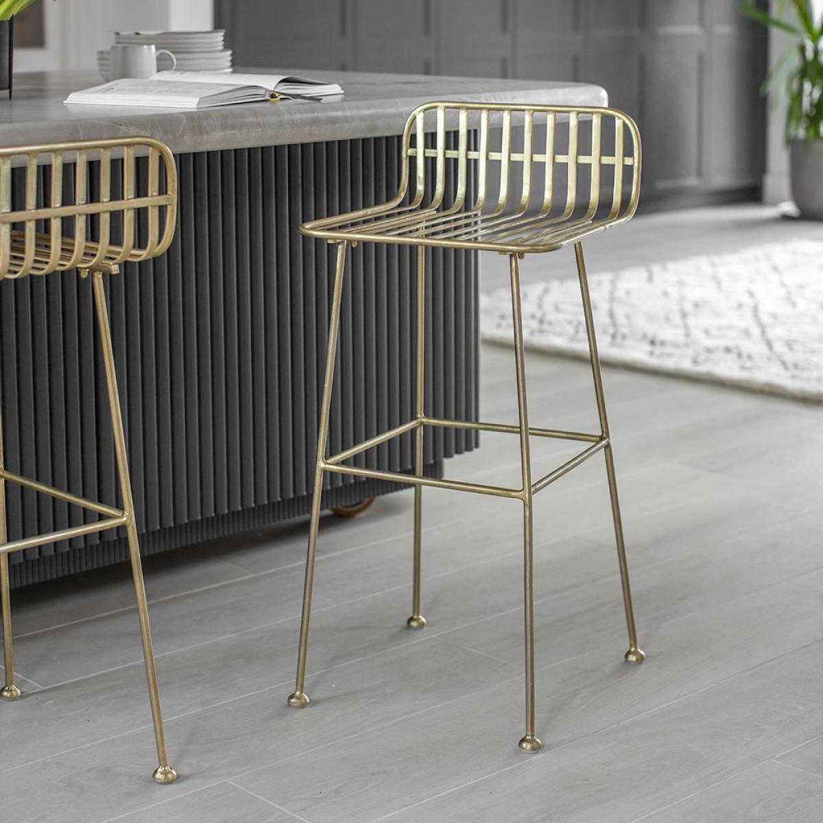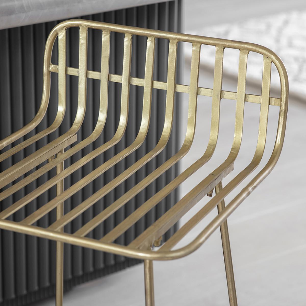 Elegant and understated, our Paloma Metal Barstool in Brass is a sleek and contemporary barstool. This contemporary style bar stool has a beautifully contoured one-piece seat and half back for a refined silhouette that will perfectly complement any kitchen island or breakfast bar. This brass barstool is expertly crafted from luxurious brass-finish iron strips. For a cohesive look in an open-plan kitchen-diner, we also have a matching Paloma dining chair, which is sold as a set of two.