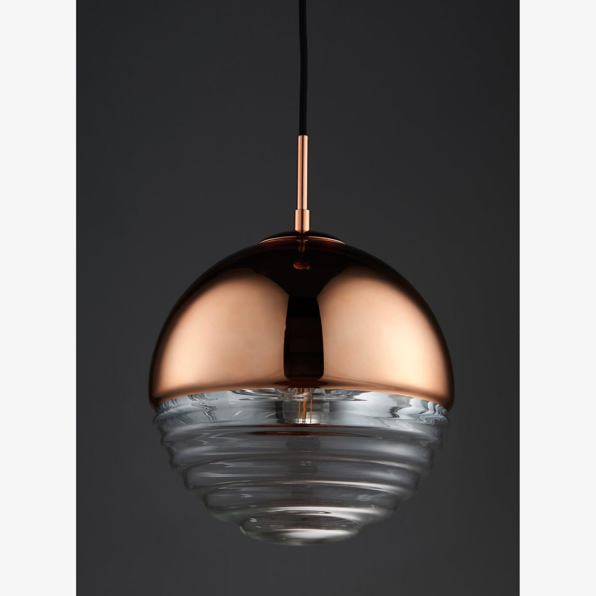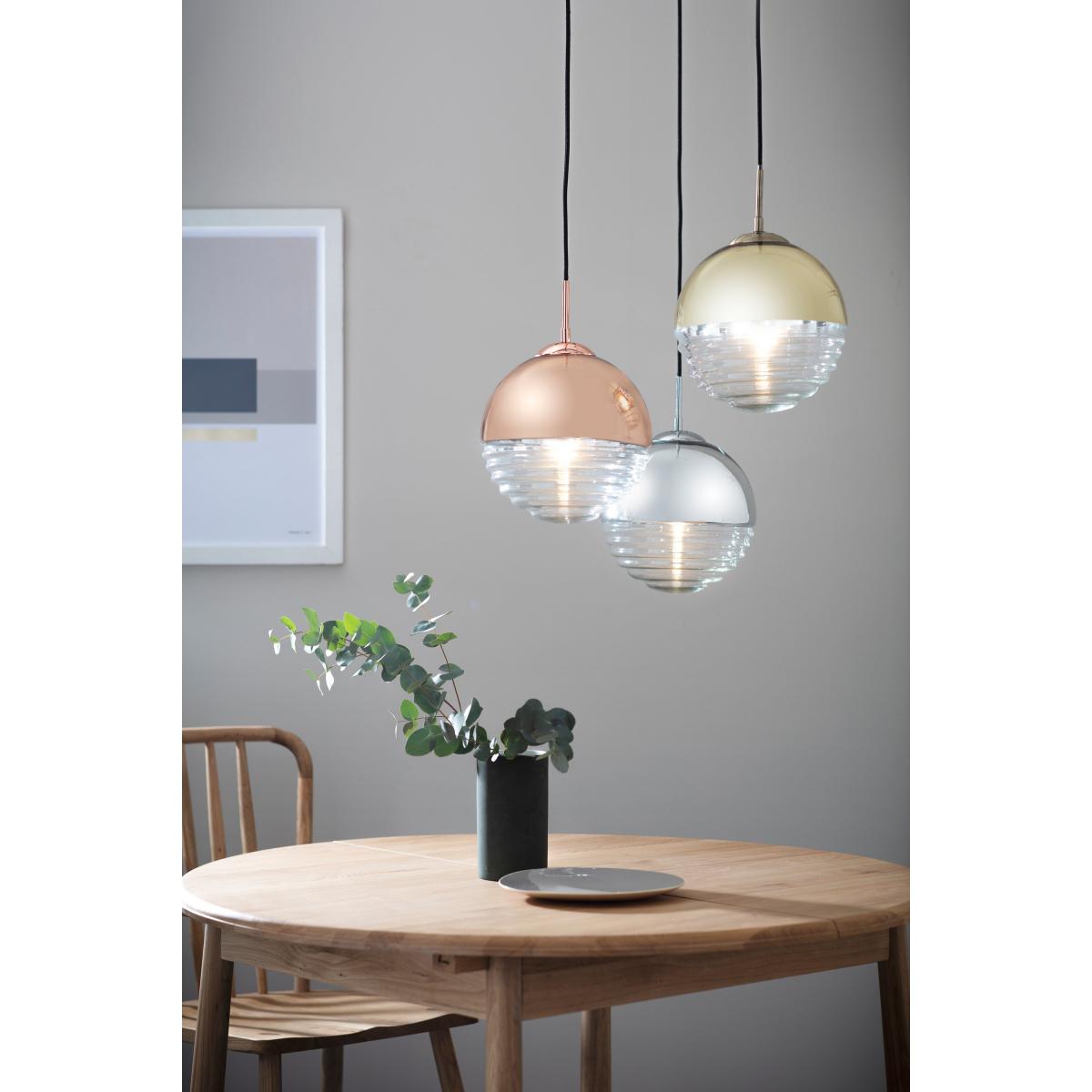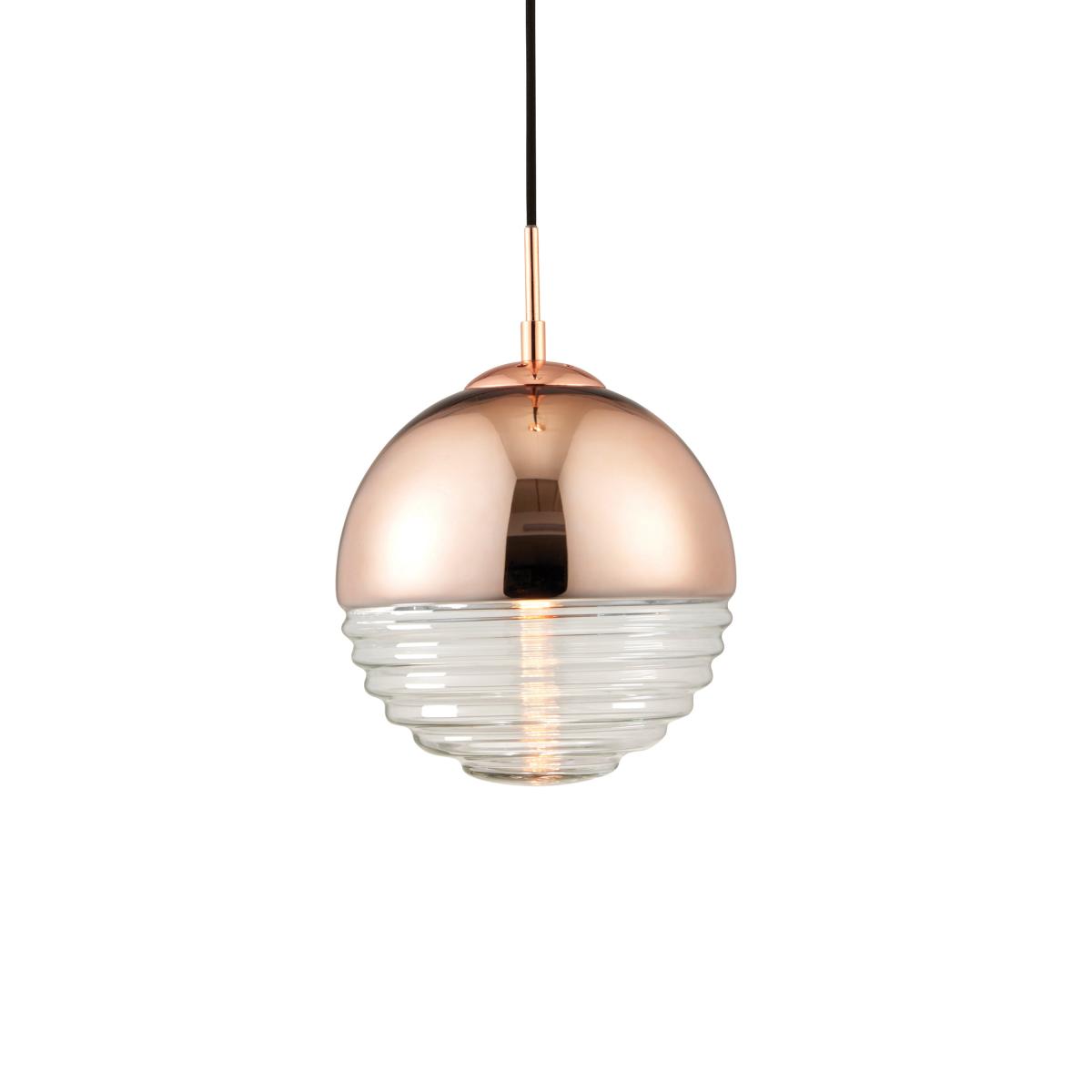 A simple, copper plated and clear ribbed spherical ceiling pendant. Adjustable drop, suitable for use with LED lamps and dimmable. Other colour options available.