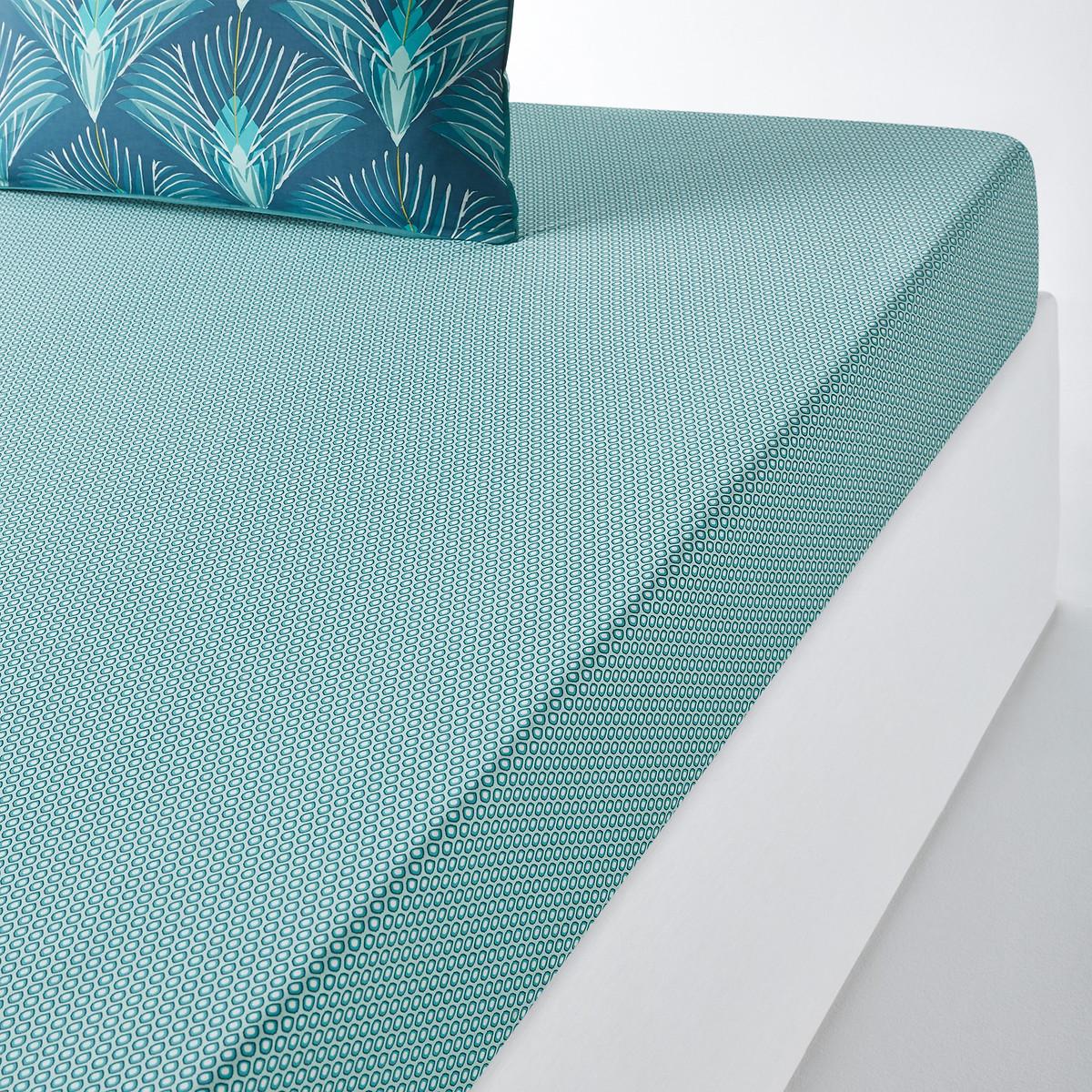 The Pampelune cotton percale fitted sheet. A pattern directly inspired by the art deco trend where geometry and sobriety of patterns take over interior decor for our greatest pleasure!The cotton percale offers a pleasant feeling of freshness and lightness. Its tight weave makes it particularly soft for premium comfort. A matte and smooth material that will soften over time. Product Details • 100% cotton • Percale • 200 thread count: The higher the thread count, the higher the quality of the weave • Micro graphic pattern print • For mattress height 25cm. Care Advice • Machine washable at 60°C • By washing your laundry at 40°C instead of 60°C, you limit energy consumption. Sizes • 90 x 190cm: Single • 140 x 190cm: Double • 160 x 200cm: King • 180 x 200cm: Super King • OEKO-TEX® Standard 100. Standard 100 certification by OEKO-TEX® tests textile products for harmful substances via an independent, international label.