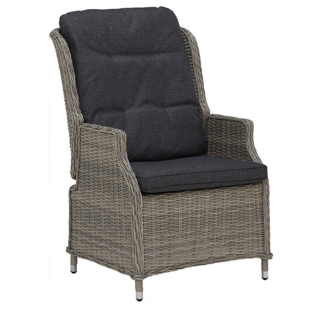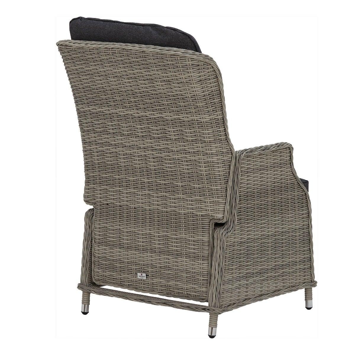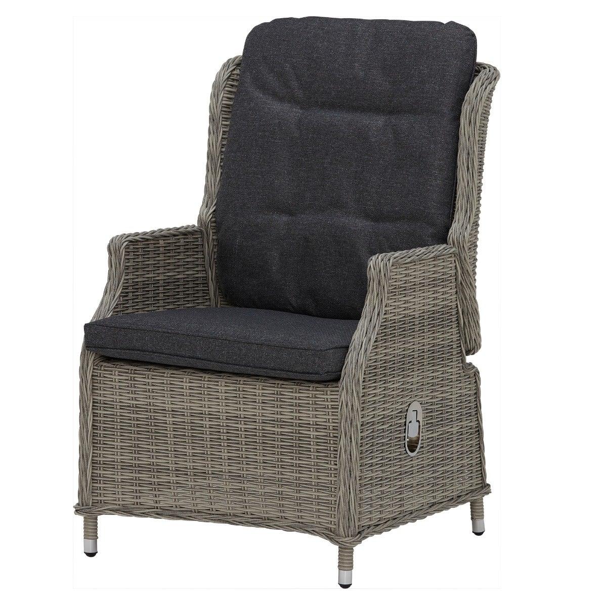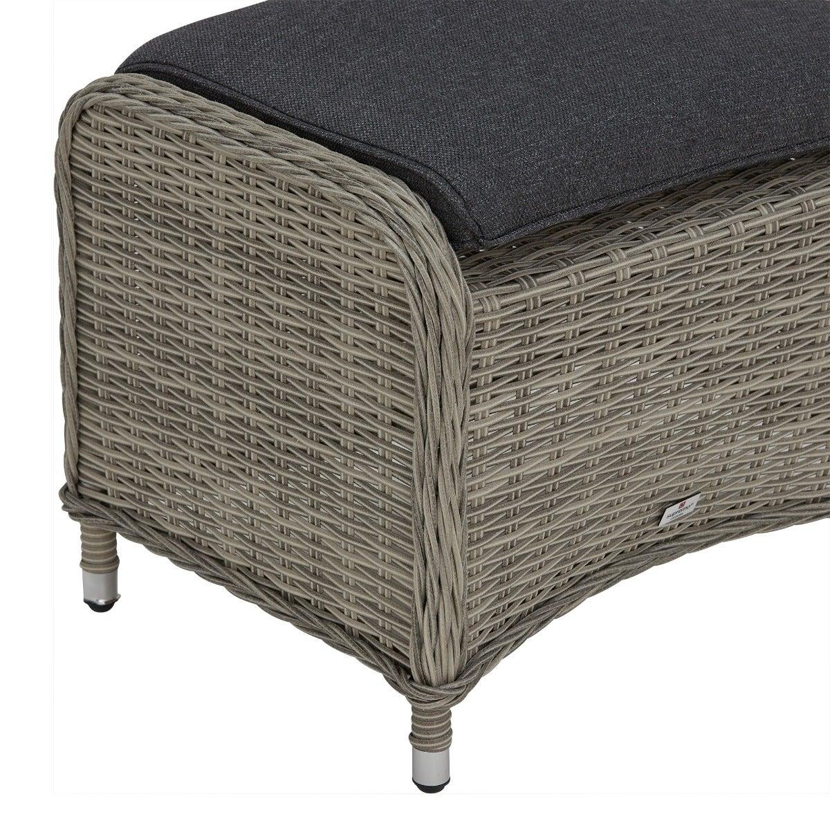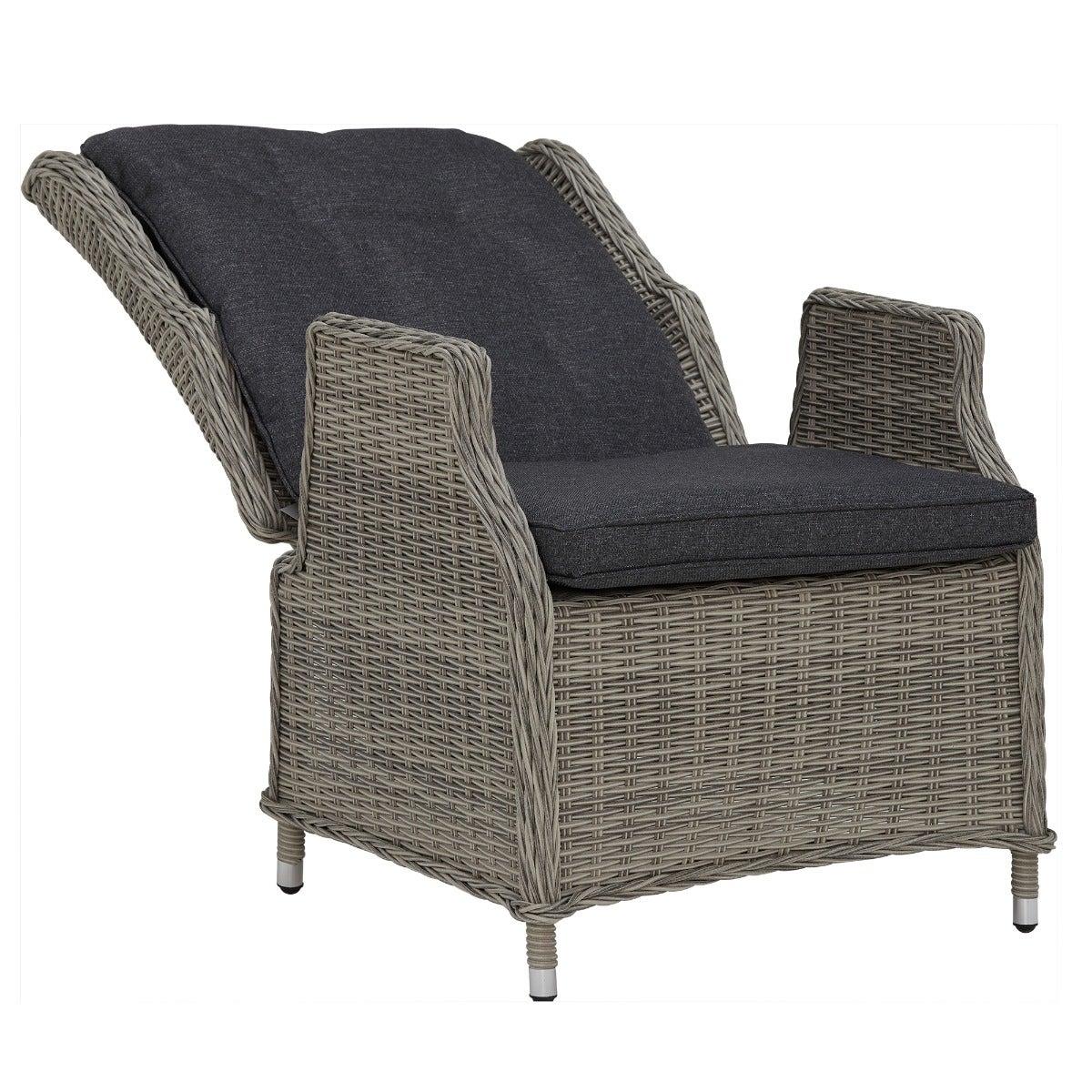 Design. In contemporary grey tones, the Pamplona reclining garden lounge set features rattan weave and all-weather fabric for lasting quality. The generously cushioned backrest can be adjusted by a lever, so you can lay back in luxury when the sun shows its face. These reclining garden chairs come complete with footstools for added comfort, while the matching side table helps keep those summer essentials on hand.