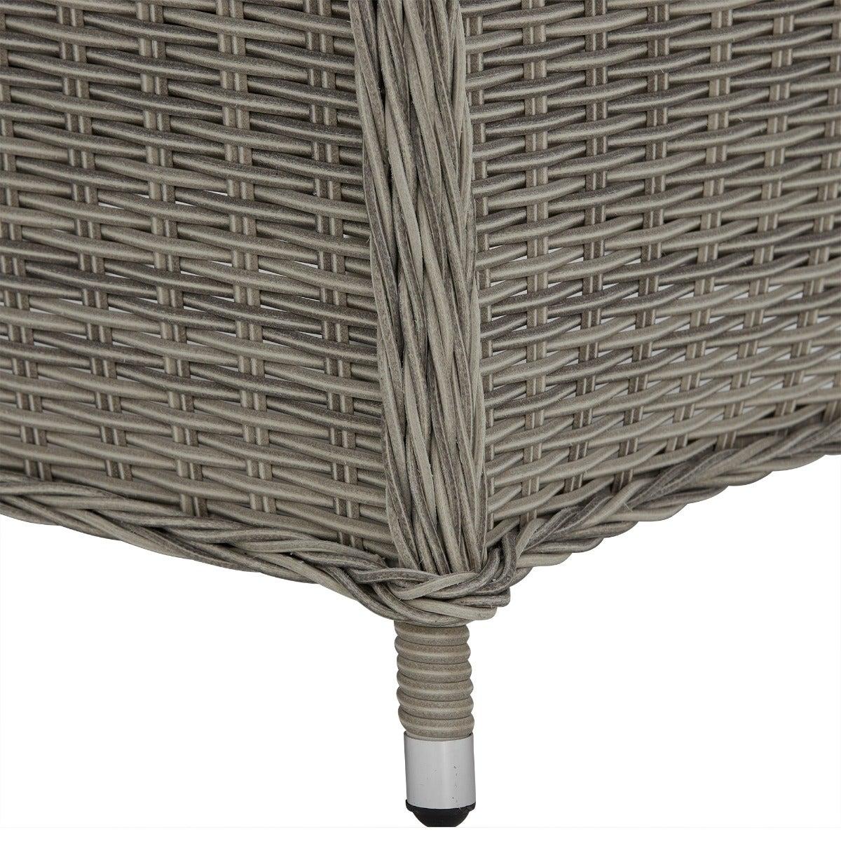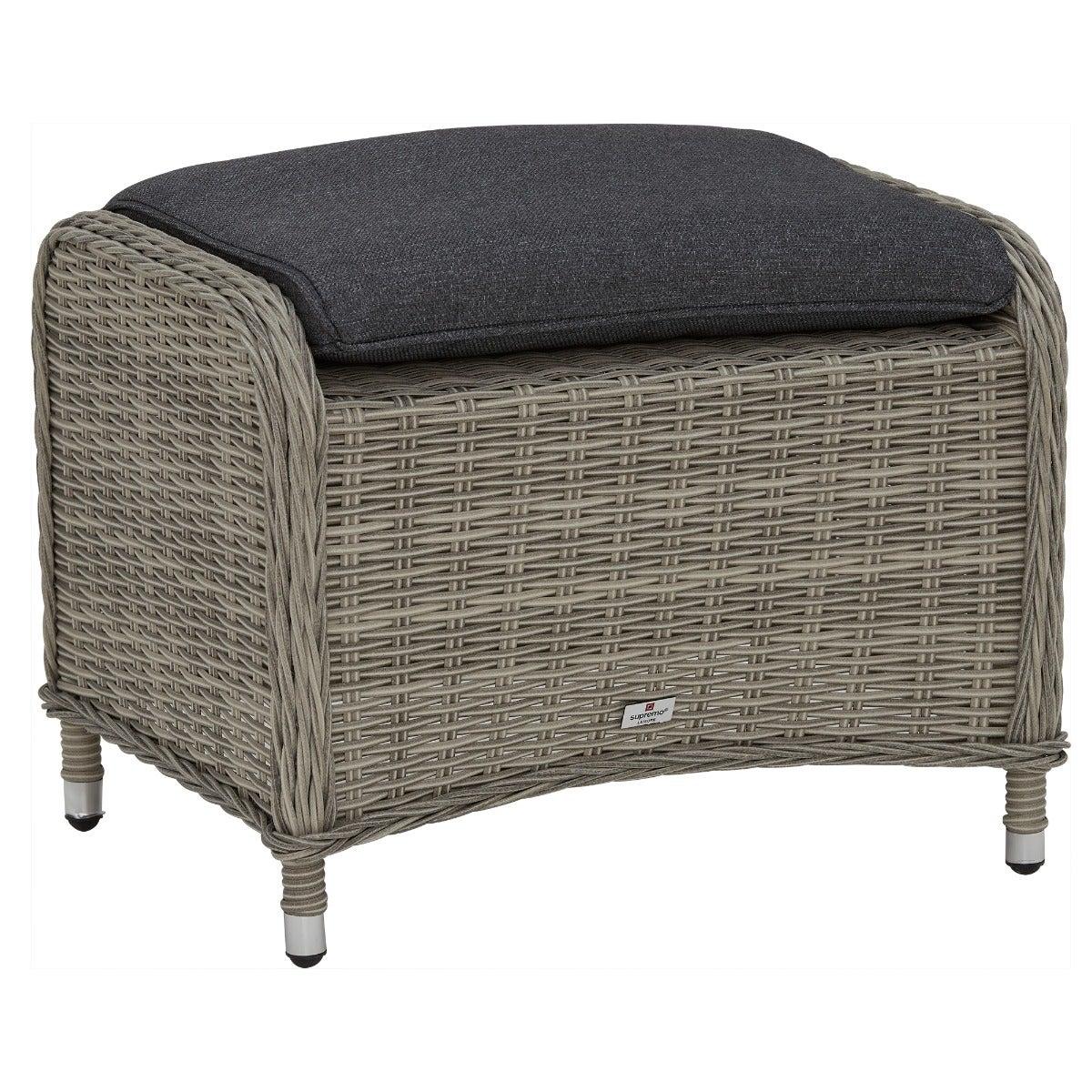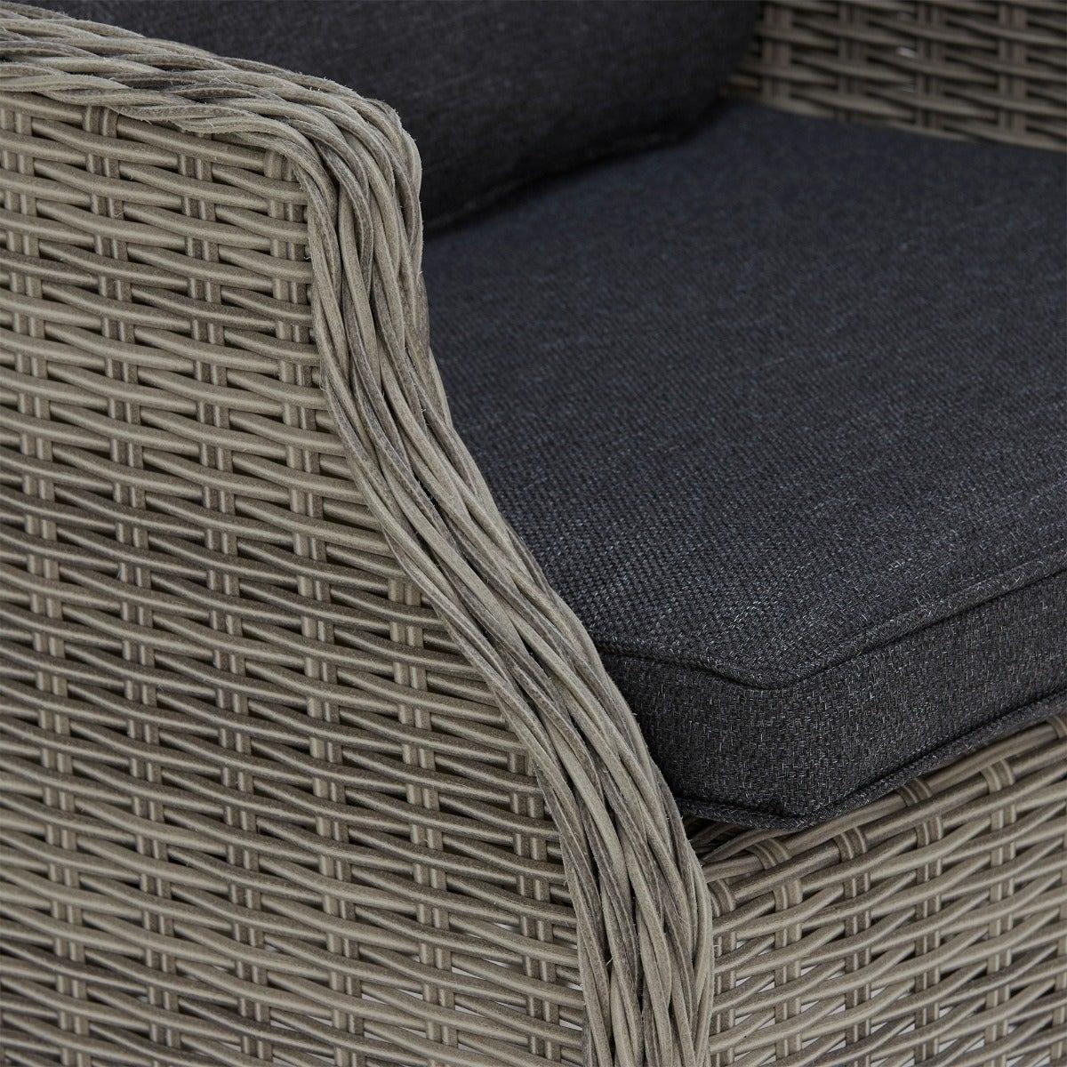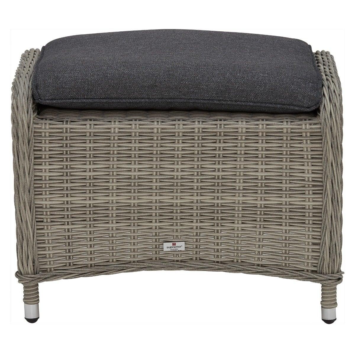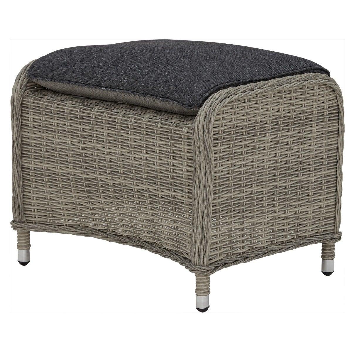 Design. In contemporary grey tones, the Pamplona reclining garden lounge set features rattan weave and all-weather fabric for lasting quality. The generously cushioned backrest can be adjusted by a lever, so you can lay back in luxury when the sun shows its face. These reclining garden chairs come complete with footstools for added comfort, while the matching side table helps keep those summer essentials on hand.