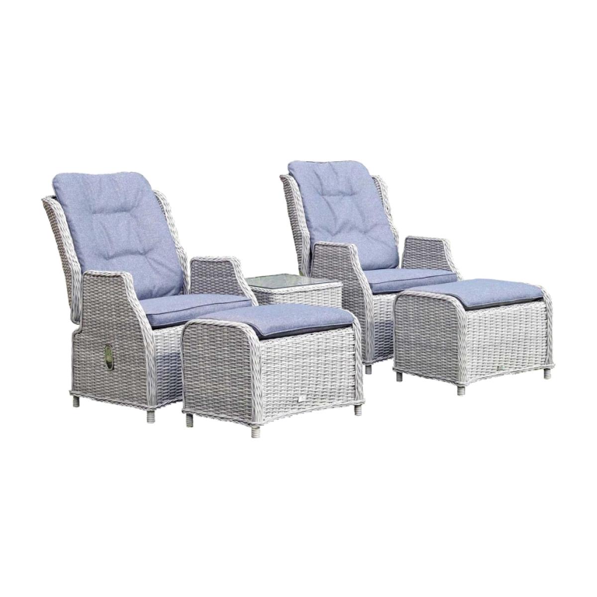 Design. In contemporary grey tones, the Pamplona reclining garden lounge set features rattan weave and all-weather fabric for lasting quality. The generously cushioned backrest can be adjusted by a lever, so you can lay back in luxury when the sun shows its face. These reclining garden chairs come complete with footstools for added comfort, while the matching side table helps keep those summer essentials on hand.