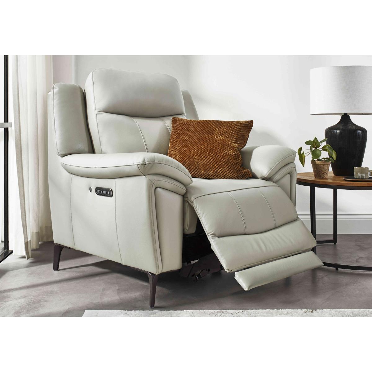 When we asked our designers to create a range of sofas and chairs that epitomised both modern comfort and modern style, they did not disappoint. Named Panache for its dashing good looks and bold approach to relaxation, this range delivers on every front. As well as a stylish open-base look with high backs, elegant lines and metal legs, the collection’s sofas and armchairs offer an unprecedented array of comfort features. Sprung seats and pocket sprung seat cushions come as standard and it’s easy to upgrade to power recliners, power headrests and even heated seats. Handcrafted exclusively for Furniture Village, the Panache range is available with 100% leather and fabric upholstery. It’s the armchair that dreams are made of. Power recliner, power headrest, pocket sprung seat cushioning and even a heated seat. Handcrafted. Why you'll love it Comfort with style – that’s this Panache power reclining armchair. Enjoy sumptuous curves, striking details and remarkable relaxation. Plus the peak of Panache – a luxuriously cosy heated seat. With relaxation-ready power recliner and power headrest. Extra power features include USB and USB-C charging and safety lock. This chair also has an ultra-comfy pocket sprung seat cushion. Its sprung seat promises excellent support. Contemporary open-base look with a high back and metal legs. Beautifully soft 100% leather upholstery in a wide choice of colours. Also available in an extensive range of fashionable fabrics. Handcrafted. Only at Furniture Village. This leather power recliner chair with a heated seat is part of our Panache range. What you need to know Medium comfort level. Seat suspension: sinuous spring. Seat cushioning: pocket spring, foam and Dacron. Seat cushioning is fixed. Back suspension: webbing. Back cushioning: fibre. Back cushioning is fixed. Arm cushioning: foam and Dacron. Feet and back are removable. Please allow time for new recliners to ease. Minor gaps are necessary to ensure ease of recliner motion and may be exaggerated depending on floor type. Leather has unique marks and characteristics with variation in colour and texture. Leather softens with use. Smoothing the tops of leather cushions prevents signs of visual comfort. Please read our upholstery care guide for more advice.