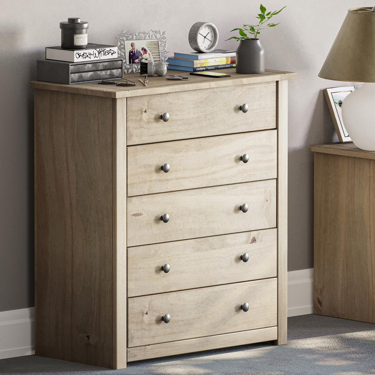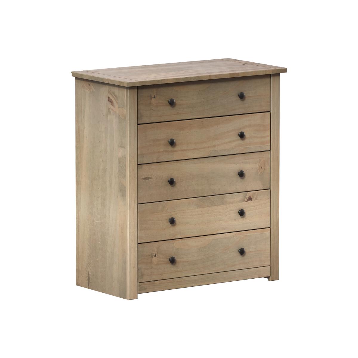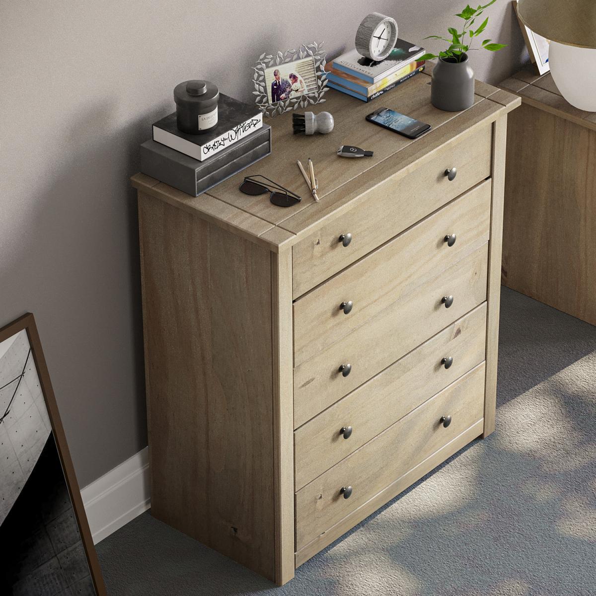 This ultra modern Panama 5 Drawer Chest of Drawers is classy and boasts a rustic style. The chest is beautifully finished in a natural oak wax which preserves the wood yet still allows the natural beauty of the wood grain to show through. This chest features five wide drawers ensuring ample storage for all of your folded garments. Furthermore, the top surface will easily accommodate a small TV.