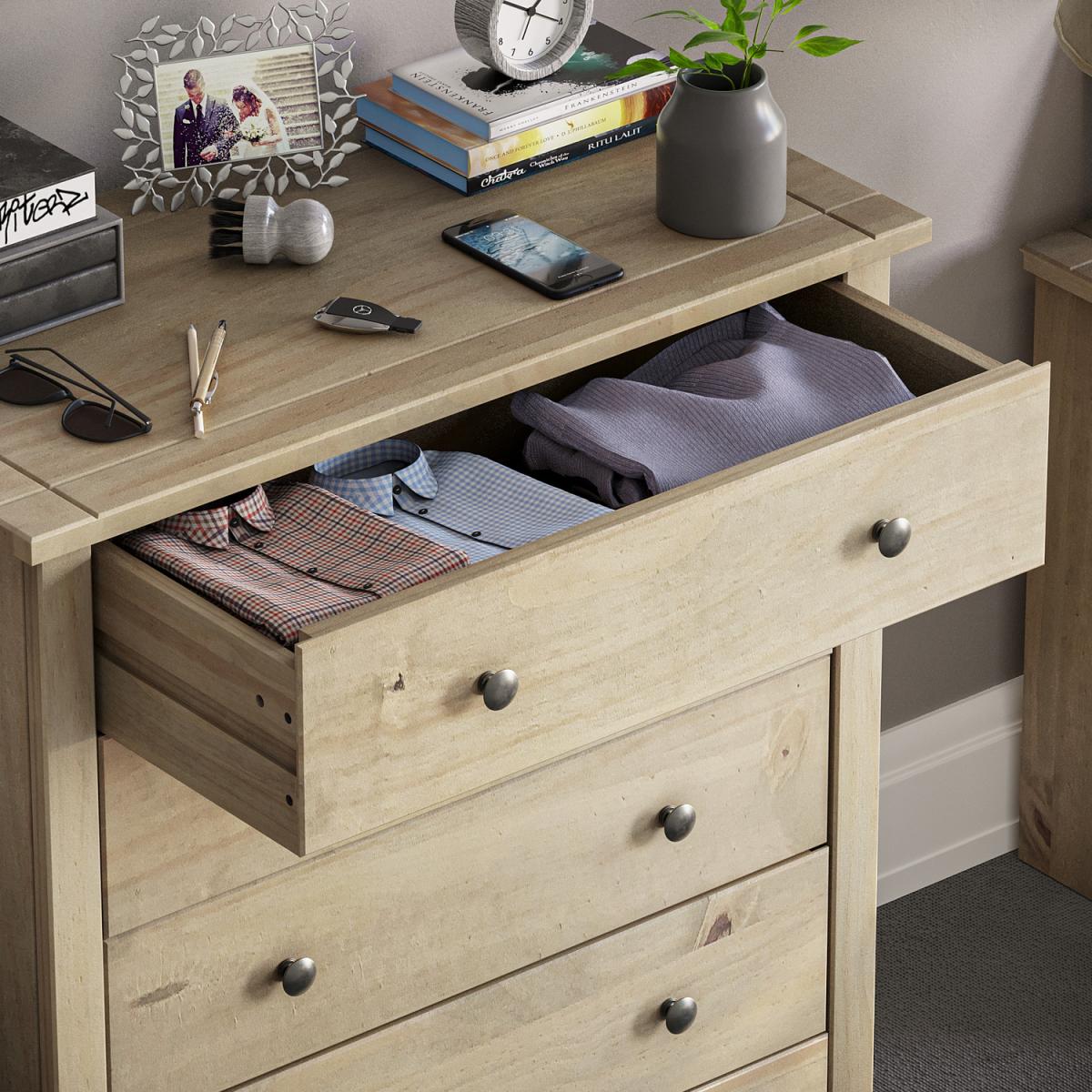 I’m a fan of the Panama chest in pine because its warm, knotty finish brings a relaxed, natural feel without looking overly rustic. It works especially well in Scandi-inspired or coastal settings, but equally complements a modern farmhouse scheme by adding texture and subtle character. For styling, keep the top clear or gently layered - a slim table lamp, a small stack of books and a pot plant make an uncluttered vignette. Colour-block or label the drawers inside to keep linens or wardrobe bits organised, and try pairing the chest with white or muted-grey walls to let the pine stand out.