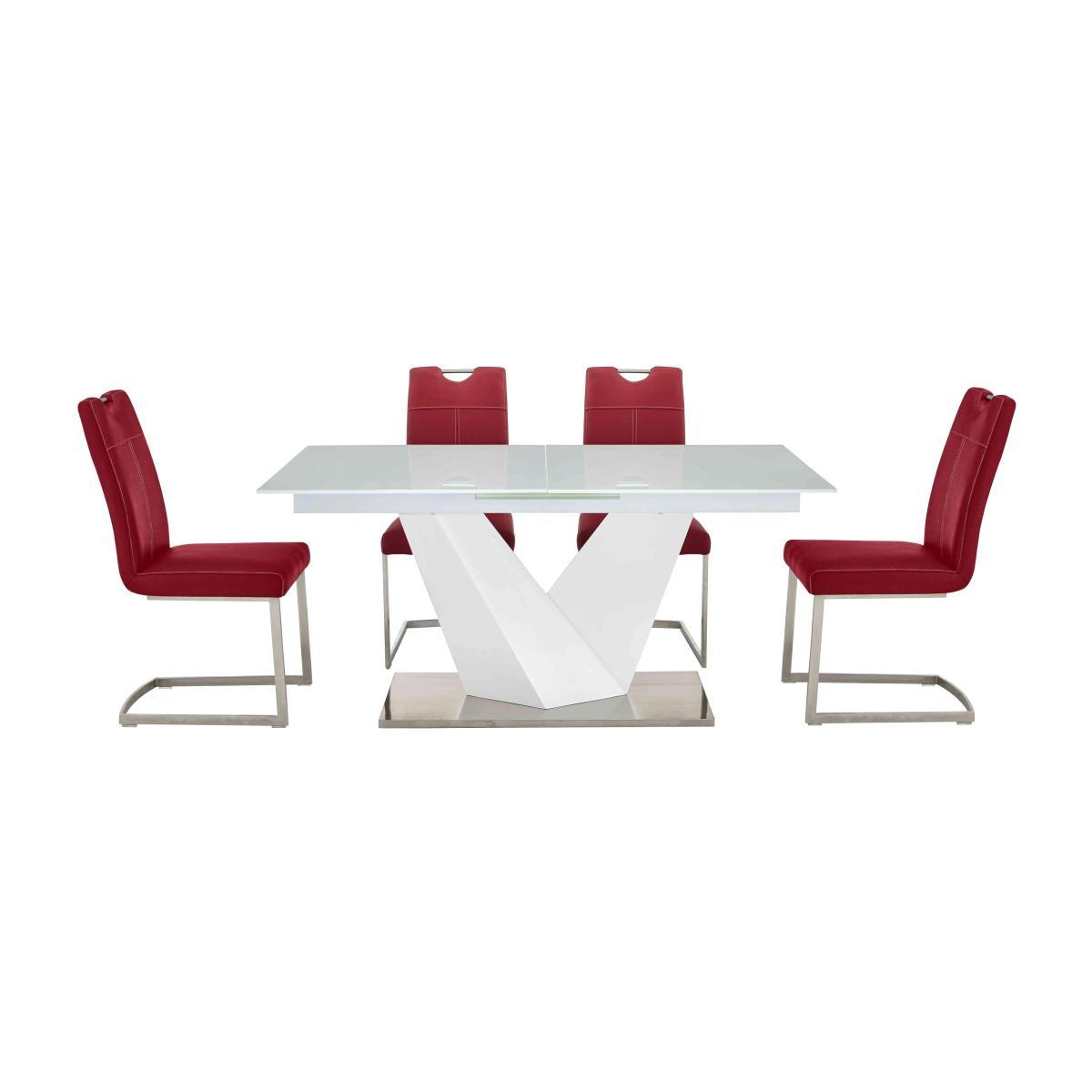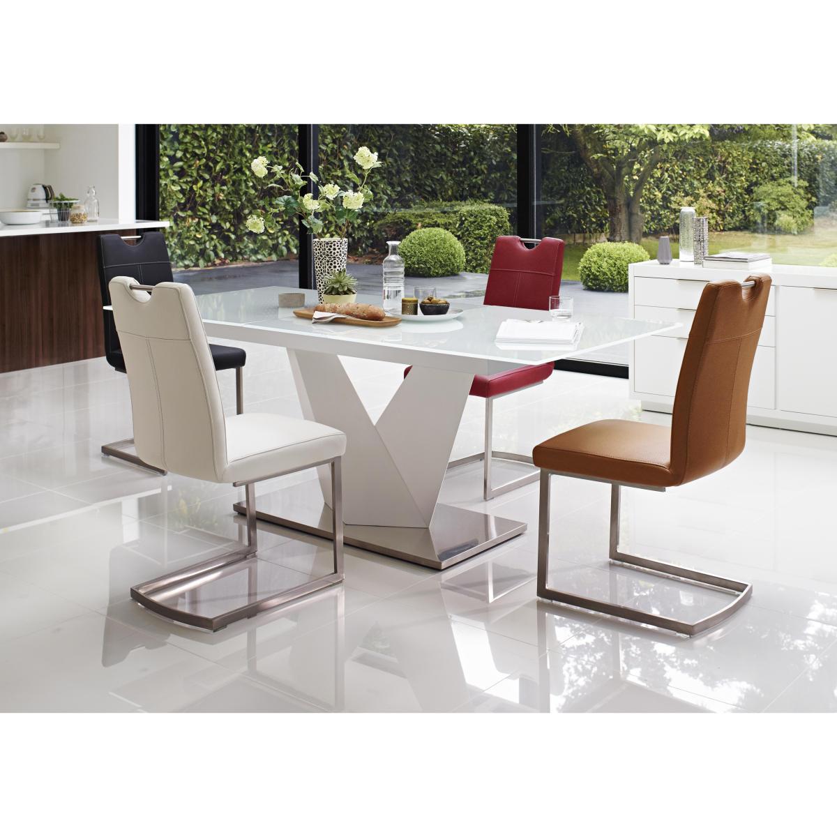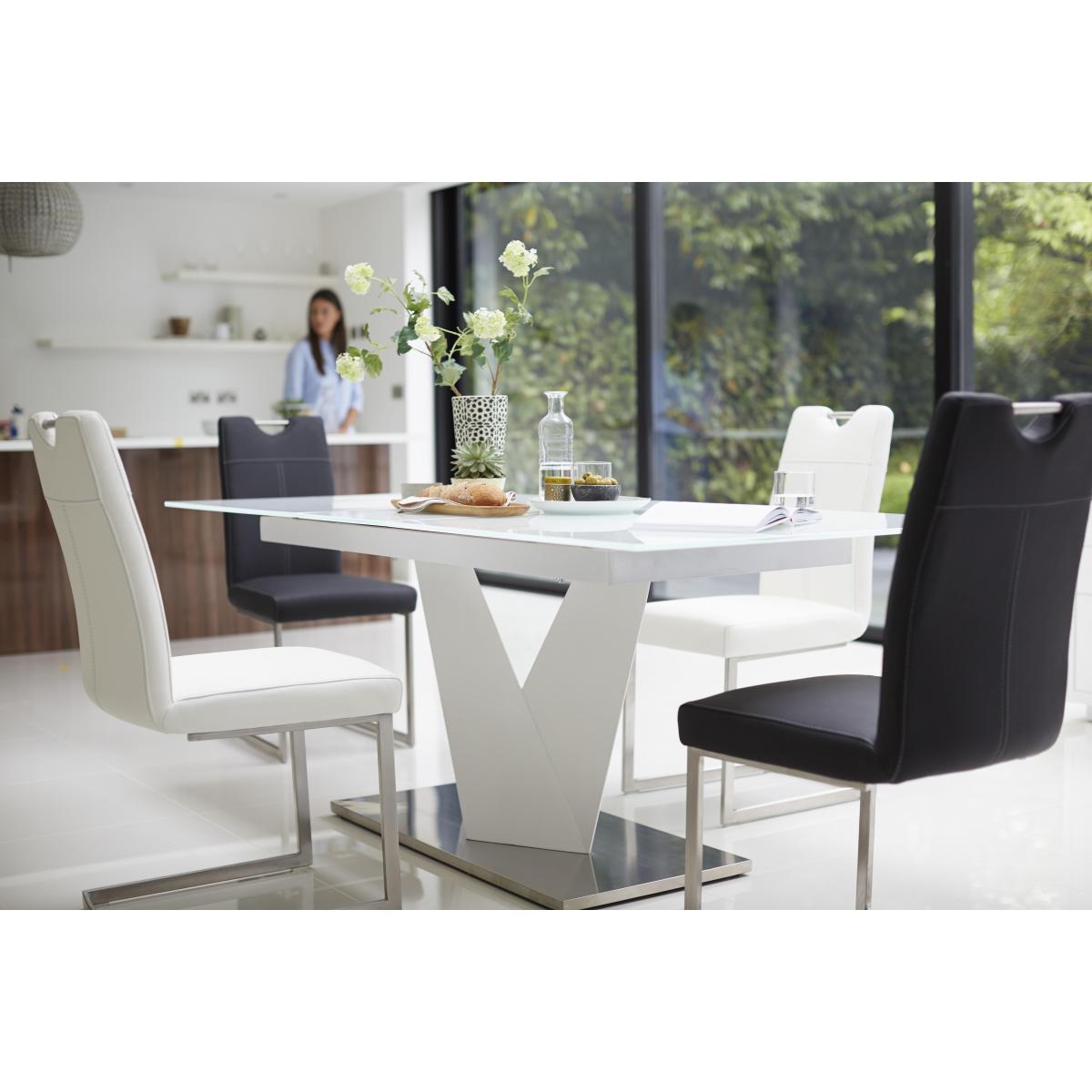The striking Panama dining collection has a bright, high gloss white finish. A V shaped pedestal on brushed steel base gives the extending glass topped dining table its unique ultra modern style. The table to seat eight with ease. Faux leather upholstered dining chairs with brushed steel cantilevered legs and a glossy white sideboard complete the collection. Exclusively designed for Furniture Village. Bright, white lacquered designer dining set seats up to 8. White glass table top is beautiful and easy to care for. Sculptural V-shaped pedestal with white lacquered finish. Pedestal sits on a brushed stainless steel base. Table extends to seat 8 with easy to operate one-handed mechanism. Chairs have brushed steel cantilevered bases and feature stitching. Faux leather upholstery in a choice of 6contemporary colours. An ultra modern, ultra stylish choice.