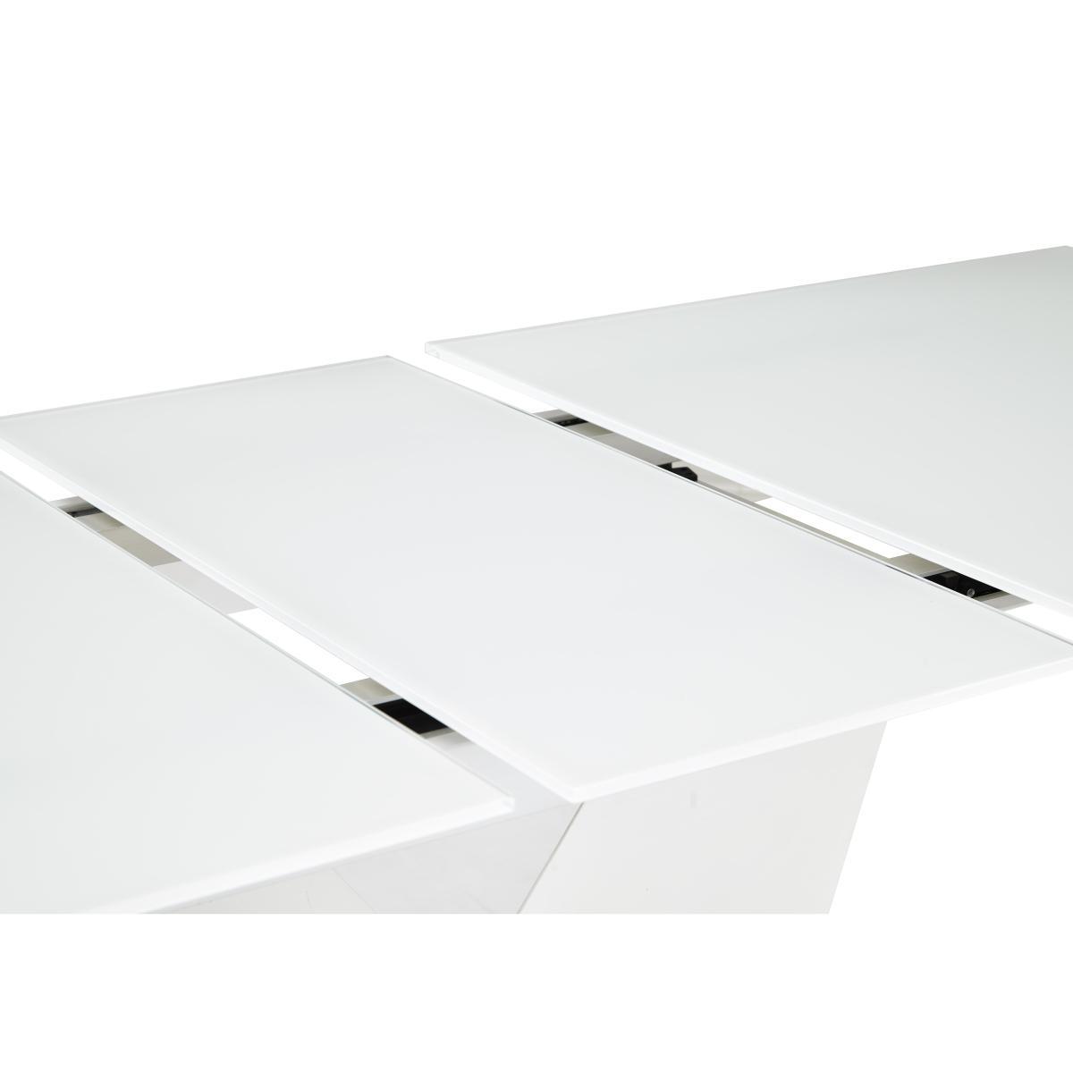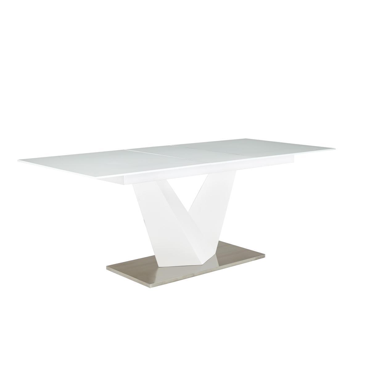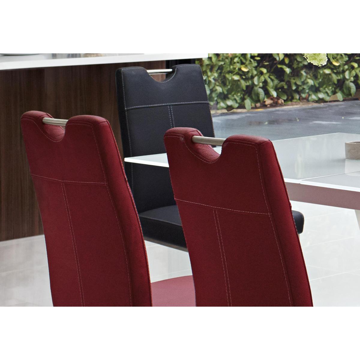 The striking Panama dining collection has a bright, high gloss white finish. A V shaped pedestal on brushed steel base gives the extending glass topped dining table its unique ultra modern style. The table to seat eight with ease. Faux leather upholstered dining chairs with brushed steel cantilevered legs and a glossy white sideboard complete the collection. Exclusively designed for Furniture Village. Bright, white lacquered designer dining set seats up to 8. White glass table top is beautiful and easy to care for. Sculptural V-shaped pedestal with white lacquered finish. Pedestal sits on a brushed stainless steel base. Table extends to seat 8 with easy to operate one-handed mechanism. Chairs have brushed steel cantilevered bases and feature stitching. Faux leather upholstery in a choice of 6contemporary colours. An ultra modern, ultra stylish choice.