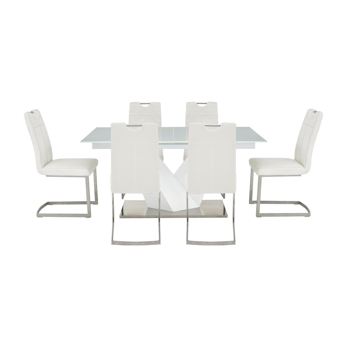 The striking Panama dining collection has a bright, high gloss white finish. A V shaped pedestal on brushed steel base gives the extending glass topped dining table its unique ultra modern style. The table to seat eight with ease. Faux leather upholstered dining chairs with brushed steel cantilevered legs and a glossy white sideboard complete the collection. Exclusively designed for Furniture Village. It’s bright, it’s white and it’s wonderfully sleek and shiny. The Panama extending table with six chairs is made for the modern home. Why you'll love it. Bright, white lacquered designer dining set seats up to 8. White glass table top is beautiful and easy to care for. Sculptural V-shaped pedestal on a brushed stainless steel base. Table extends with one-handed mechanism. Chairs have brushed steel cantilevered legs and feature stitching. The chair seats and backs are comfortably foam cushioned. With faux leather upholstery in a choice of fashionable shades. An ultra-modern, ultra-stylish choice. What you need to know. Table seats 6, or 8 when opened out. Dining chairs have cantilever style, brushed steel legs. See our Dining care guide for advice on looking after your dining table. Faux leather is water-resistant and easy to clean. Hairline marks are a natural feature of this furniture's lacquered high gloss finish. High gloss surfaces can reveal the polishing process in the form of small scratches. Avoid abrasive cleaners and direct sunlight. Wipe clean with a damp cloth and dry with a soft duster. Coasters and placemats are recommended. Part of the modern Panama dining range.