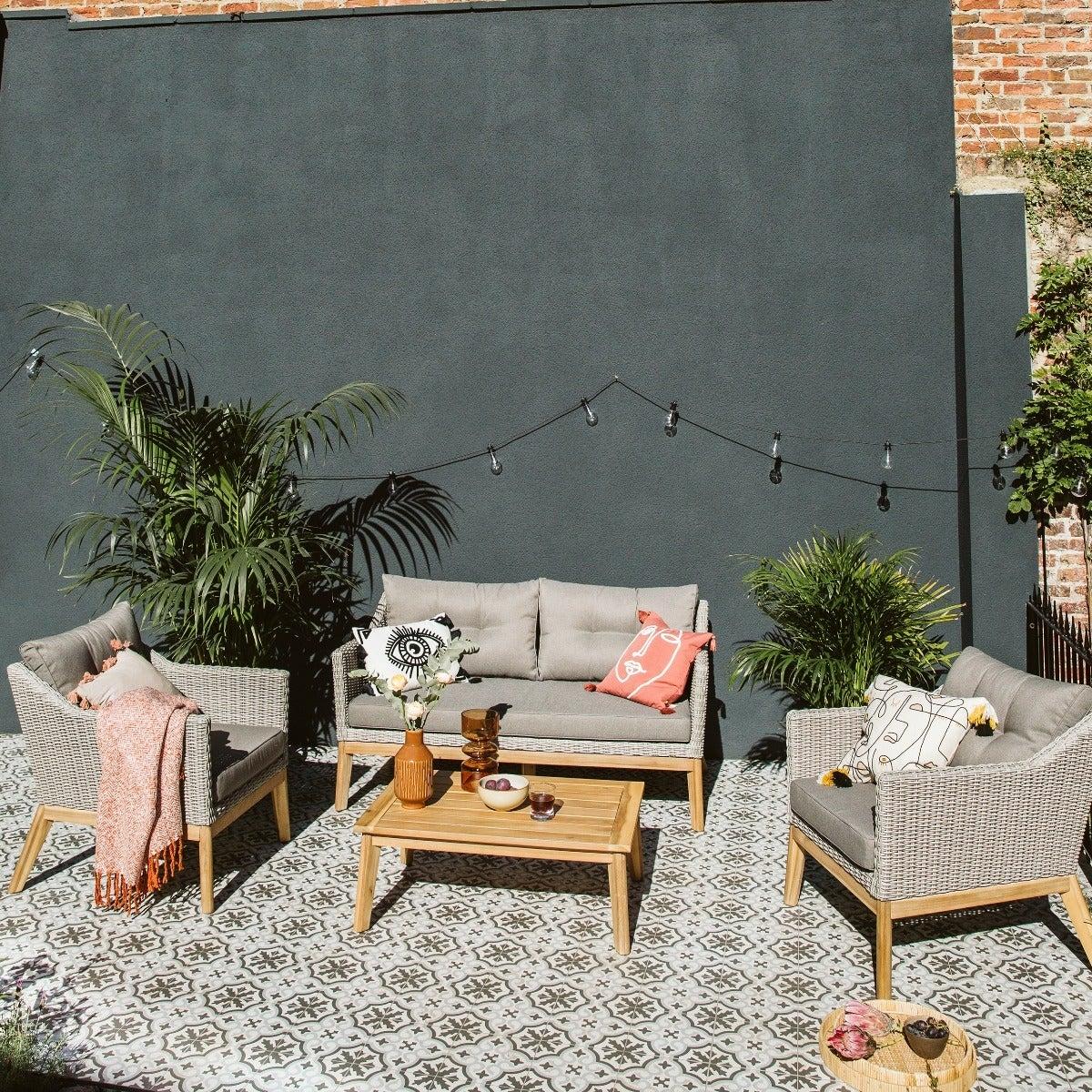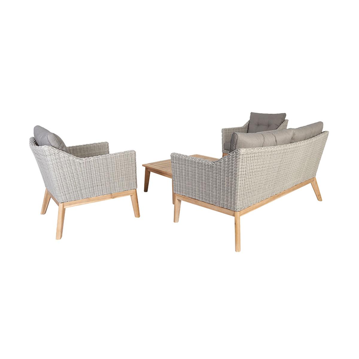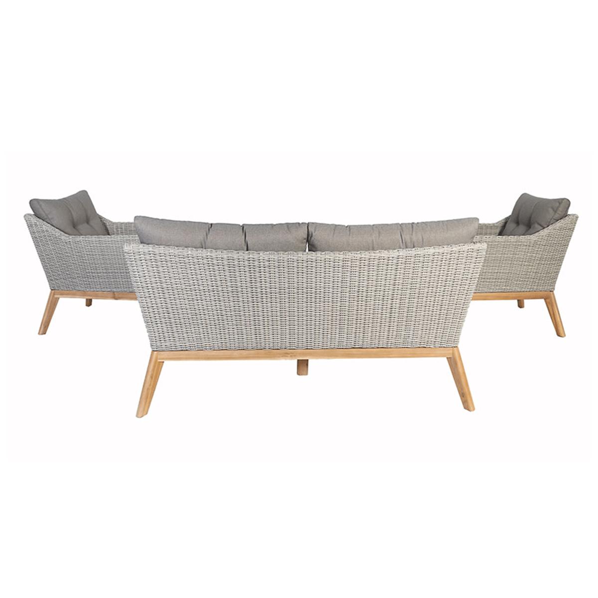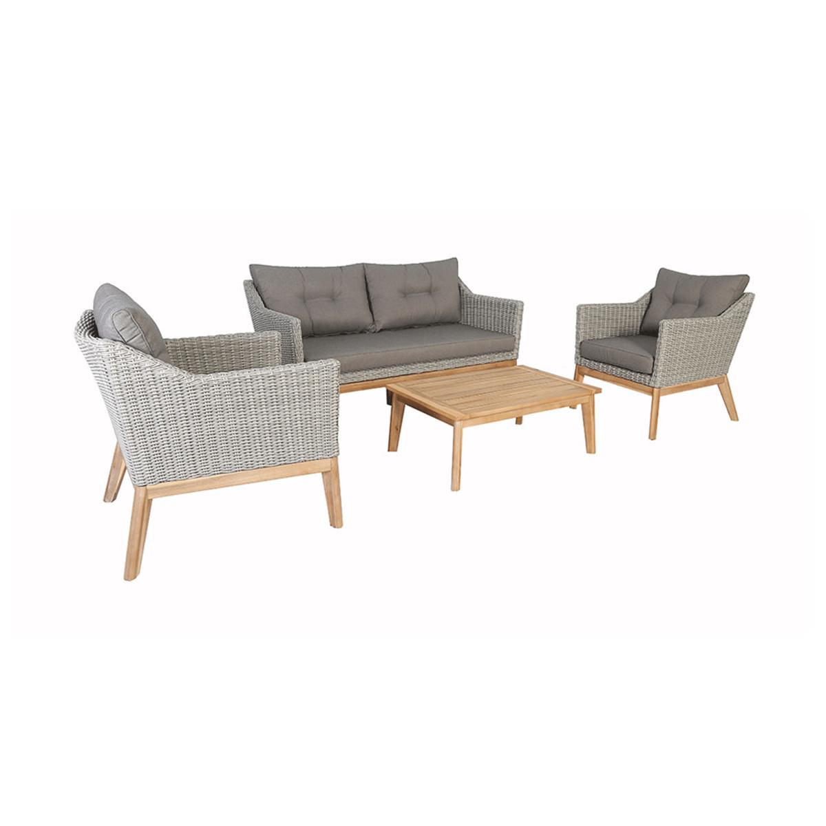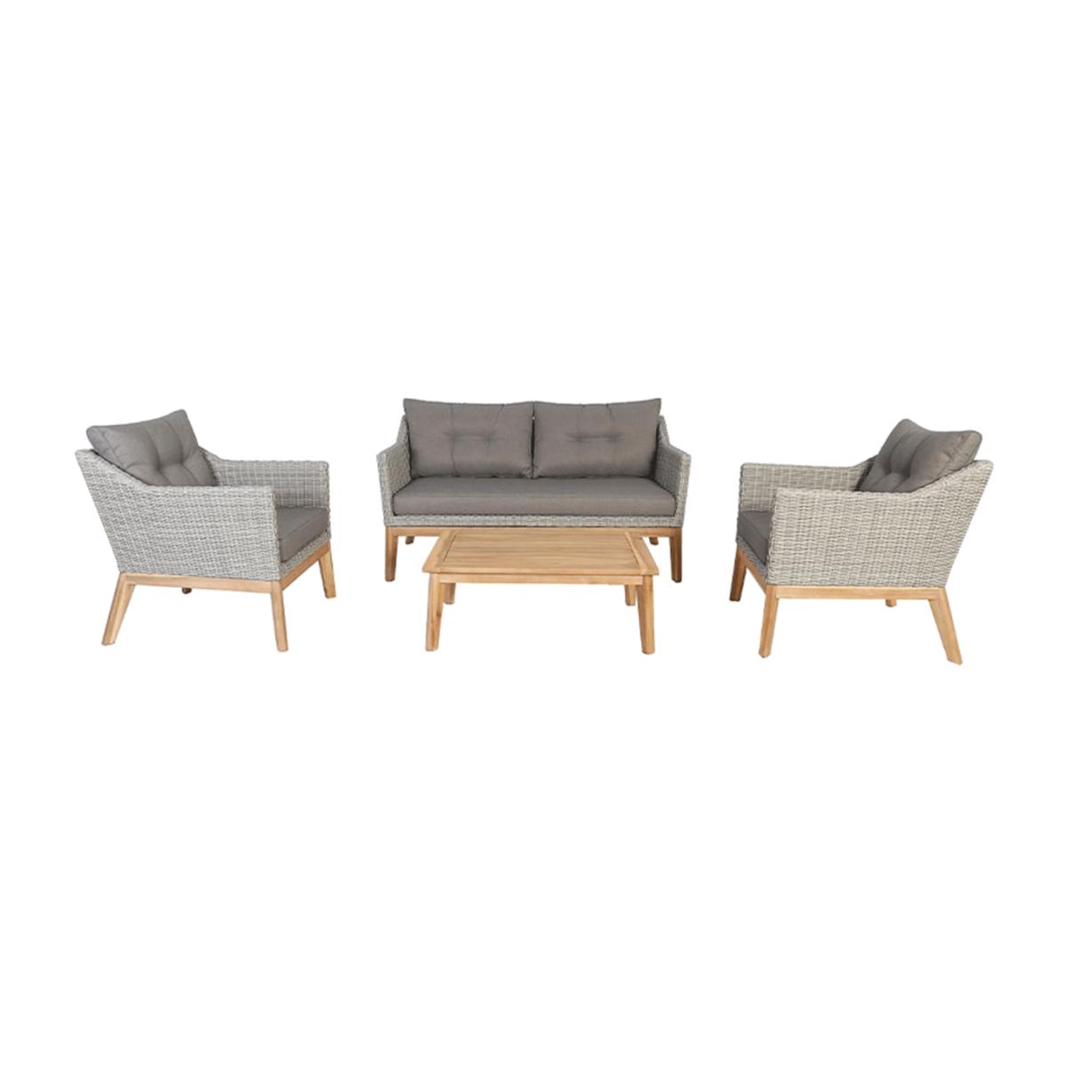 Design. Durable and weatherproof to ensure a long-lasting, quality addition to your garden, the Panama Garden Lounge Sofa Set is not only practical it is incredibly stylish too. The unusual yet attractive combination of synthetic rattan and Acacia wood, accessorised with comfortable grey cushions and completed with a handy coffee table, adds up to the ideal space to dine al fresco.