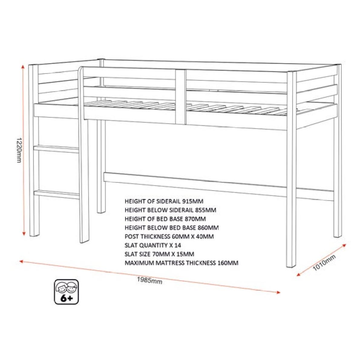 * Raised design creates space underneath * Guard rails and ladder for added safety * Modern finish suits various room styles The Panama Mid Sleeper Bed Frame is a clever way to make the most of your child’s bedroom. Its raised design opens up the space underneath, giving you room for storage boxes, a play area or even a cosy reading corner. With a modern finish and clean lines, it fits easily into a range of interiors, from playful to pared-back. Guard rails around the sleeping area and a secure ladder offer peace of mind for bedtime routines. Whether you're refreshing a room or planning a new setup, this bed brings together style and practicality in one neat package. Available in a choice of colours to suit your space.