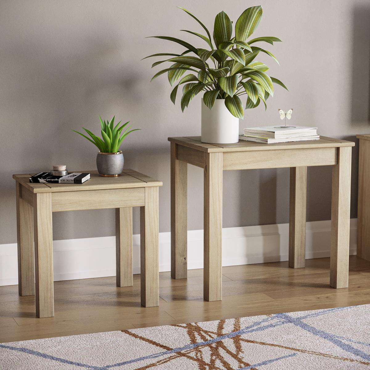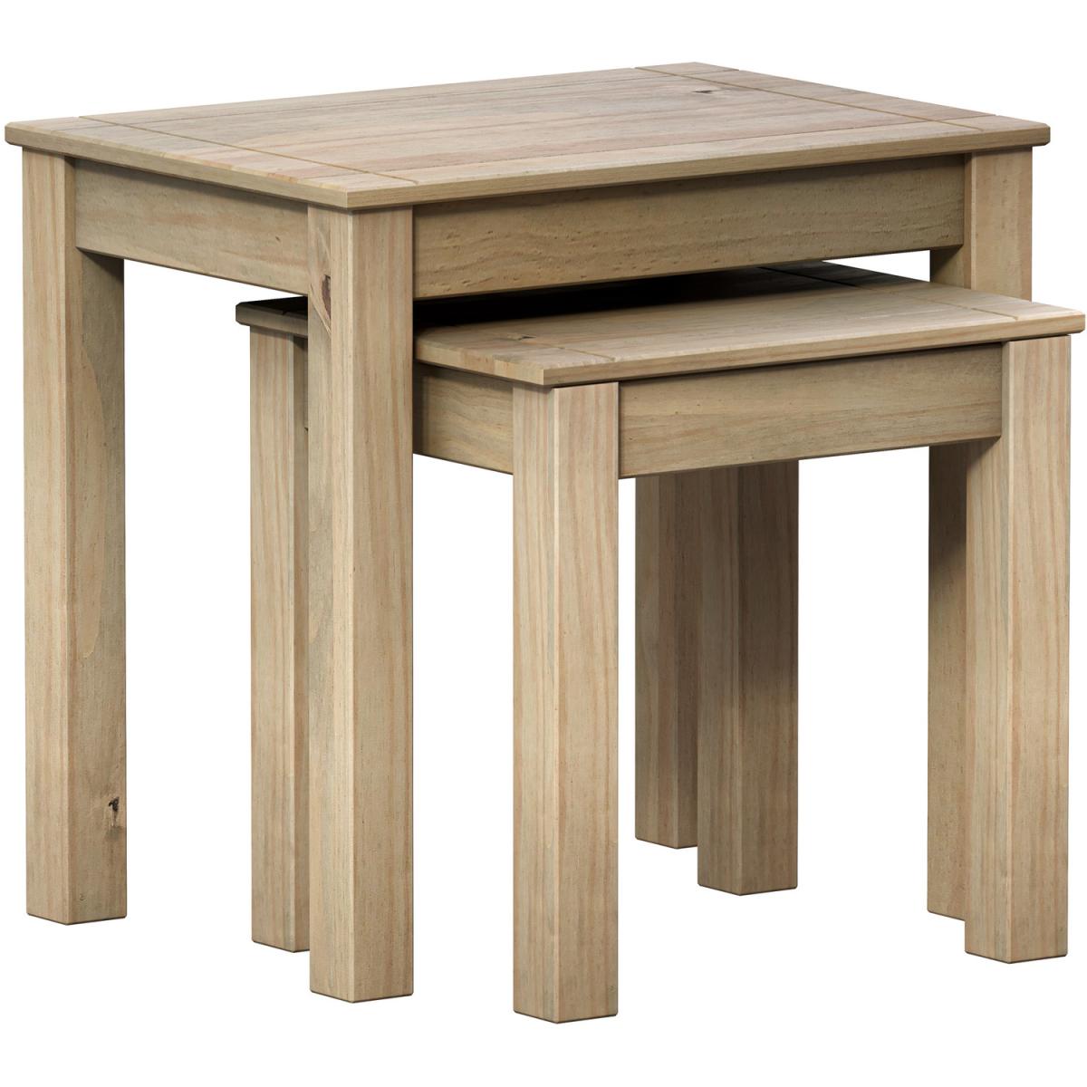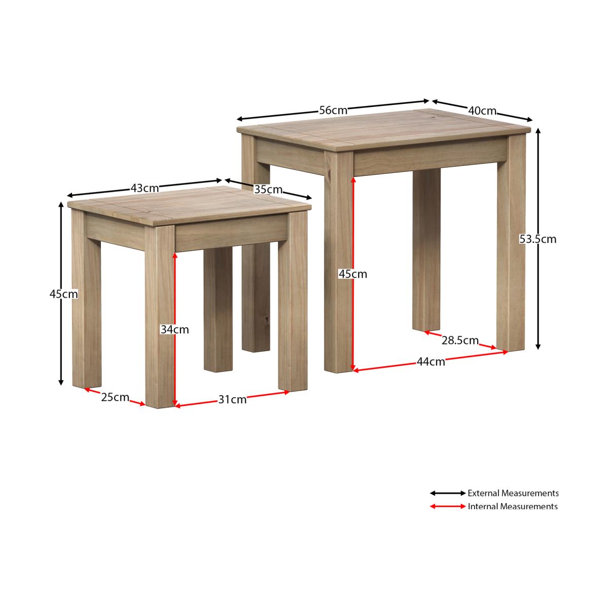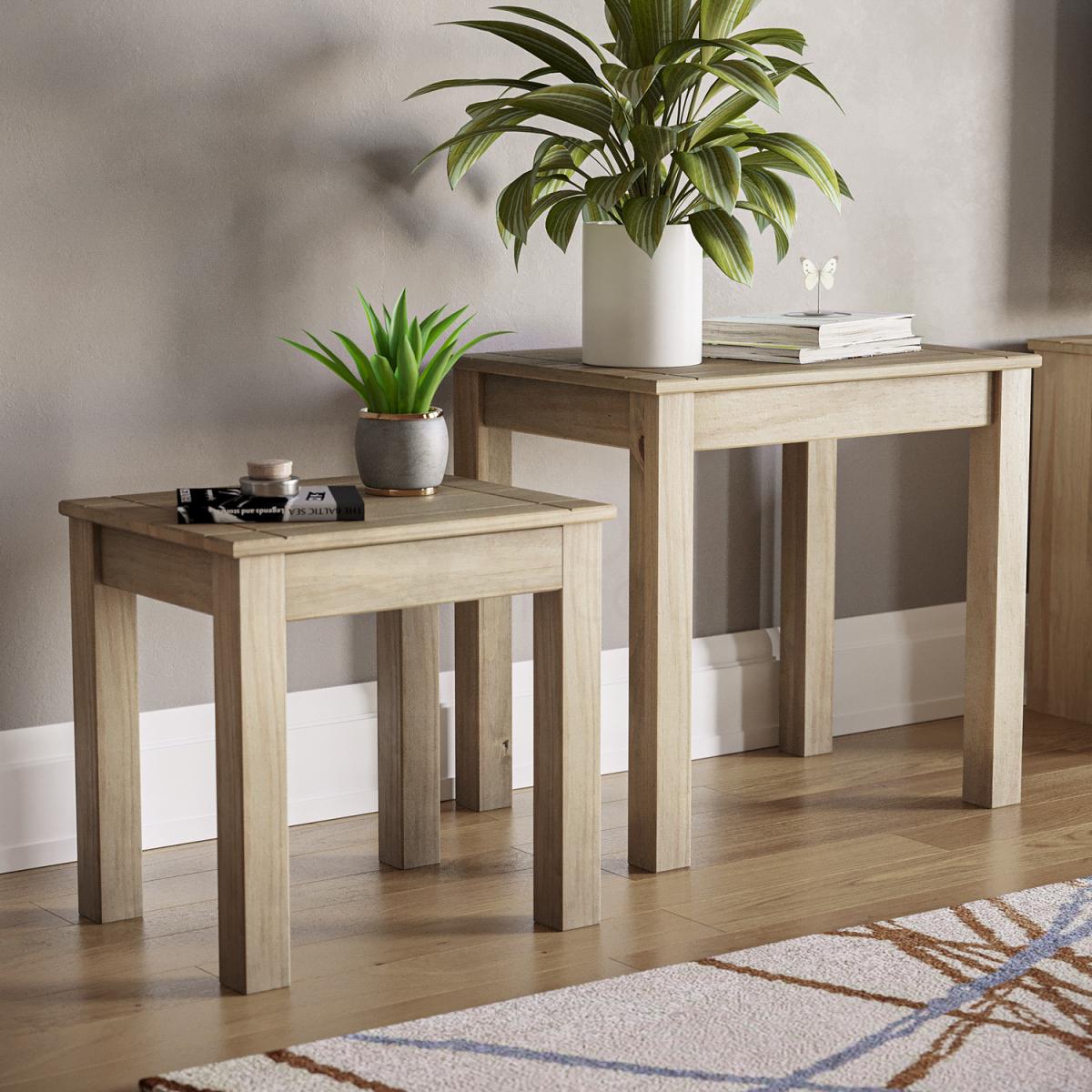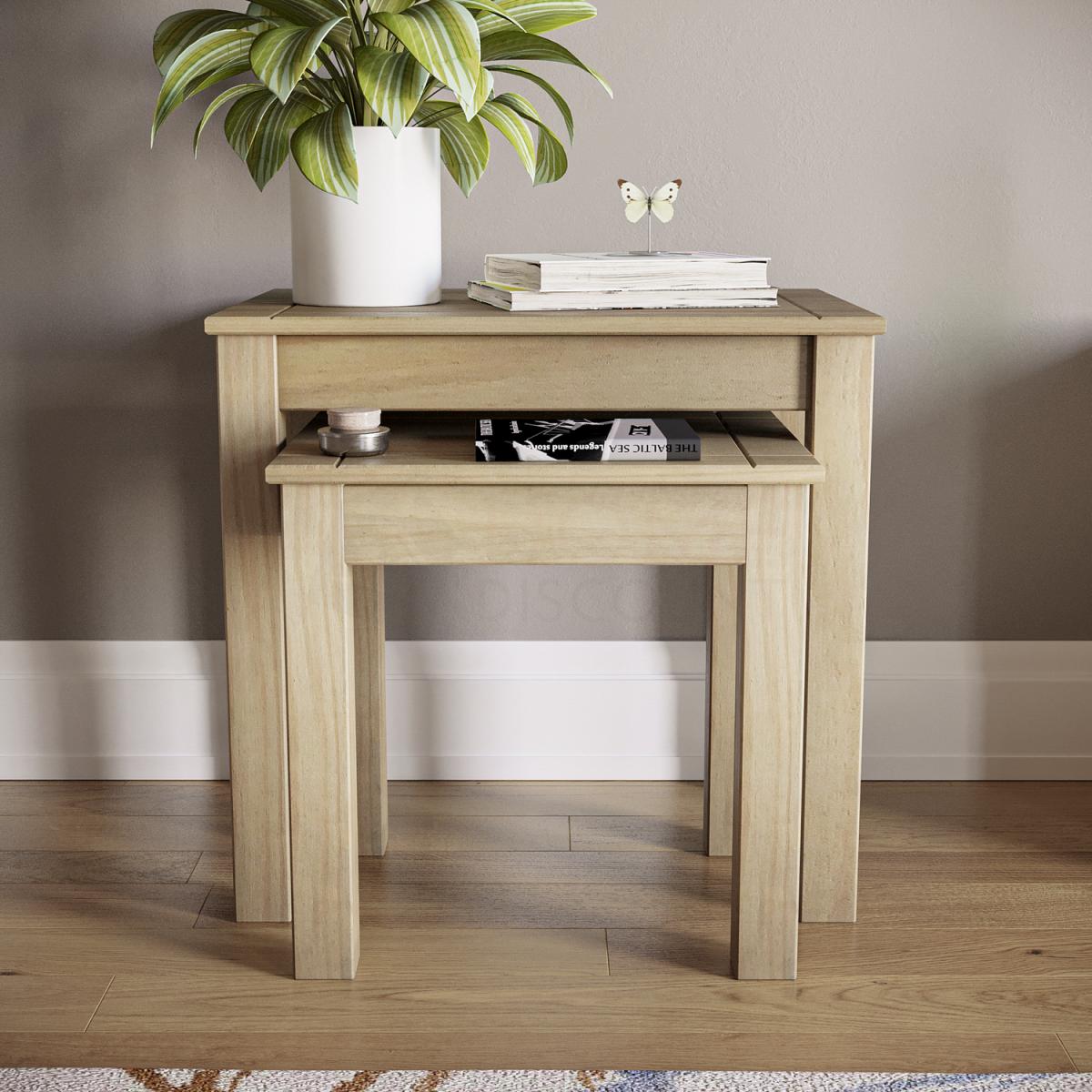 This stunning new product with a modern stylish design, the Panama Nest Of 2 Tables, is a great addition to any room in your house. The classic design is built using durable, solid pine with a natural oak wax finish. A versatile and space-saving set, these nesting tables have been finished with stunning unique touches including carved tabletops. This nest of tables can be used as a display surface for decorative pieces such as photographs and ornaments or more practical items such as a lamp.