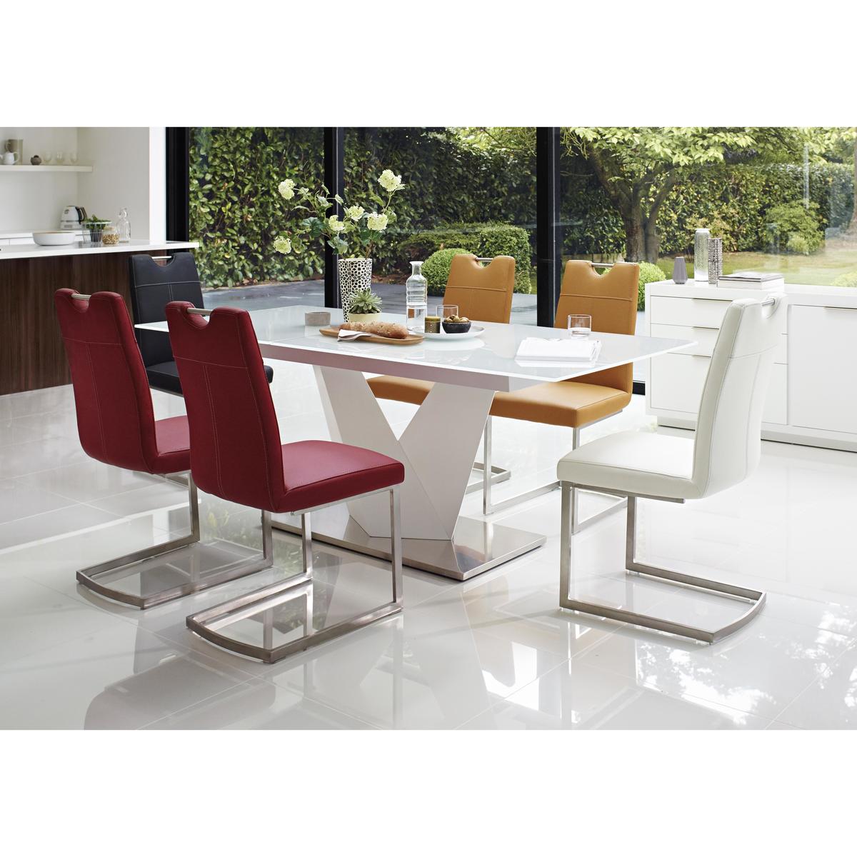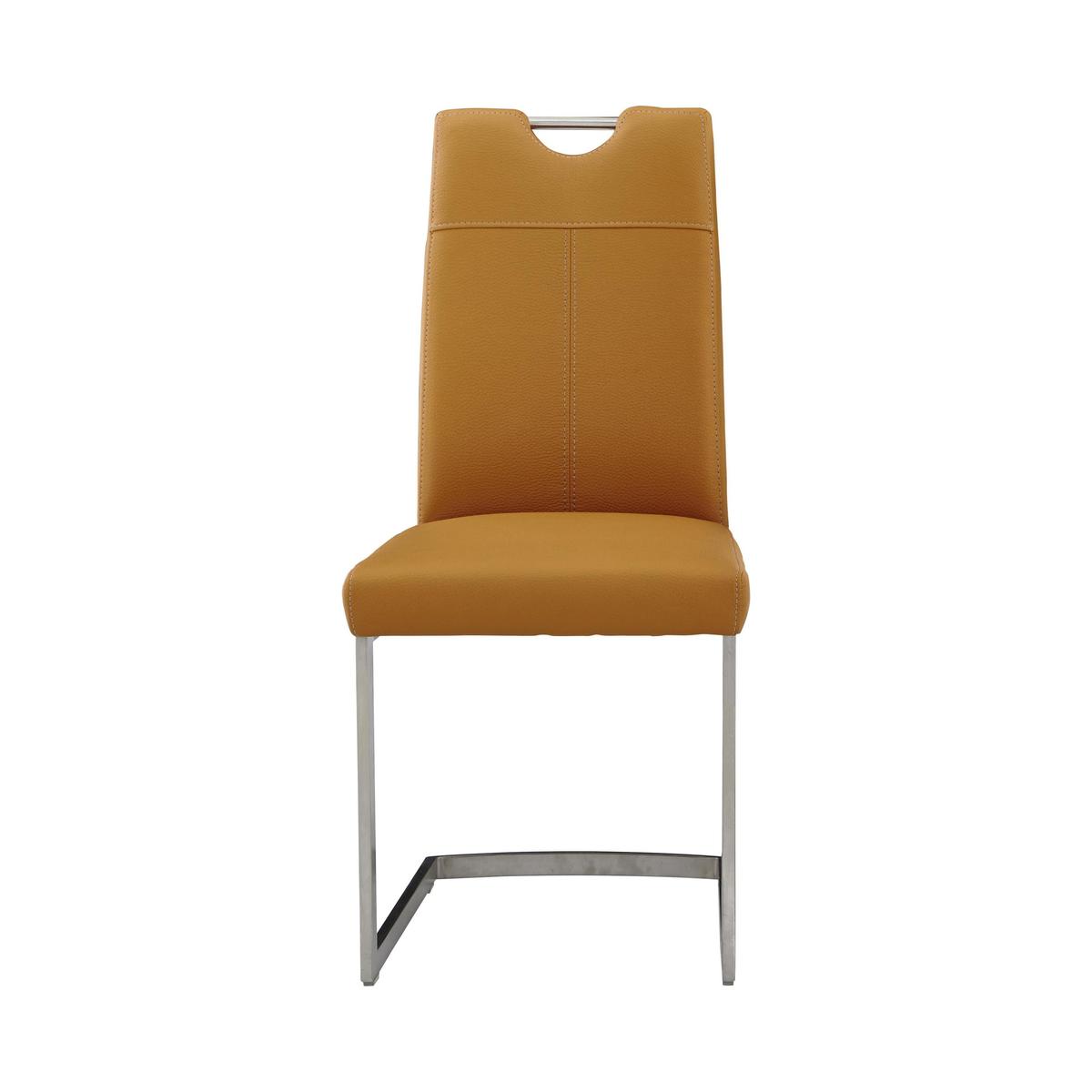 Faux leather upholstered dining chair. Modern design with brushed stainless steel cantilevered base. Easy to move, thanks to integral handle. Fully upholstered in faux leather with attractive feature stitching. Available in six contemporary colours – black, white, mustard, taupe, green or red. An ultra modern, ultra stylish choice
