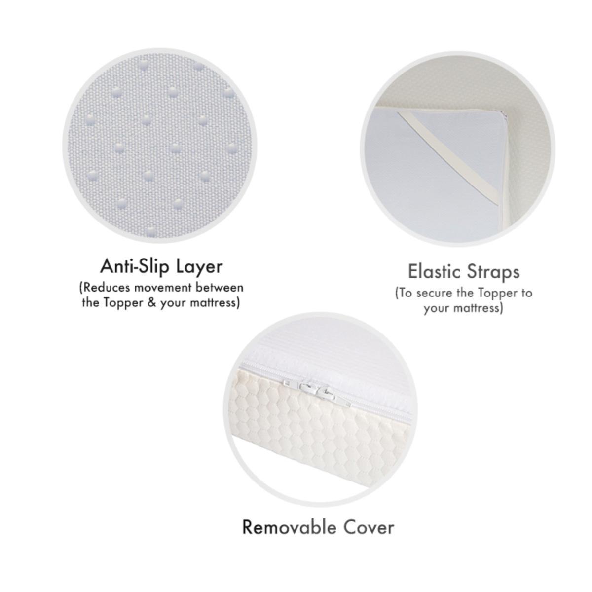 Indulge in pure luxury for an effortless night's sleep with The Panda mattress topper, the most advanced memory foam mattress available. Featuring layers of temperature regulating Hydro Foam, the Topper helps to prevent overheating in the night by incorporating minute capsules of cooling gel into the 3rd generation memory foam, whilst providing support where you need it for ultimate comfort. It includes a removable, washable cover that is expertly crafted from environmentally friendly bamboo fabric. Not only does bamboo use less water to grow, it is naturally hypoallergenic, suitable for even the most sensitive skin, and twice as soft as cotton with a cashmere-like feel. Elastic straps attached to each corner of the topper make it seamlessly aligned with all types of mattresses, whilst the anti-slip layer at the base boasts micro-silicone grips embedded within the entire base to prevent any unwanted movement between your mattress and the Topper.