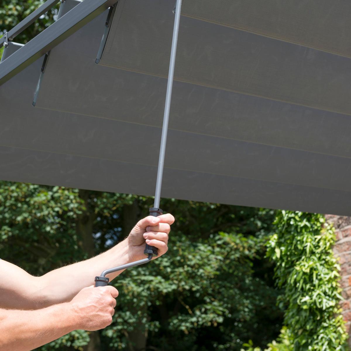 This stunning Pandora Pergola adds an extra sheltered space to your garden. Boasting a modern stylish design, this pergola is crafted from aluminium and steel making it durable and strong. The textaline allows rain to pass through this slatted multi-directional roof. * Check fixings regularly to ensure tightened* Place in a semi-secluded position