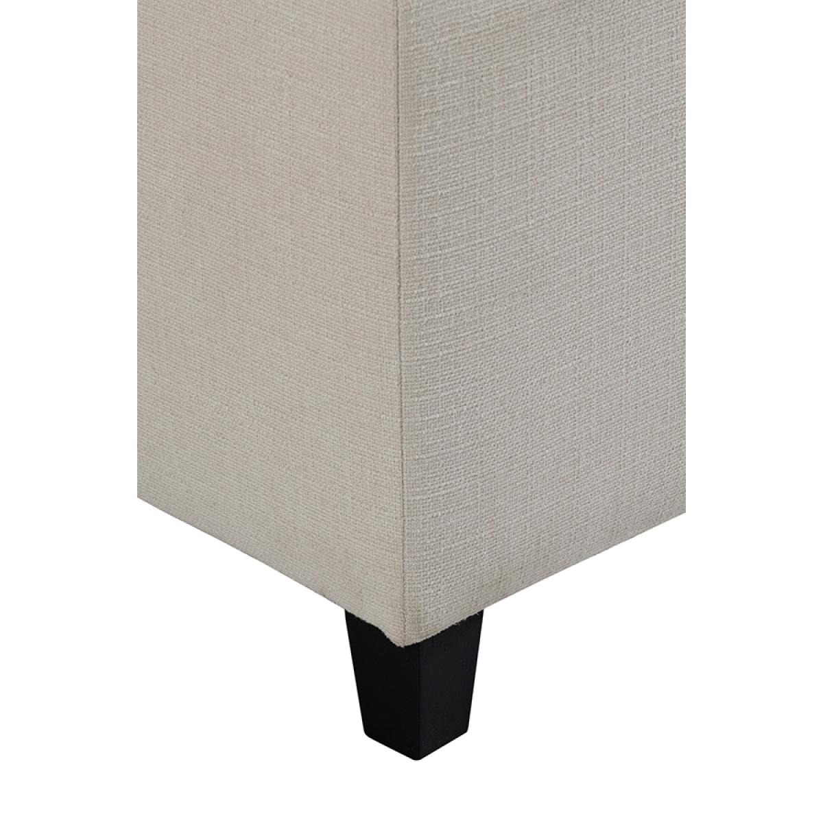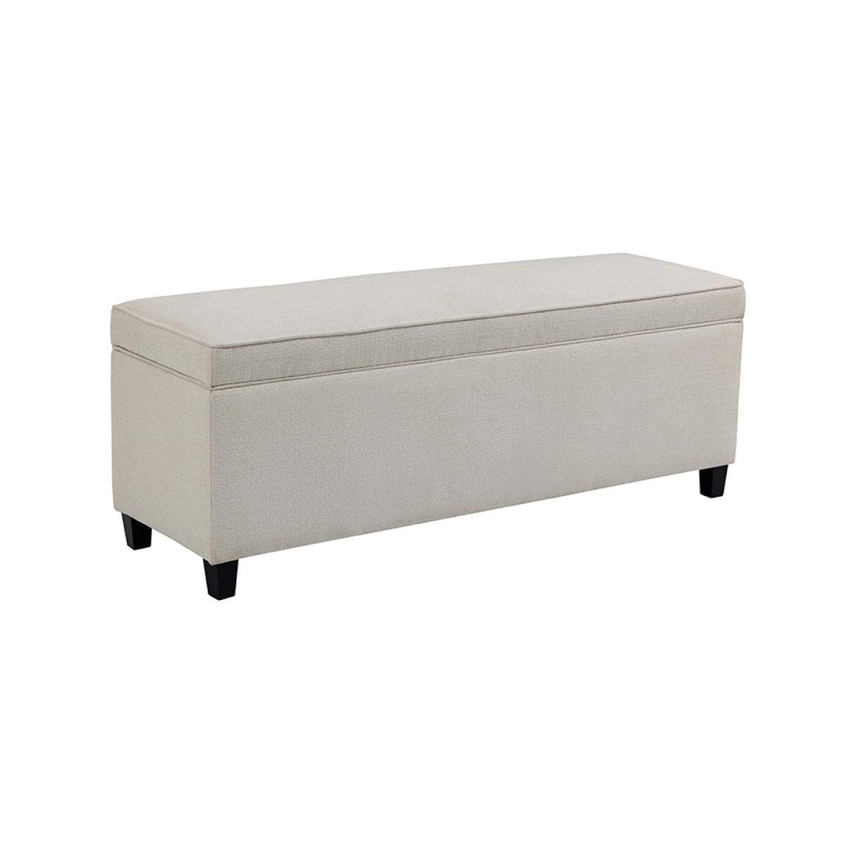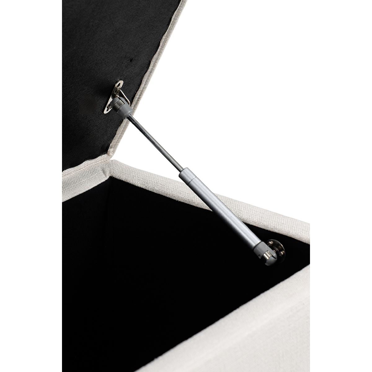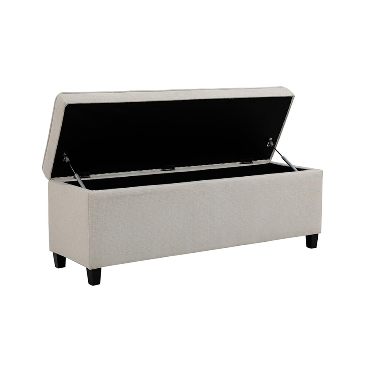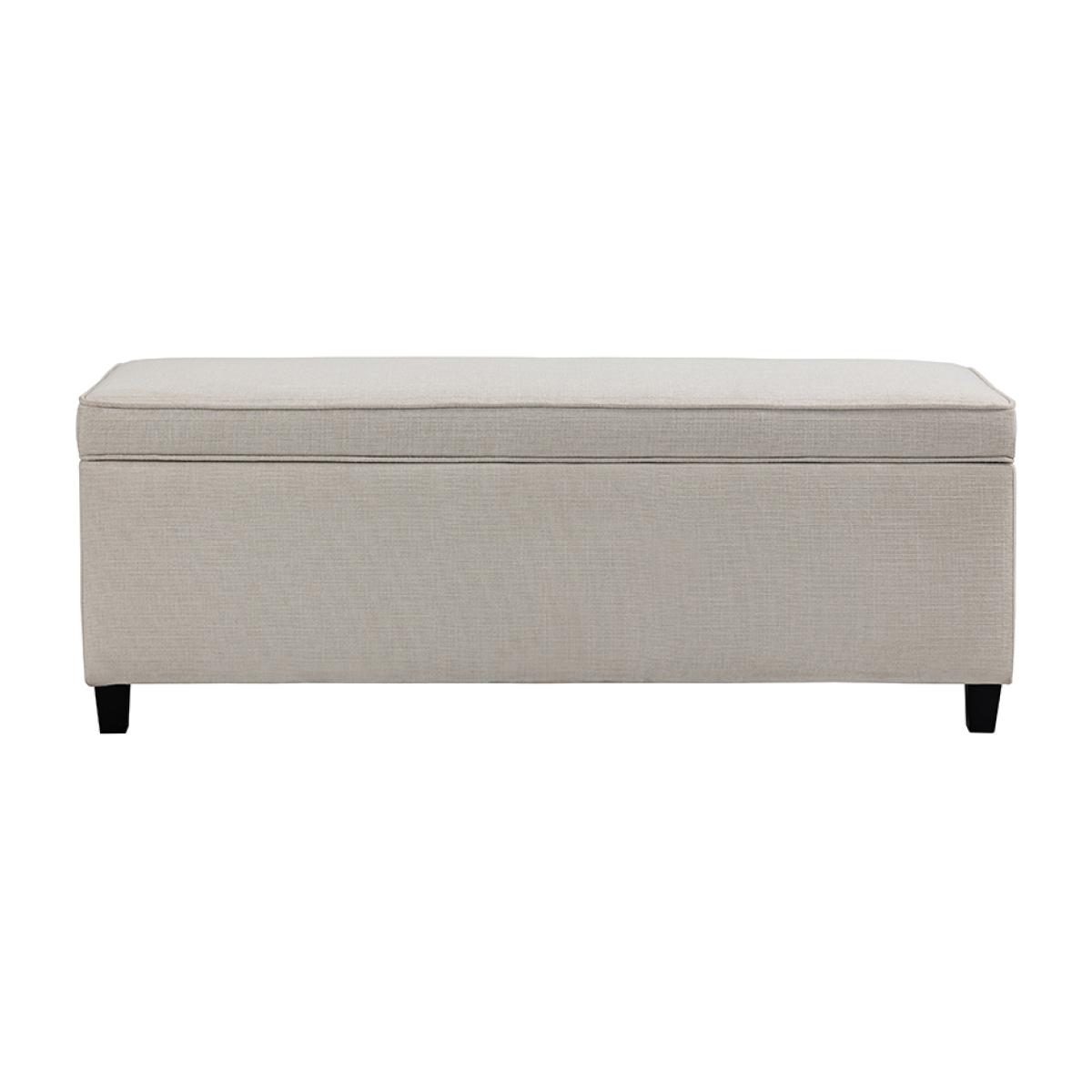 Timeless flip-top ottoman with generous internal storage. Gas lift stay arms. Black lined interior. Practical and durable linen effect fabric with a soft, tactile feel. Black-stained ash feet. Ideal for storing bedlinen, throws and cushions. Delivered assembled.