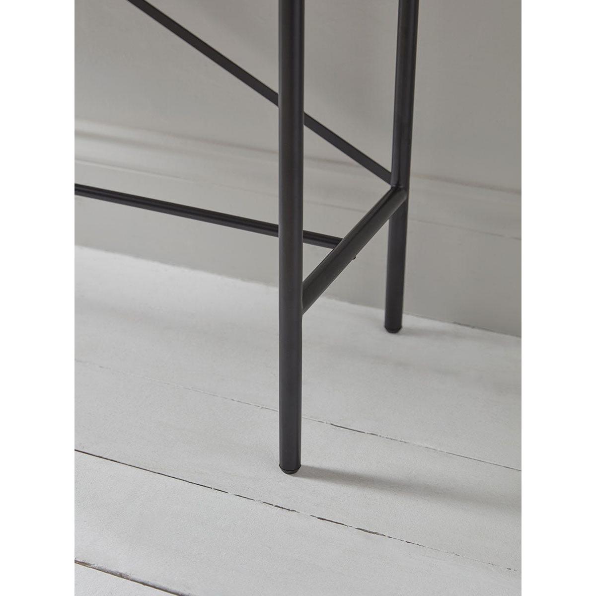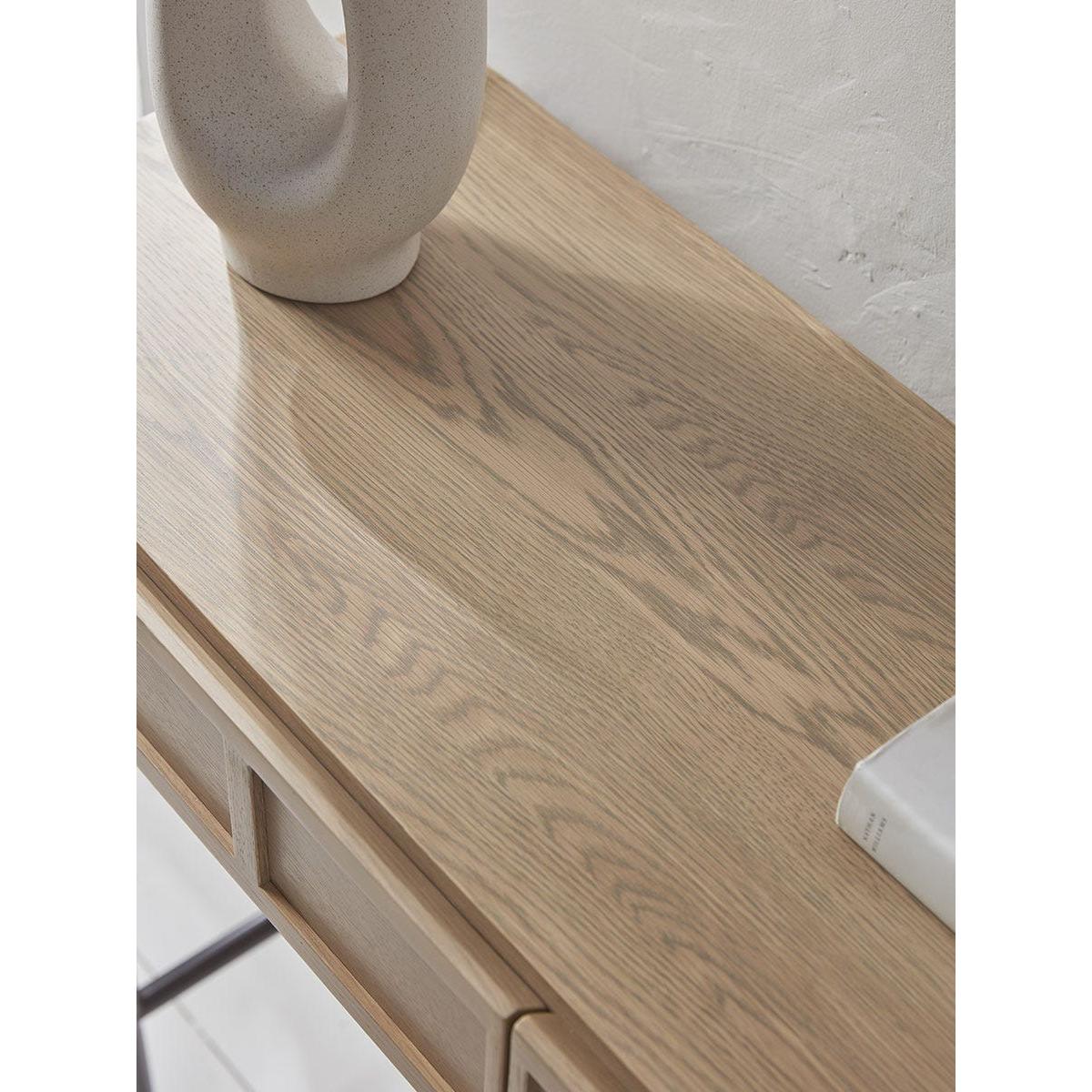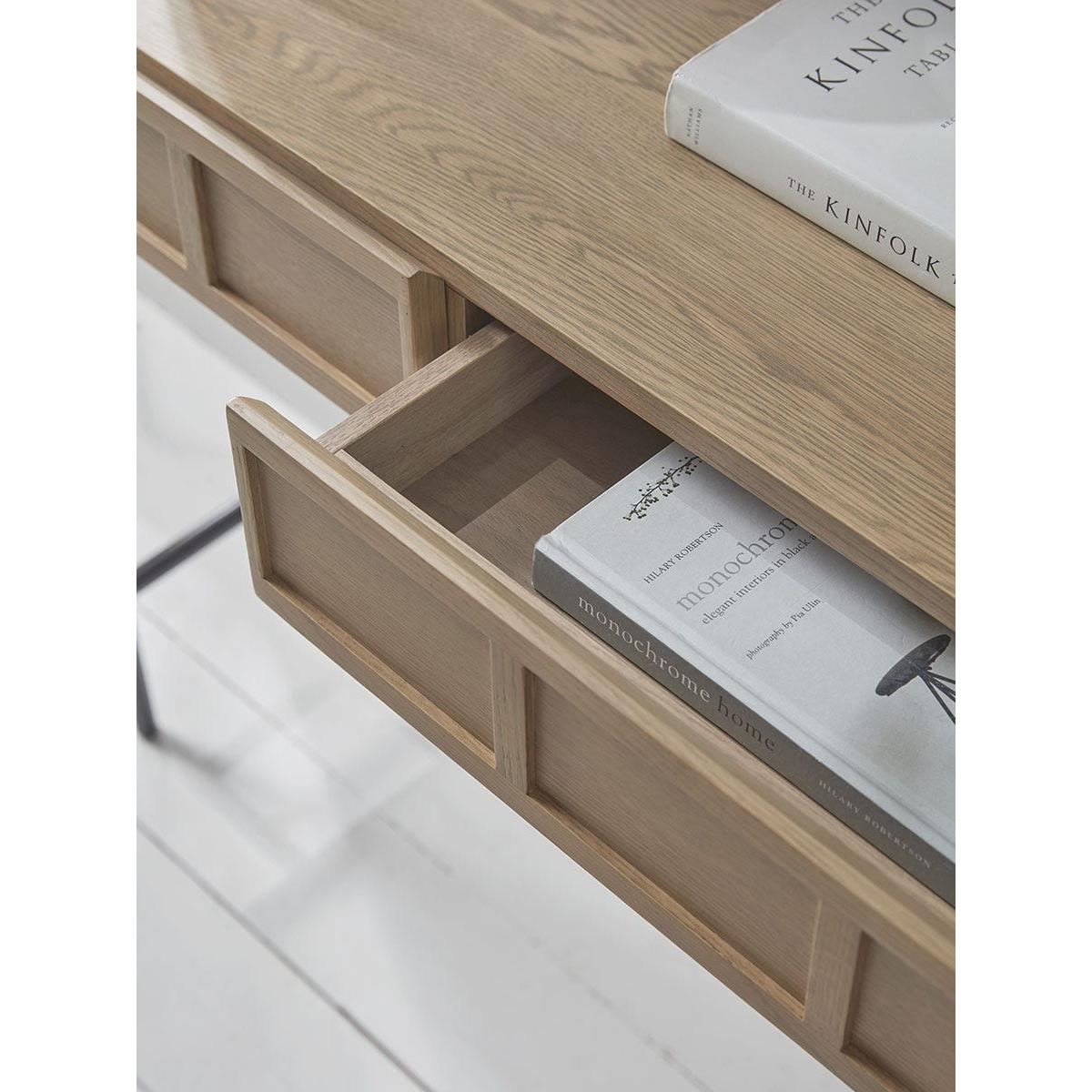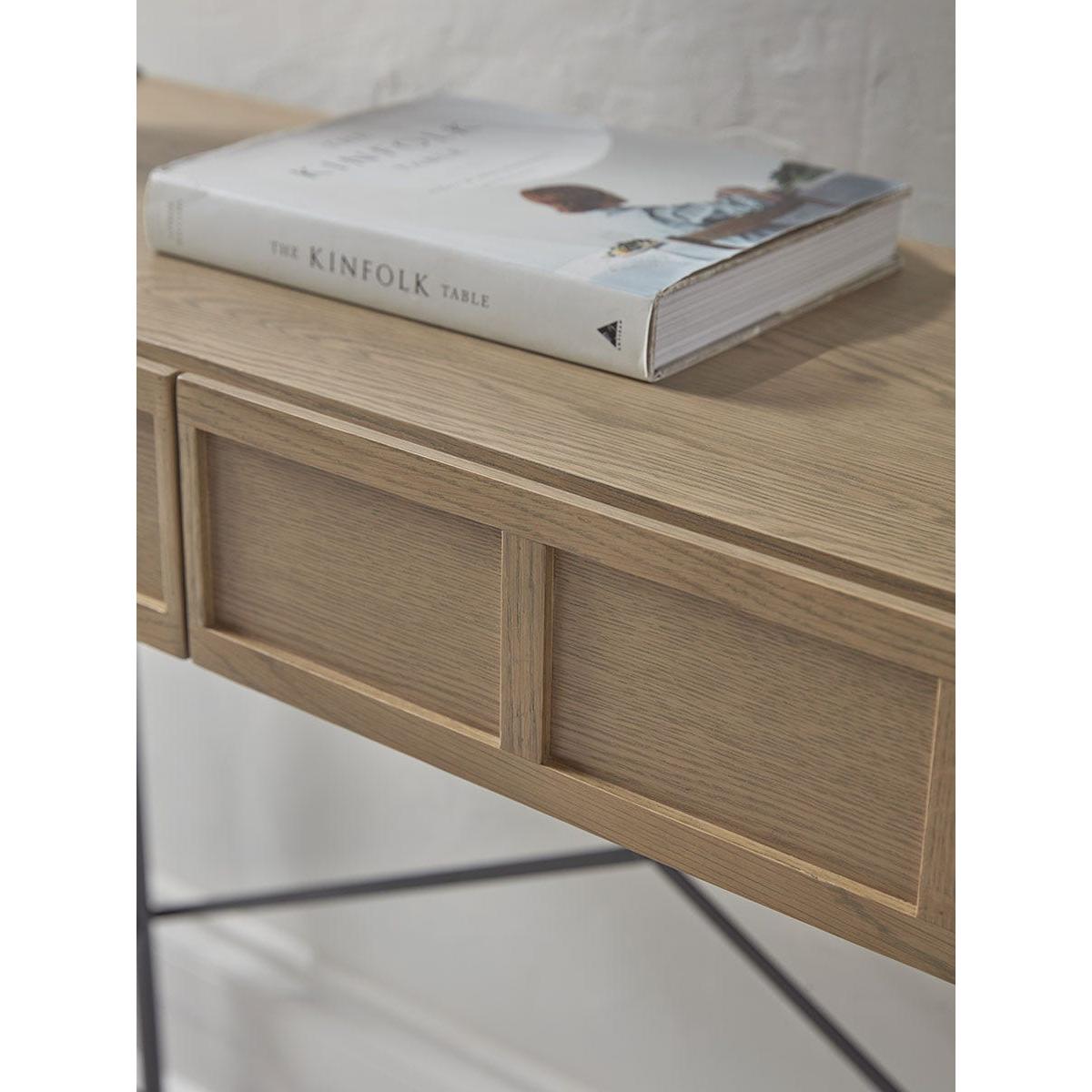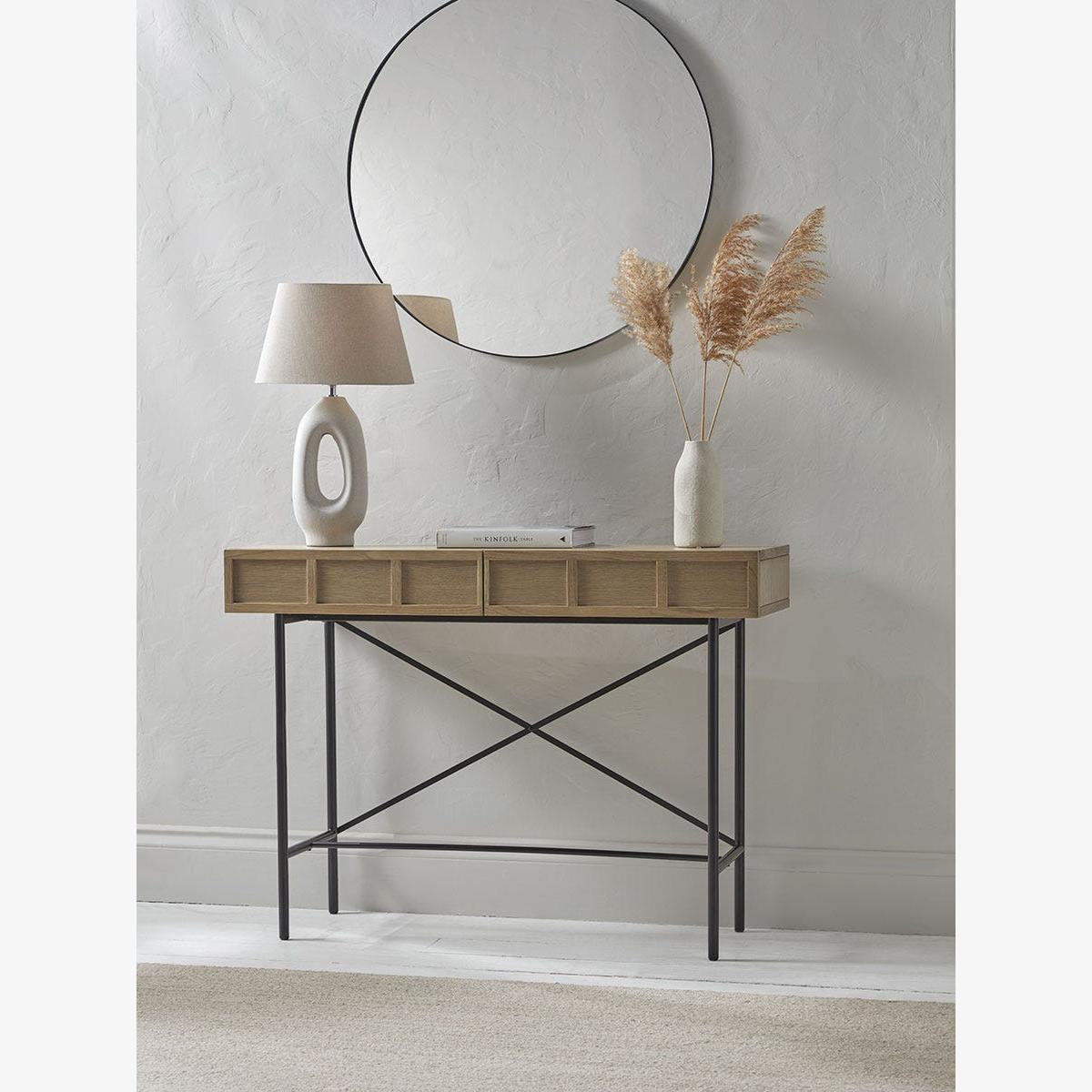 Warm wood tones pair with black metal legs to create a sleek and stylish console table. Its simple sculptural lines allow it to blend into many interior schemes, whilst its two panelled drawers add an element of modern styling to your space.
