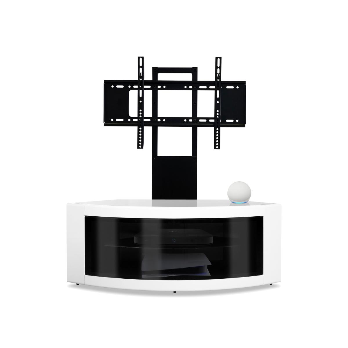 Suitable for TV screens up to 50", the Pangea TV cabinet is a stand for any corner. Designed to wrap into any corner, the Pangea TV stand has matching smooth curved edges for creating a contemporary minimalist look. The rear panel comes with generous ventilation to disperse any excess heat accumulated from your equipment. Finished in gloss black and complemented with a black top glass and two glass Beam-Thru swing doors with infrared compatibility, the Pangea TV unit maintains a very sleek appearance whilst hiding away equipment from view. The best feature of the Pangea TV cabinet is the compatibility with the Screen Mounting Arm that transforms the cabinet into a cantilever style system to give your TV a floating appearance. With fully integrated cable management system and the built-in screen secure system, the Pangea corner TV stand will have all your needs covered.
