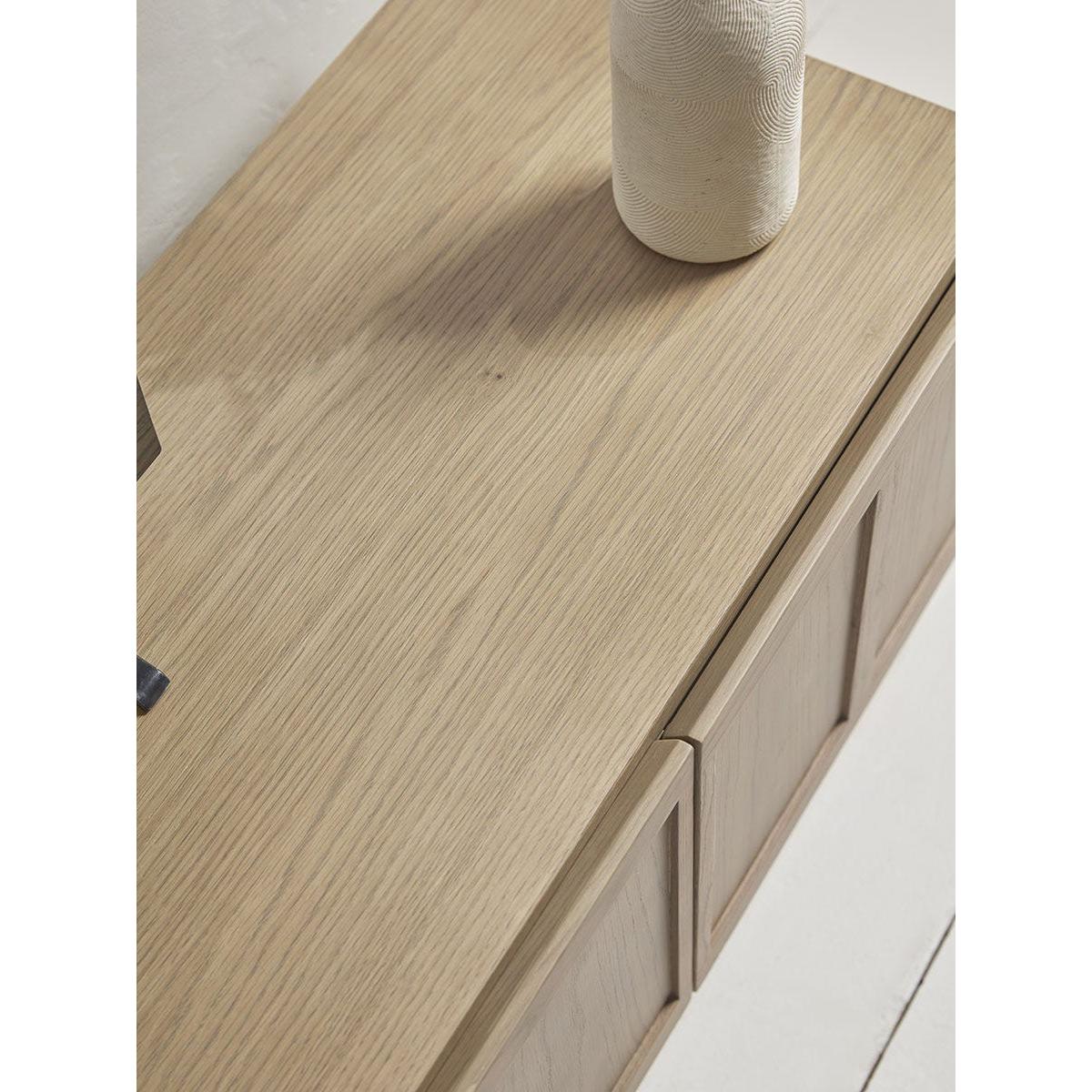 Simple and sleek lines are paired with panelled door fronts to create a media unit that adds a contemporary feel to your space.  Warm wood tones contrast with the black metal legs, allowing the wood grain to be enhanced. Its neutral scheme makes this piece ideal for adding a modern touch to many different interior styles. Also available as a console table.