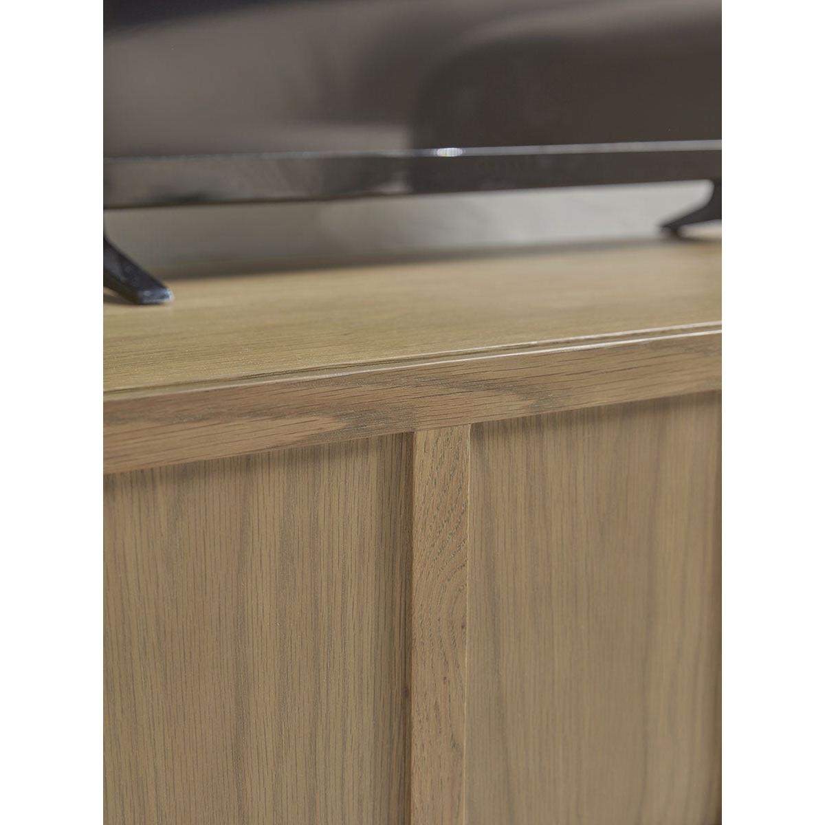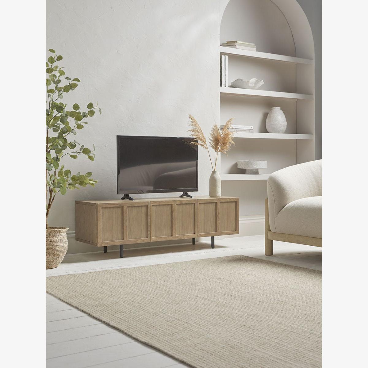 I’m a fan of this panelled unit because its subtle front detail adds texture without overwhelming a room, and the oak-look finish feels fresh yet timeless. Its slim, black metal legs lift the piece off the floor, helping smaller spaces appear airier while still offering plenty of concealed storage for games, remotes and cables. It works equally well in Scandi, mid-century or modern farmhouse schemes - just keep surrounding tones neutral and layer in natural materials. On the surface, try a low vase of dried grasses or a small table lamp at one end, then balance with a slim stack of coffee-table books. Tidy cables behind and use the cupboard space to stow away any media clutter.