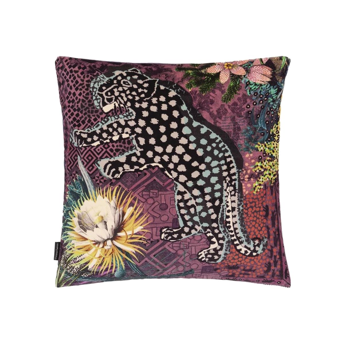 This square cushion by Christian Lacroix Maison features a striking panther graphic in mid-leap. The playful collage of flowers adds a decorative touch to this designer cushion, which is made of luxurious velvet and has a swirling marbleized satin cotton reverse. The cushion is digitally printed for a high-quality finish. Christian Lacroix is the eponymous fashion house by the world-renowned French designer. Lacroix's designs combine luxury and insouciance. He prefers artisanal trades, fringe, bead, and embroidery. His work is characterised by a strong sense of colour, and patterns mix.