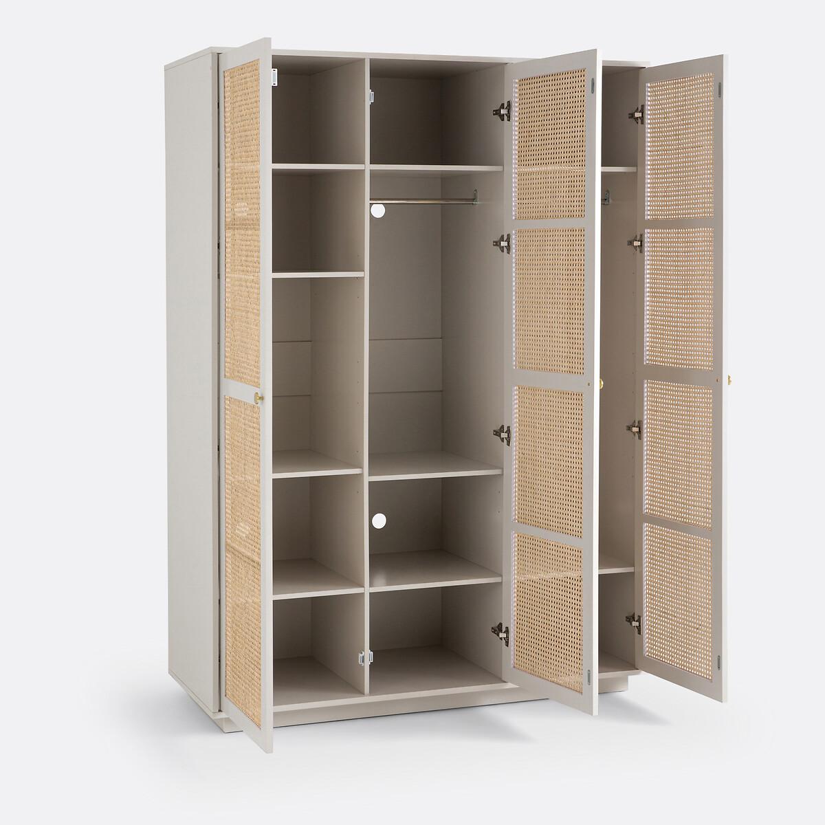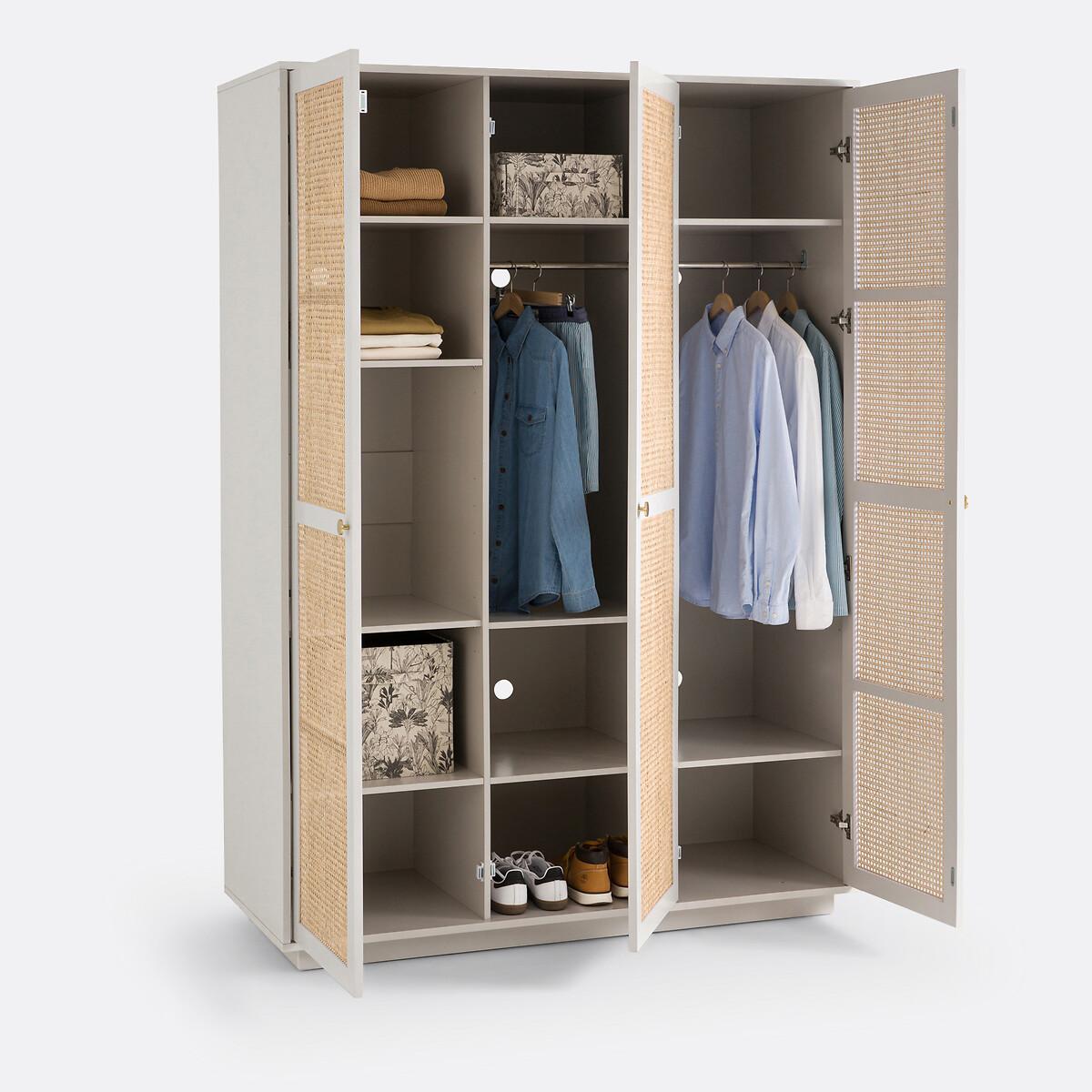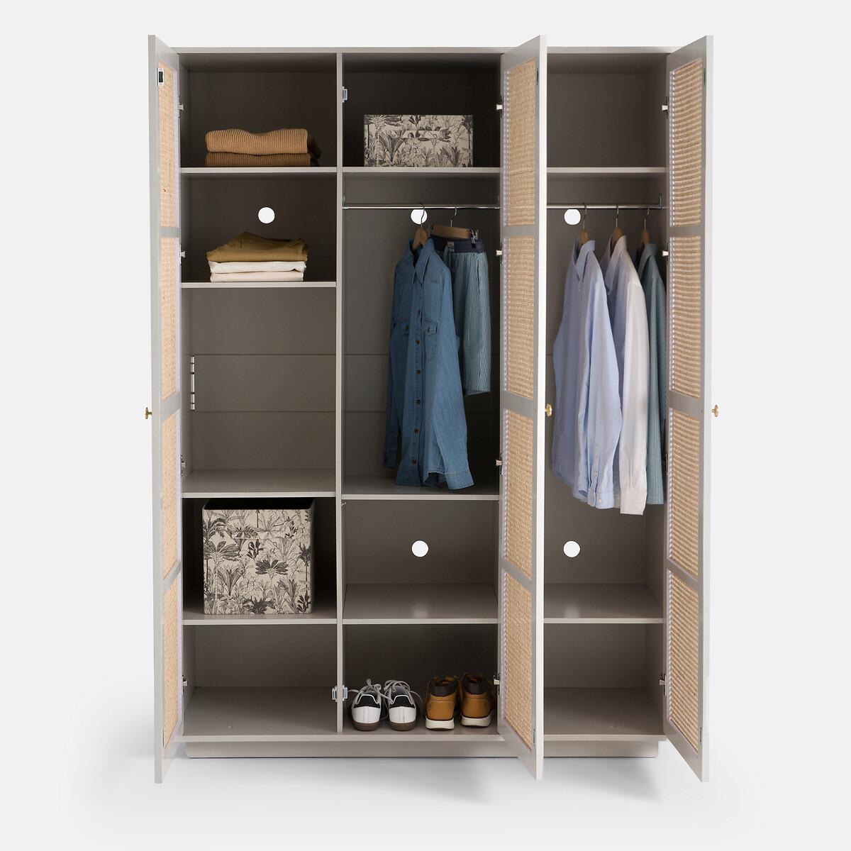 A design with structured straight lines and a hint of Bohemian spirit: the Paola 3-door wardrobe combines MDF wood, solid pine and rattan canework. Its wardrobe and shelves can accommodate clothes and fashion accessories to optimise your storage. A piece of furniture as elegant as it is functional for the bedroom. Designed by La Redoute Interiors. Product Details • 3-door triple wardrobe • 5 shelves on either side • In the centre : 1 half-hanging space and 3 shelves • Fixed upper and lower shelves, other shelves adjustable in height on 3 levels • Structure in lacquered stained MDF • Doors in lacquered stained MDF and solid pine and natural finish rattan canework • FSC® certified wood • Stainless steel clothes rail • Steel handles with brushed brass finish • Soft closing closure for smooth closing • 2 wall fixings includedDimensions. Overall • Width: 147.9cm • Height: 206cm • Depth: 57cm • Weight: 140.75kg. Usable space • Height of hanging section: 101.5cm • Shelves : L47.3 x H1.5 x D52.7cmDelivery:. Assembly required. Available for home delivery. Note! Please check that all access points are large enough to accommodate your delivery (doors, stairs, lifts). • WOOD FROM SUSTAINABLY MANAGED FORESTS. FSC® certified wood comes from forests that are environmentally, socially and economically well managed. Dimensions and weight of parcel4 parcels • L212 x H12 x D63.5cm. 40.45kg • L210.5 x H9 x D65cm. 40.6kg • L161.5 x H10 x D65cm. 36.6kg • L66 x H26 x D54.5cm. 38.7kg