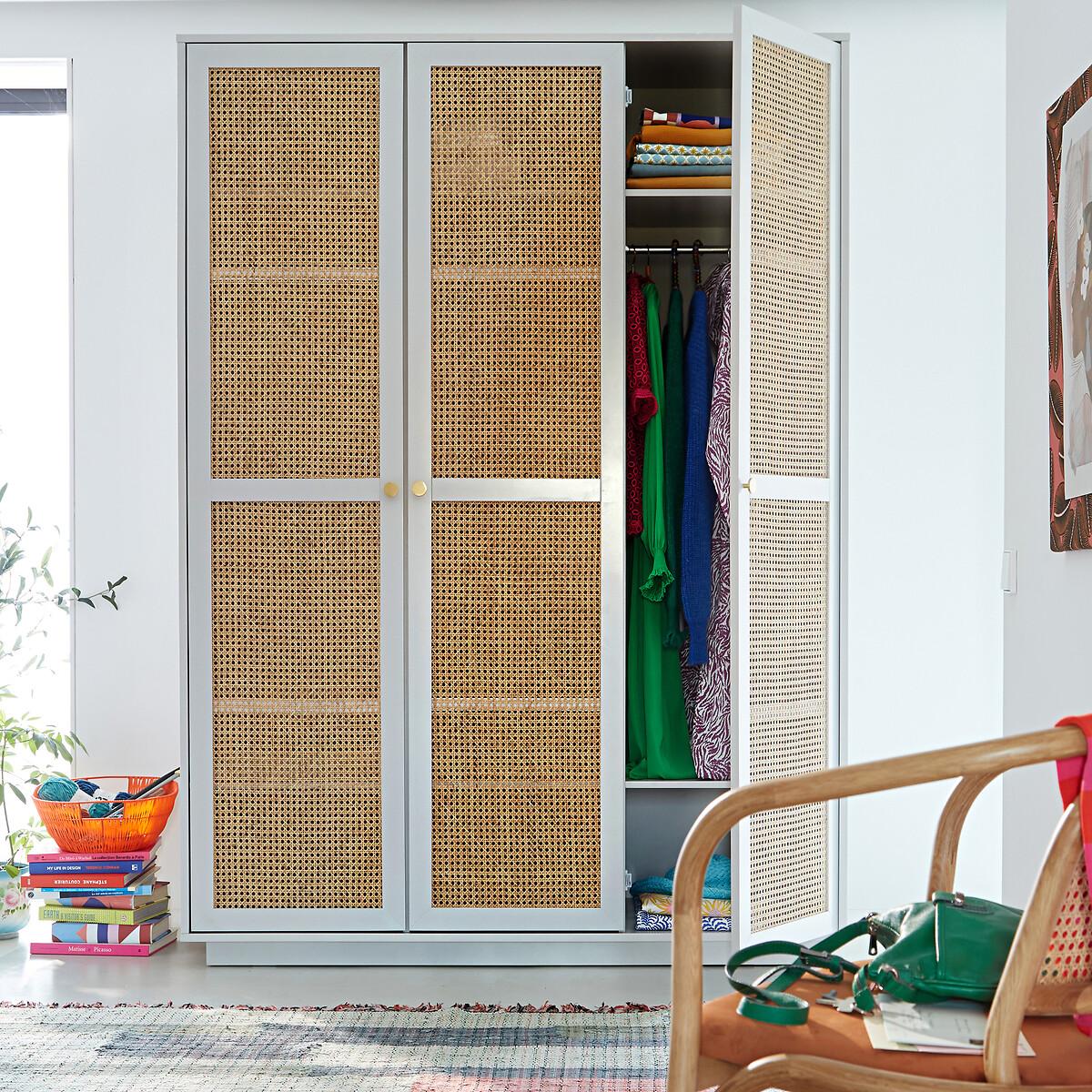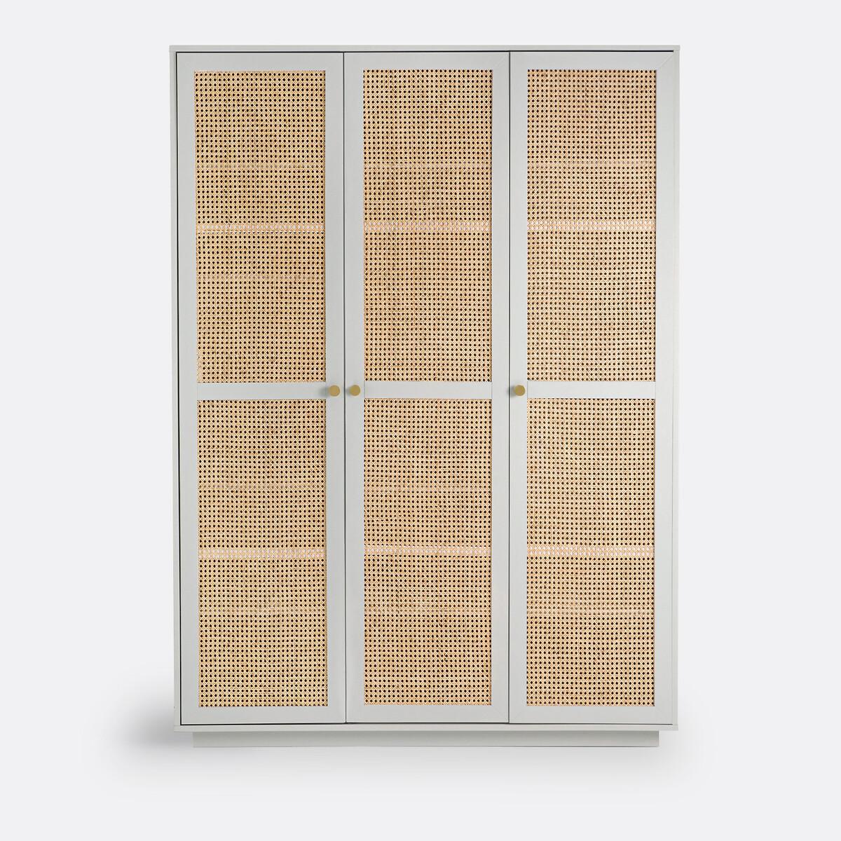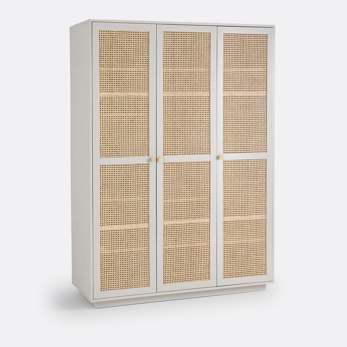 A design with structured straight lines and a hint of Bohemian spirit: the Paola 3-door wardrobe combines MDF wood, solid pine and rattan canework. Its wardrobe and shelves can accommodate clothes and fashion accessories to optimise your storage. A piece of furniture as elegant as it is functional for the bedroom. Designed by La Redoute Interiors. Product Details • 3-door triple wardrobe • 5 shelves on either side • In the centre : 1 half-hanging space and 3 shelves • Fixed upper and lower shelves, other shelves adjustable in height on 3 levels • Structure in lacquered stained MDF • Doors in lacquered stained MDF and solid pine and natural finish rattan canework • FSC® certified wood • Stainless steel clothes rail • Steel handles with brushed brass finish • Soft closing closure for smooth closing • 2 wall fixings includedDimensions. Overall • Width: 147.9cm • Height: 206cm • Depth: 57cm • Weight: 140.75kg. Usable space • Height of hanging section: 101.5cm • Shelves : L47.3 x H1.5 x D52.7cmDelivery:. Assembly required. Available for home delivery. Note! Please check that all access points are large enough to accommodate your delivery (doors, stairs, lifts). • WOOD FROM SUSTAINABLY MANAGED FORESTS. FSC® certified wood comes from forests that are environmentally, socially and economically well managed. Dimensions and weight of parcel4 parcels • L212 x H12 x D63.5cm. 40.45kg • L210.5 x H9 x D65cm. 40.6kg • L161.5 x H10 x D65cm. 36.6kg • L66 x H26 x D54.5cm. 38.7kg